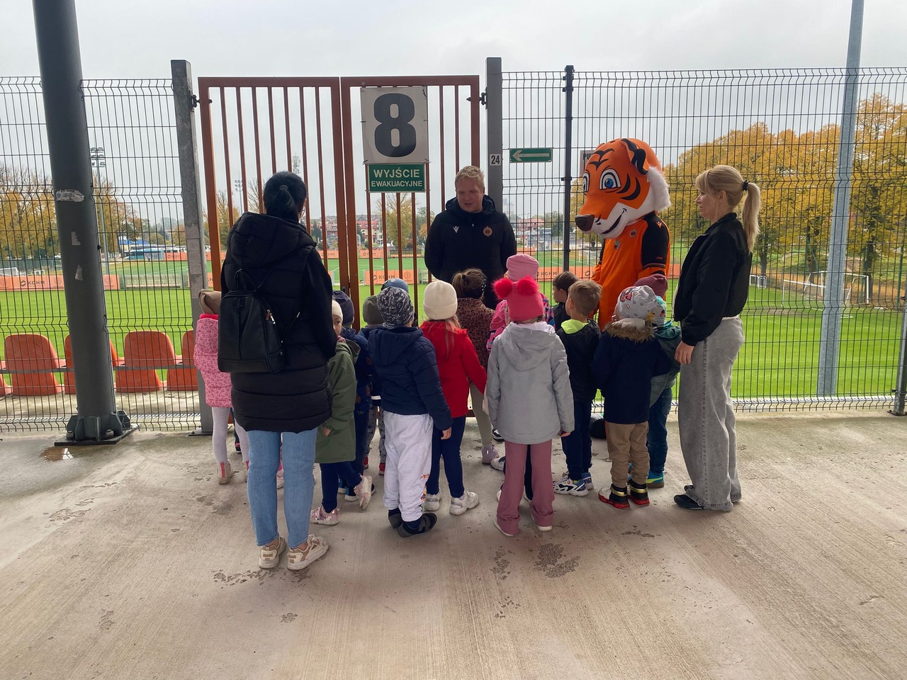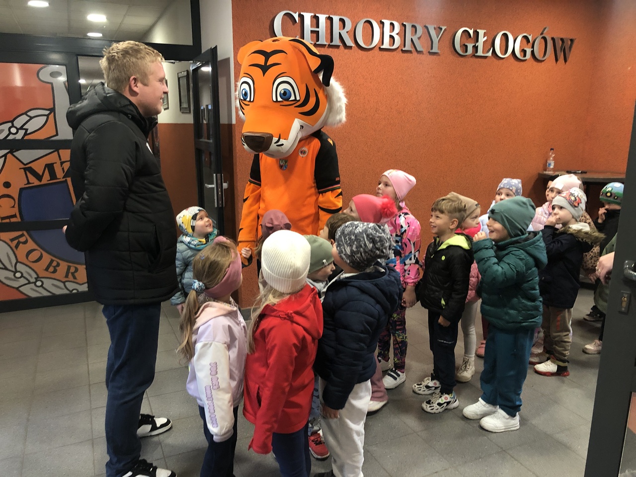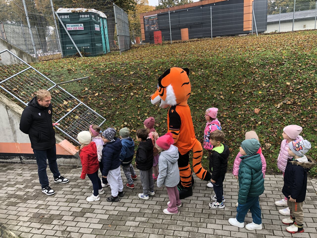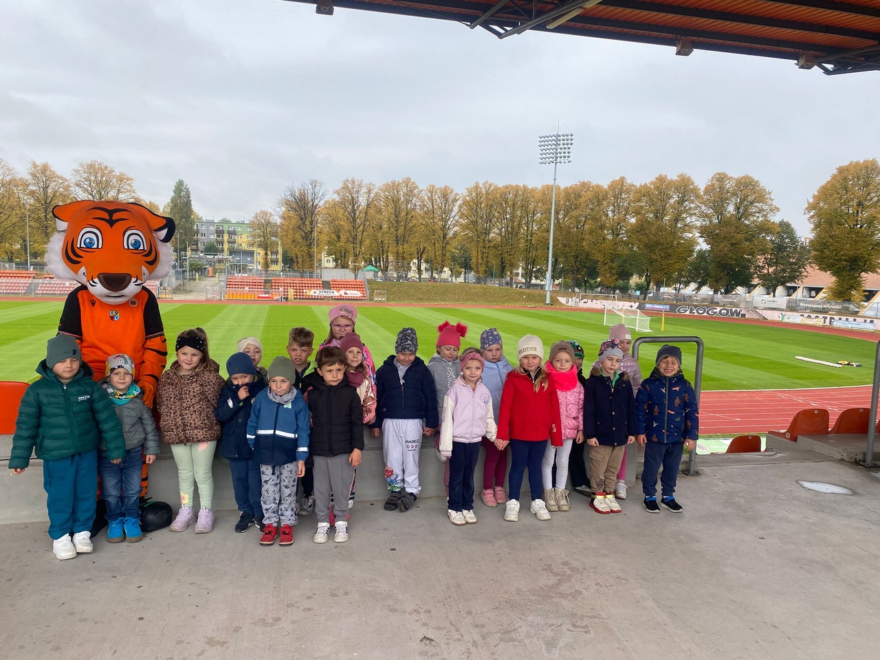 W środę, 15.10.2025 r. dzieci z oddziałów ,,Motylki” i ,,Biedronki” zwiedzały obiekty sportowe Klubu Piłkarskiego Chrobry Głogów oraz miały wyjątkową okazję wziąć udział we wspólnym treningu z trenerem Akademii Piłki Nożnej panem Pawłem Marszałkiem. Podczas spotkania przedszkolaki poznały zawód trenera, dowiedziały się, że zajęcia sportowe z piłki nożnej to świetny sposób na aktywne spędzanie czasu w gronie rówieśników, a wspólna aktywność fizyczna nie tylko sprzyja budowaniu relacji i współpracy, ale uczy wzajemnego szacunku i zasad gry fair play. Na koniec, w towarzystwie maskotki klubu – Tygryska Chrobrego, dzieci zwiedziły stadion i okoliczne obiekty sportowe.