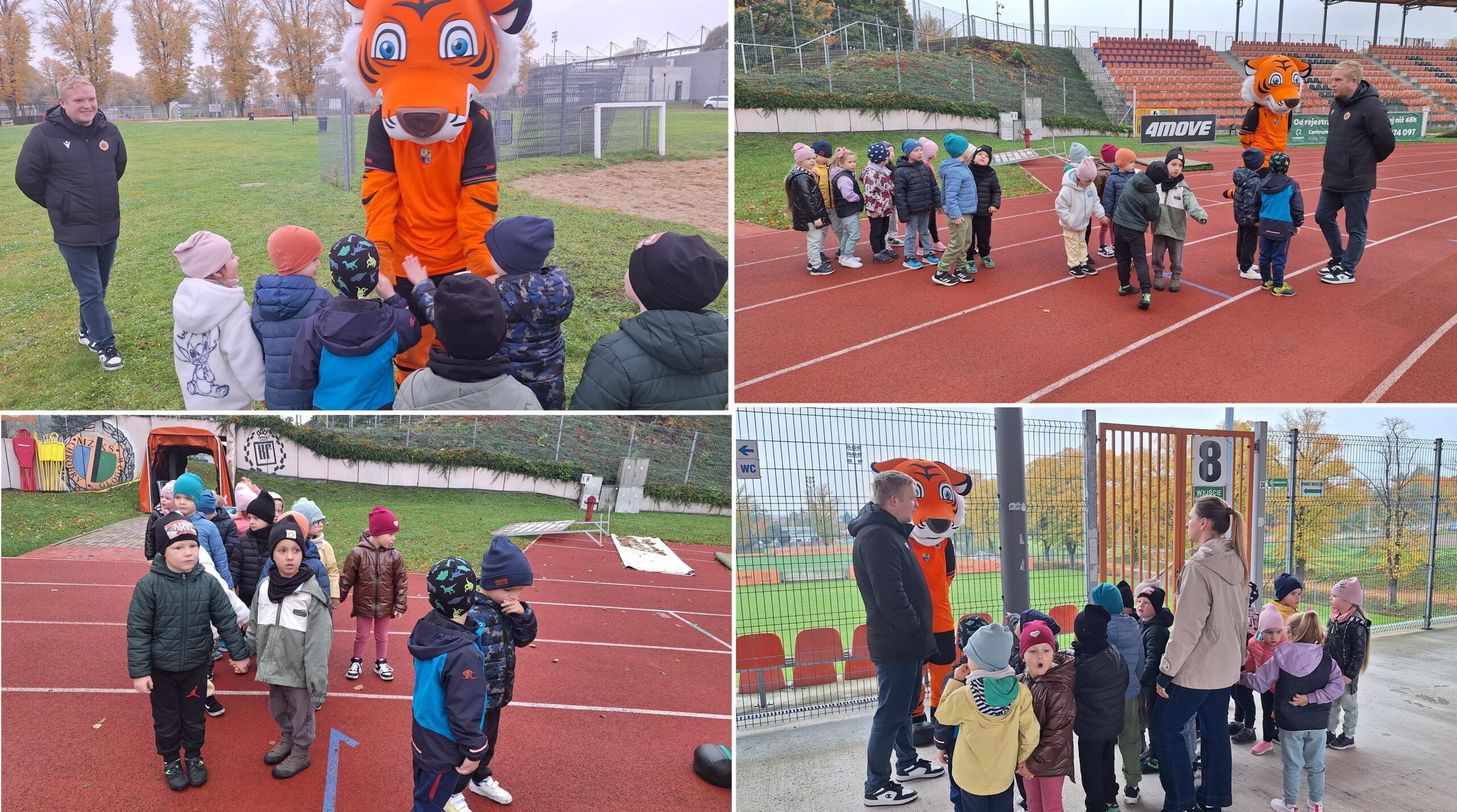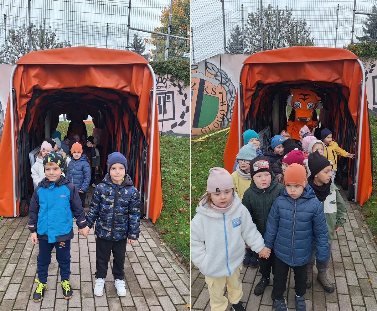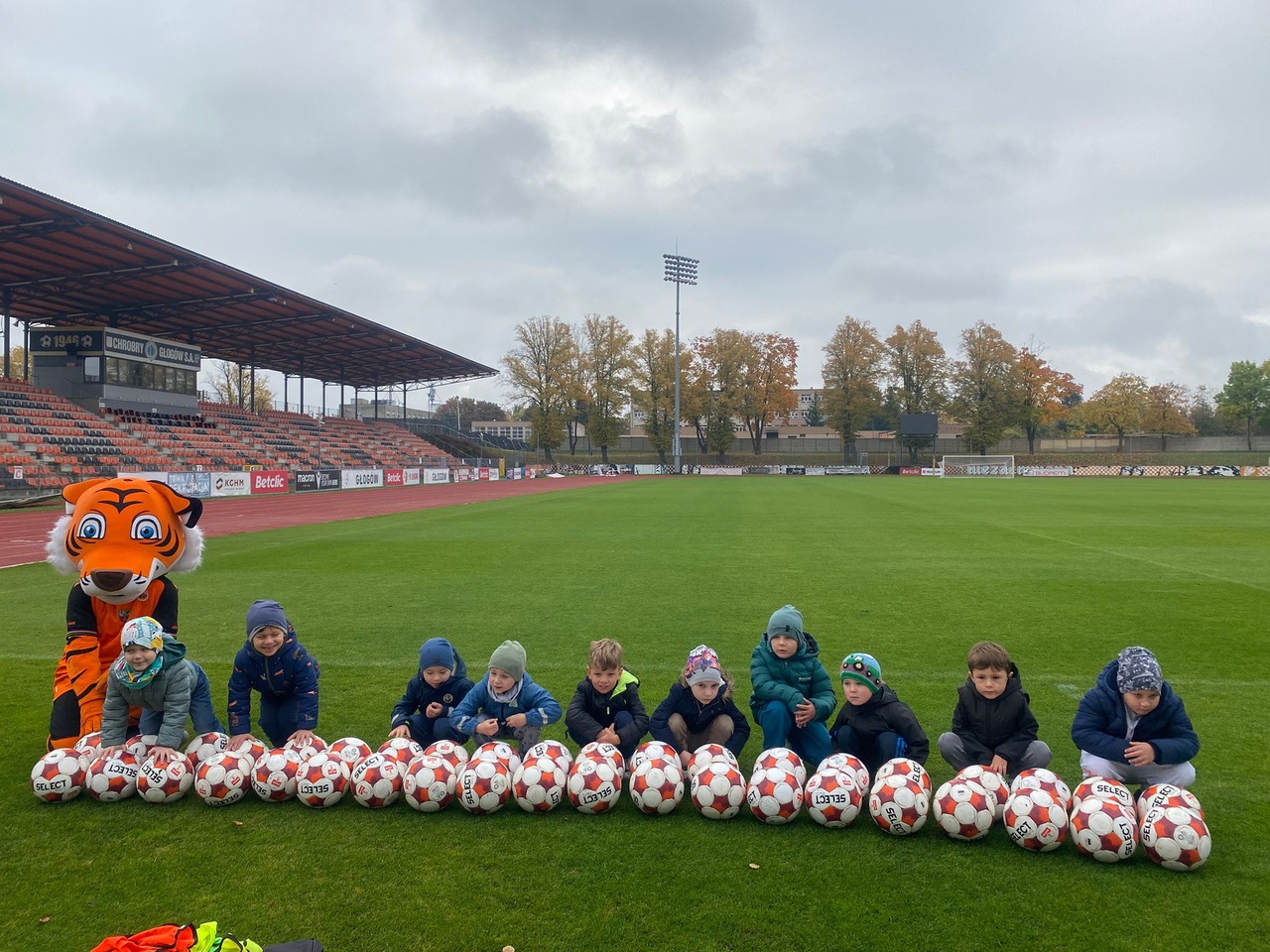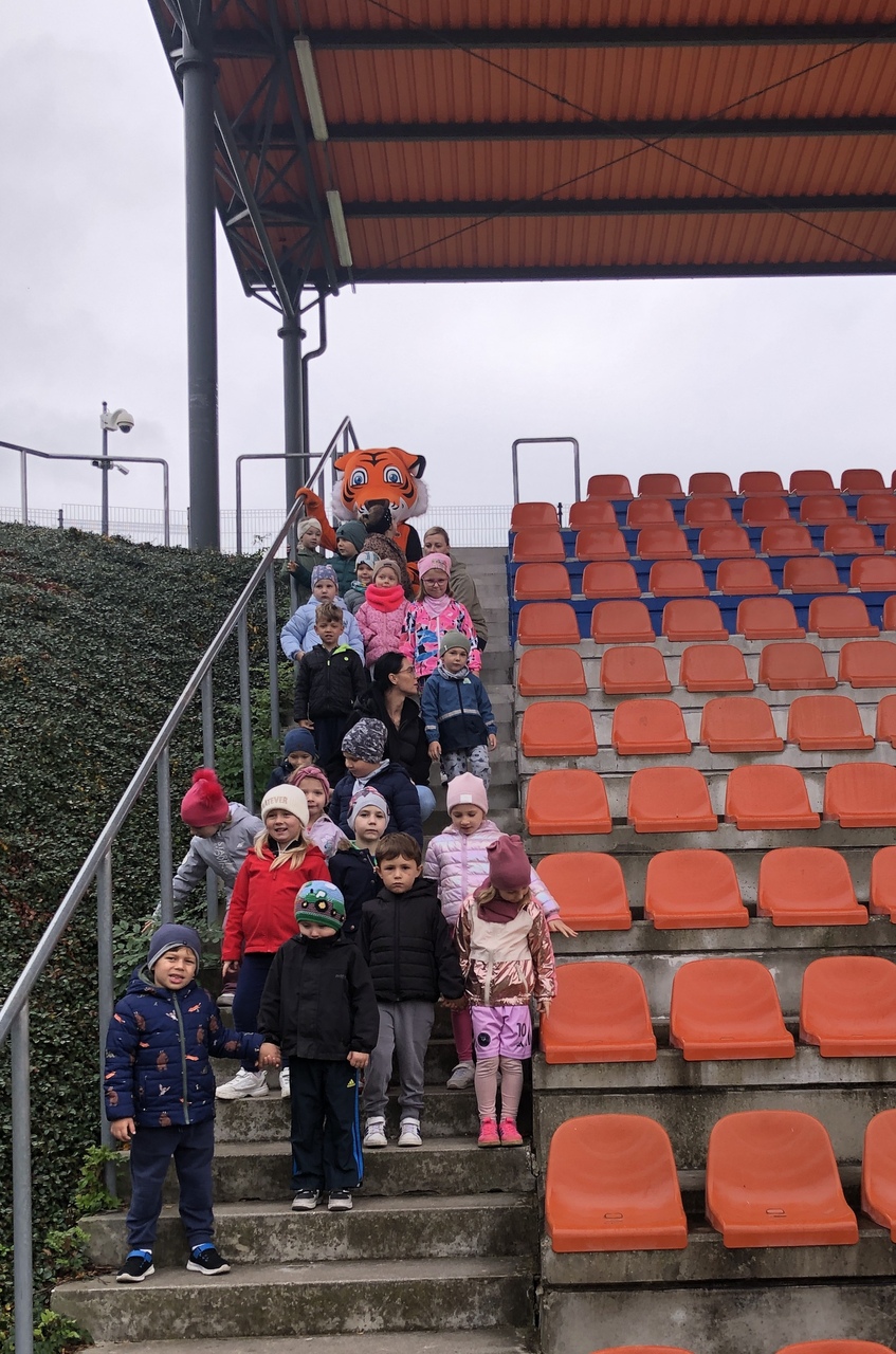 W środę, 15.10.2025 r. dzieci z oddziałów ,,Motylki” i ,,Biedronki” zwiedzały obiekty sportowe Klubu Piłkarskiego Chrobry Głogów oraz miały wyjątkową okazję wziąć udział we wspólnym treningu z trenerem Akademii Piłki Nożnej panem Pawłem Marszałkiem. Podczas spotkania przedszkolaki poznały zawód trenera, dowiedziały się, że zajęcia sportowe z piłki nożnej to świetny sposób na aktywne spędzanie czasu w gronie rówieśników, a wspólna aktywność fizyczna nie tylko sprzyja budowaniu relacji i współpracy, ale uczy wzajemnego szacunku i zasad gry fair play. Na koniec, w towarzystwie maskotki klubu – Tygryska Chrobrego, dzieci zwiedziły stadion i okoliczne obiekty sportowe.