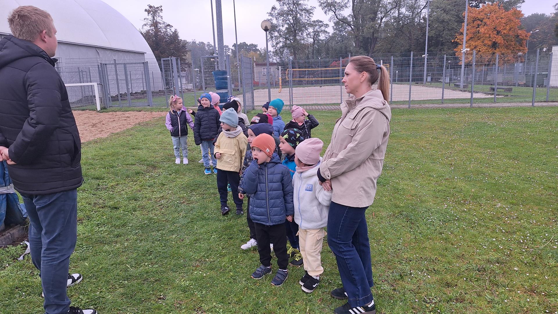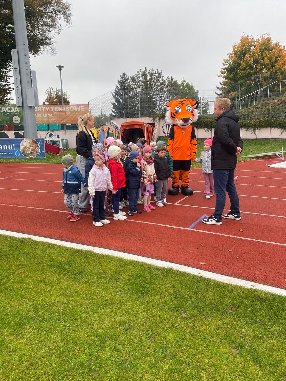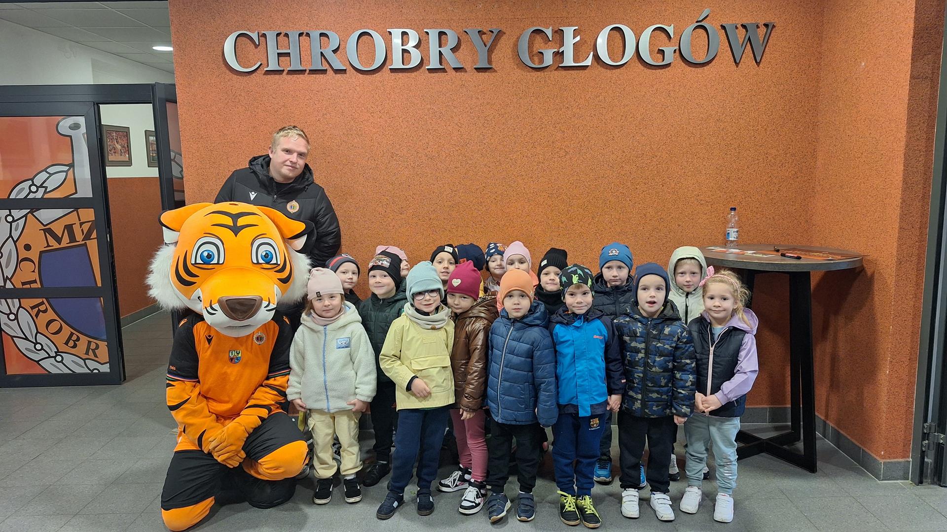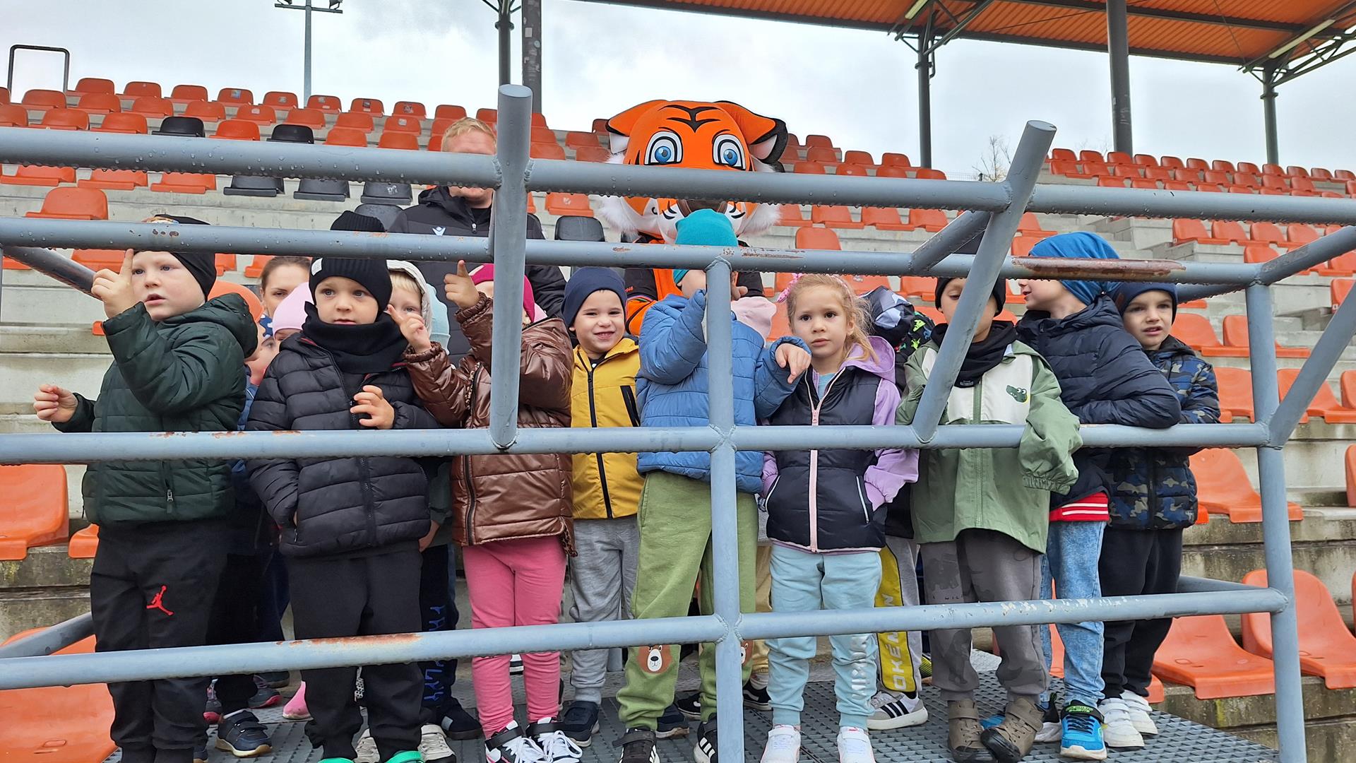 W środę, 15.10.2025 r. dzieci z oddziałów ,,Motylki” i ,,Biedronki” zwiedzały obiekty sportowe Klubu Piłkarskiego Chrobry Głogów oraz miały wyjątkową okazję wziąć udział we wspólnym treningu z trenerem Akademii Piłki Nożnej panem Pawłem Marszałkiem. Podczas spotkania przedszkolaki poznały zawód trenera, dowiedziały się, że zajęcia sportowe z piłki nożnej to świetny sposób na aktywne spędzanie czasu w gronie rówieśników, a wspólna aktywność fizyczna nie tylko sprzyja budowaniu relacji i współpracy, ale uczy wzajemnego szacunku i zasad gry fair play. Na koniec, w towarzystwie maskotki klubu – Tygryska Chrobrego, dzieci zwiedziły stadion i okoliczne obiekty sportowe.