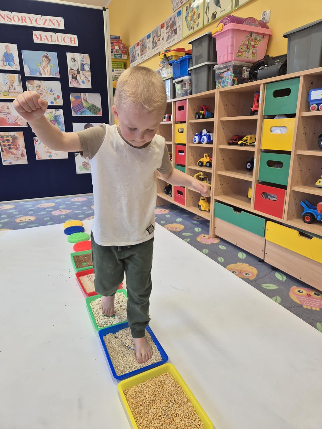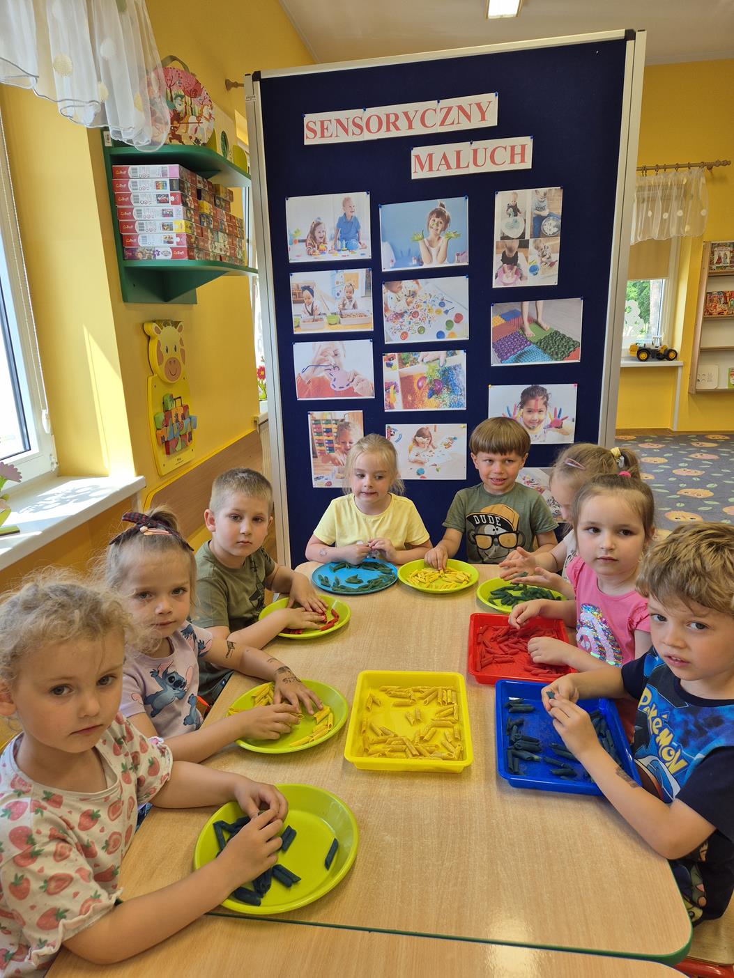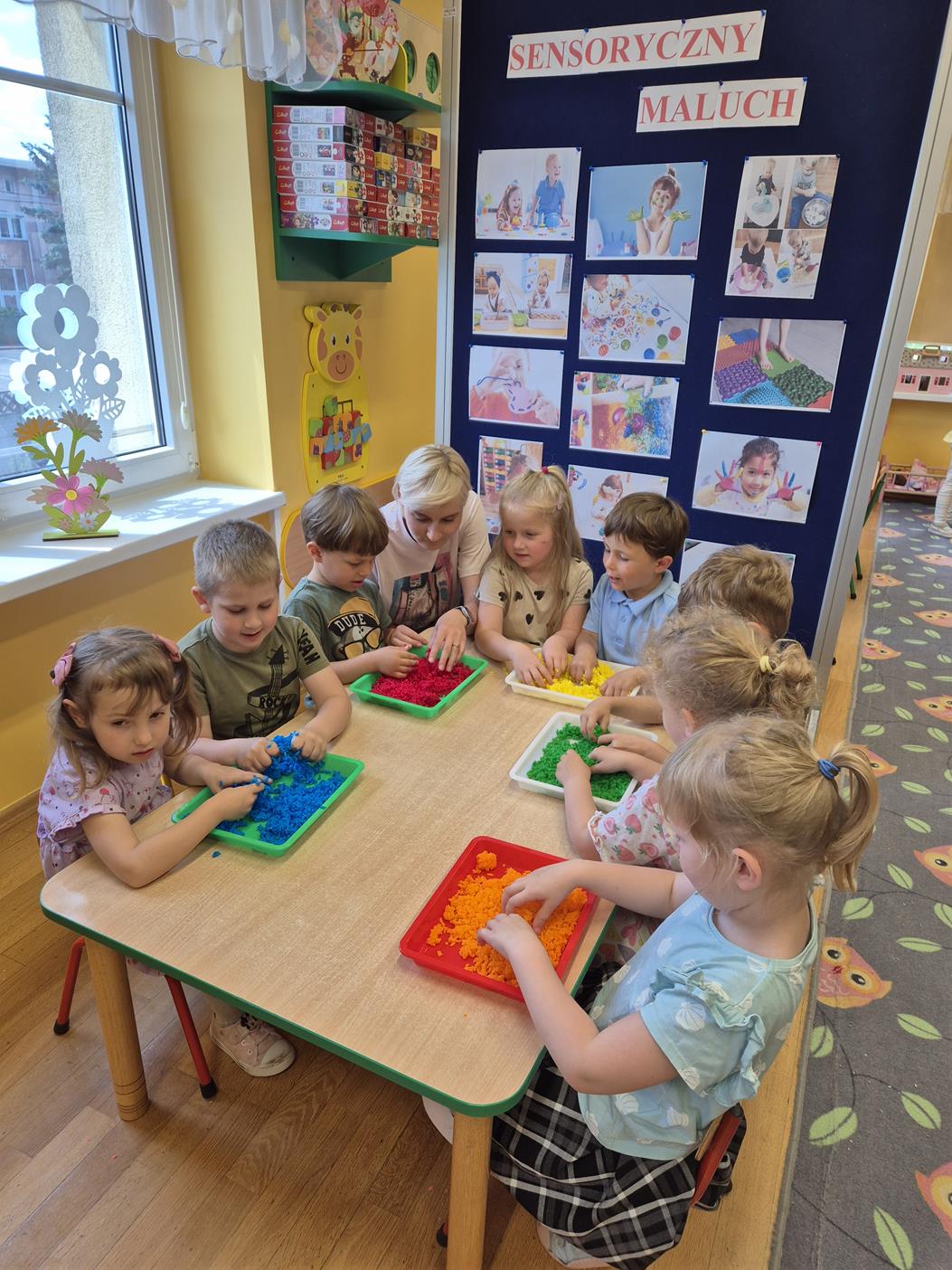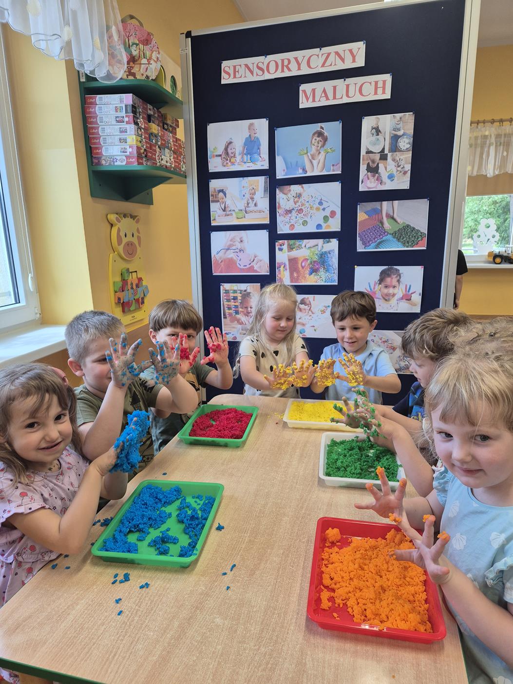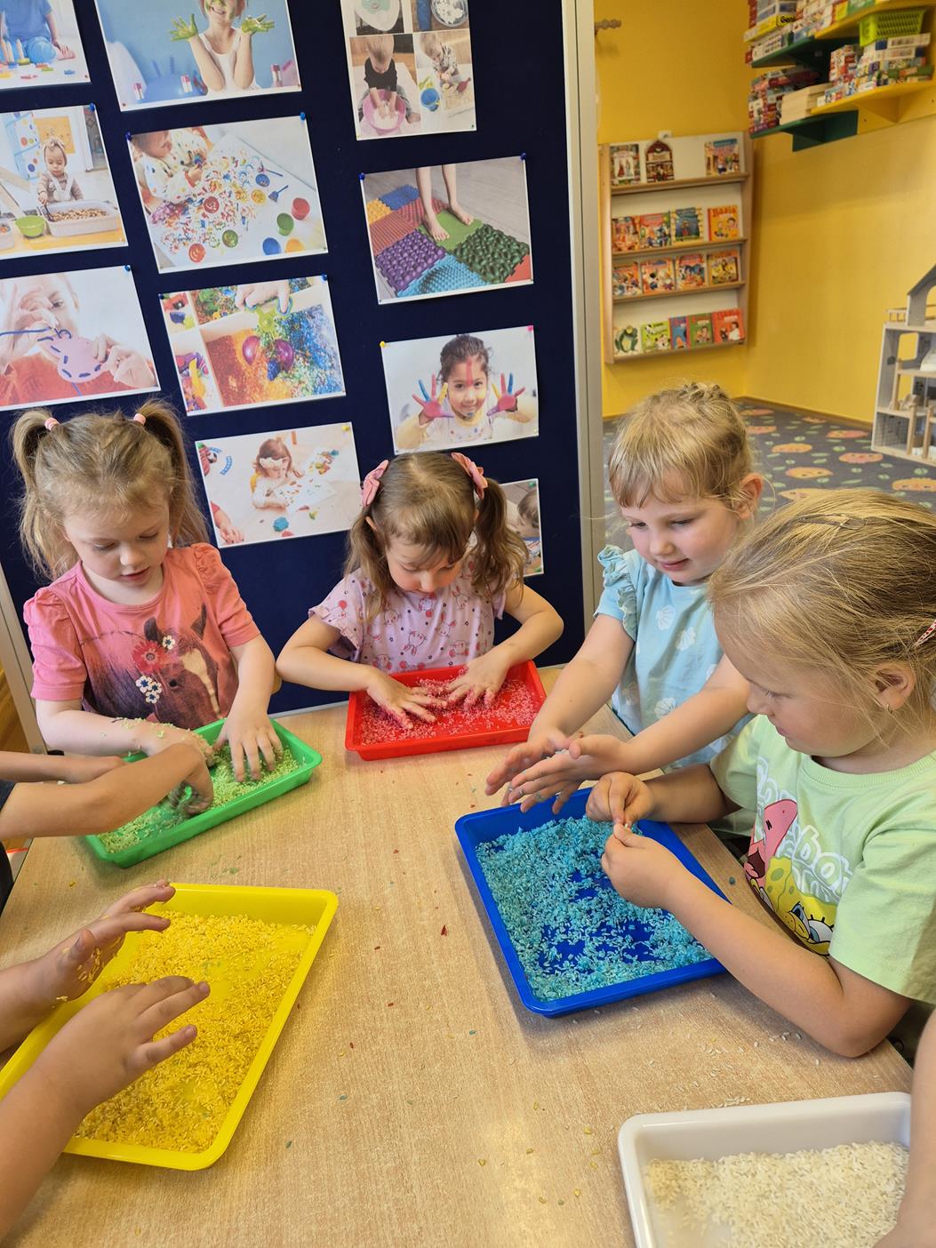 W grupie oddziału przedszkolnego „Pszczółki” odbyły się zabawy sensoryczne, które miały na celu rozwijanie zmysłu dotyku. Dzieci uczestniczyły w aktywnościach pobudzających ciekawość i kreatywność, jednocześnie rozwijając umiejętności poznawcze i motorykę małą. Przedszkolaki były zaangażowane, chętne do współpracy i dzielenia się swoimi wrażeniami z rówieśnikami.