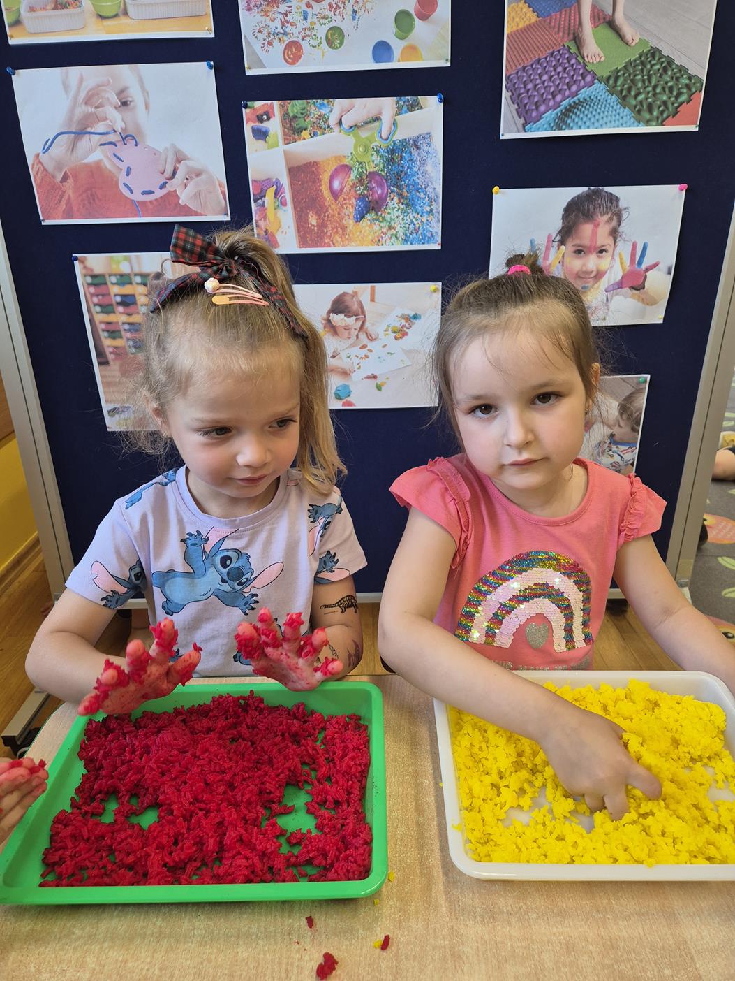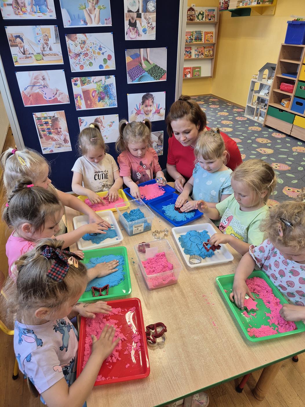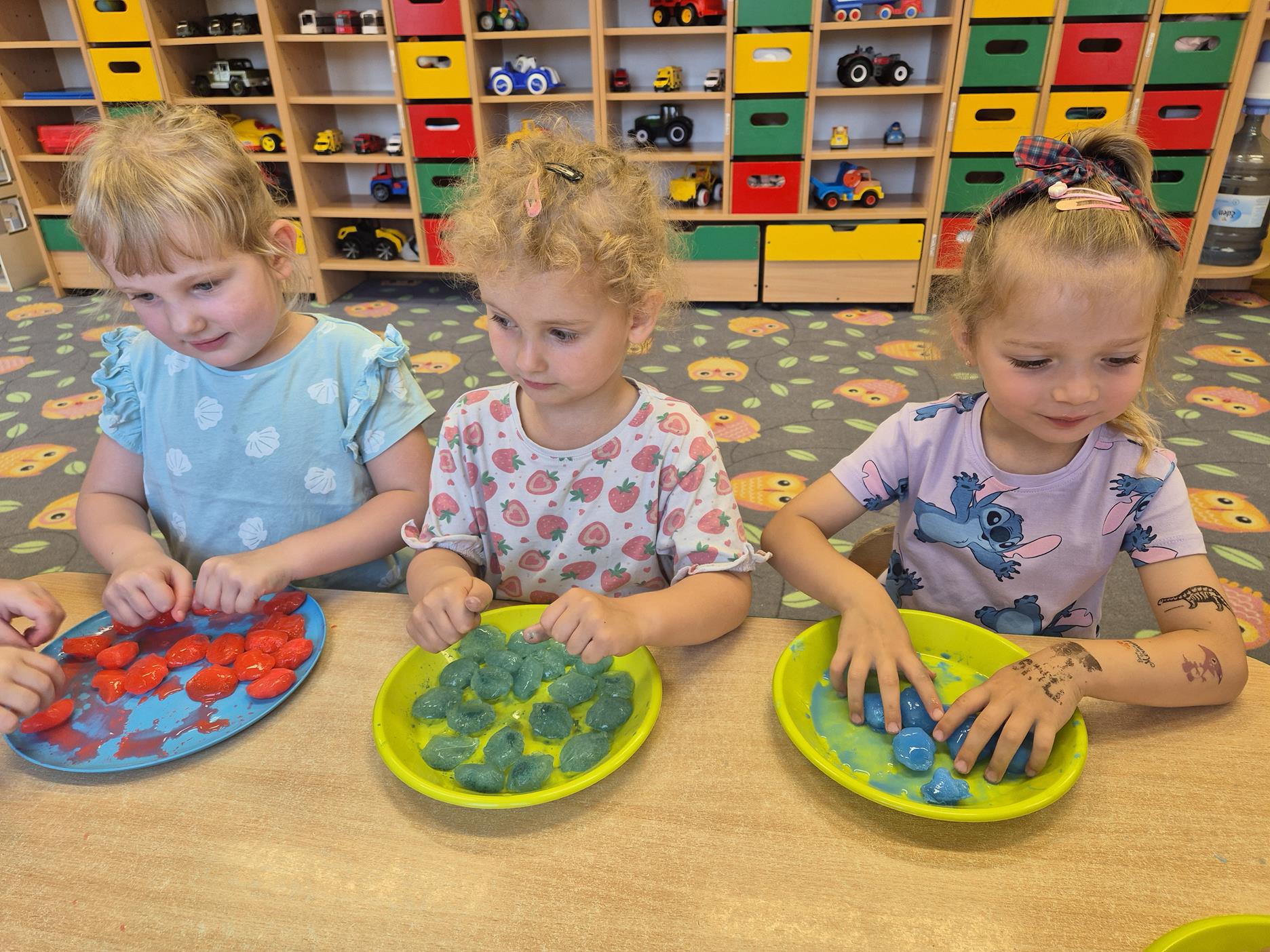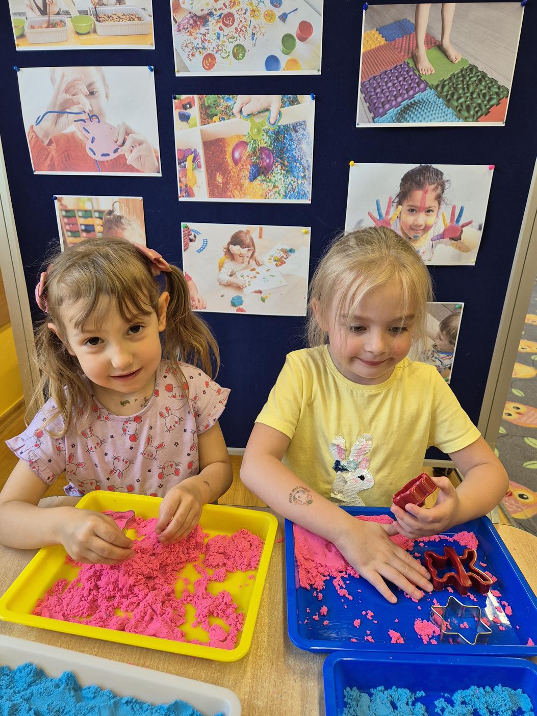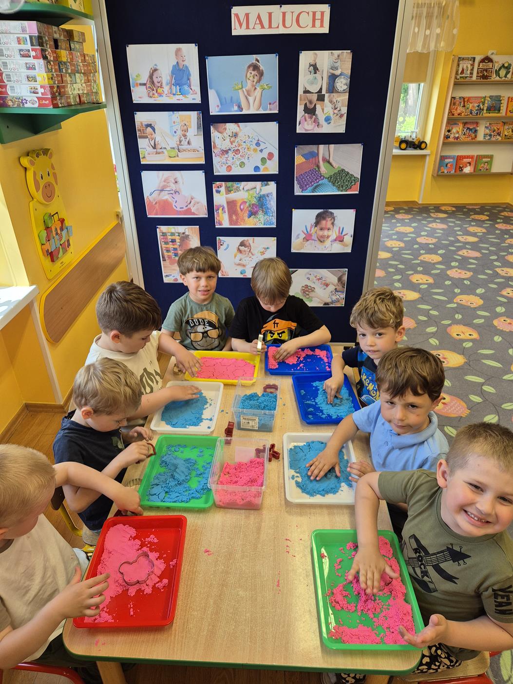 W grupie oddziału przedszkolnego „Pszczółki” odbyły się zabawy sensoryczne, które miały na celu rozwijanie zmysłu dotyku. Dzieci uczestniczyły w aktywnościach pobudzających ciekawość i kreatywność, jednocześnie rozwijając umiejętności poznawcze i motorykę małą. Przedszkolaki były zaangażowane, chętne do współpracy i dzielenia się swoimi wrażeniami z rówieśnikami.