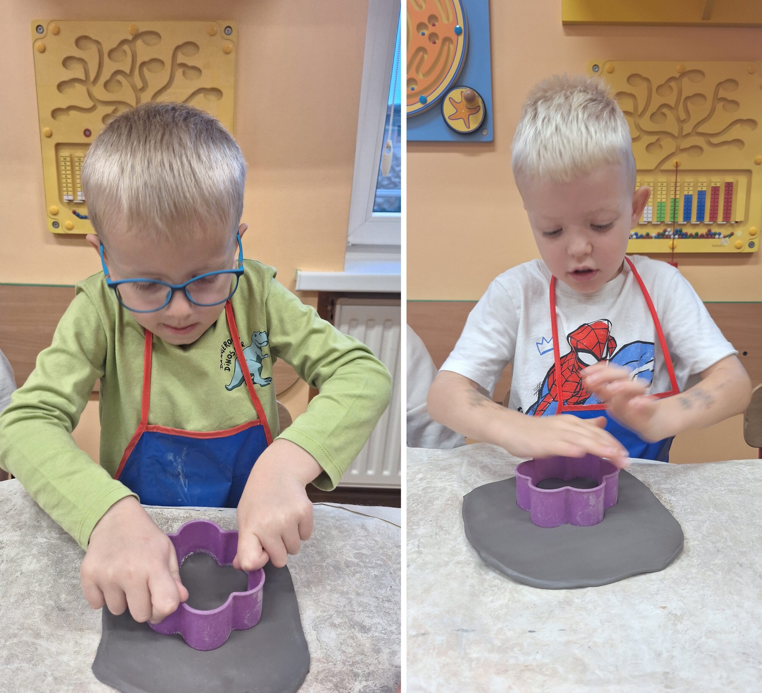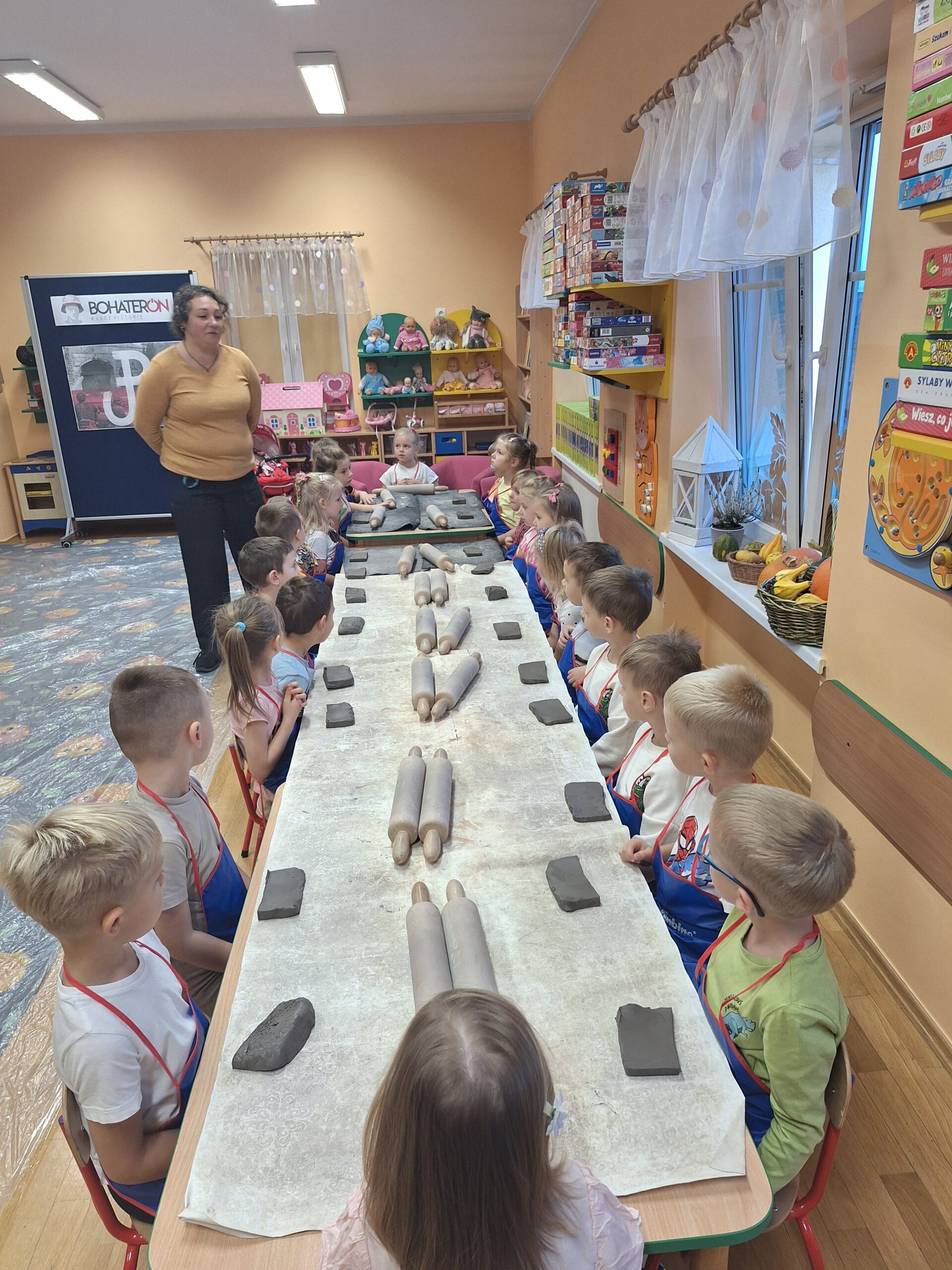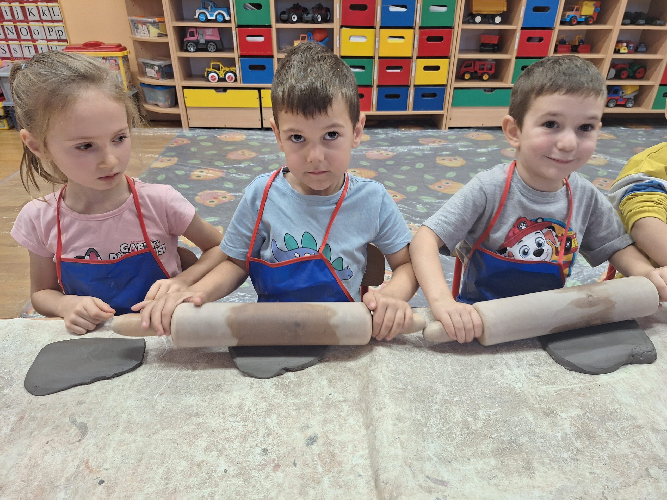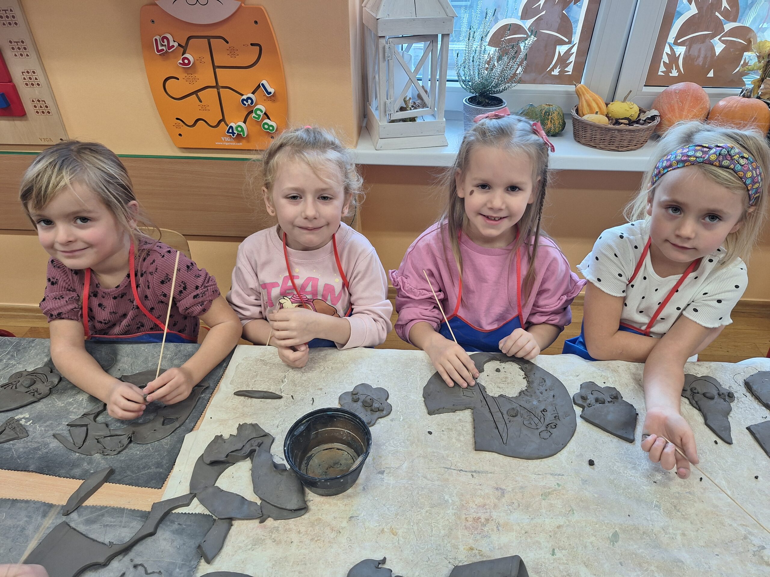 Dnia 30 października 2024 roku dzieci z oddziału „Biedronek” uczestniczyły w warsztatach ceramicznych. Prowadząca zajęcia, Pani Joanna Powaserowska, wprowadziła dzieci w niezwykły świat ceramiki, opowiedziała o właściwościach gliny oraz omówiła etapy powstawania gotowego produktu ceramicznego. Praca z gliną bardzo dobrze wpływa na harmonijny rozwój dzieci. Wycisza, uczy skupienia i cierpliwości. Rozwija sprawność manualną dziecka. Znakomicie stymuluje i rozwija układ nerwowy. Rozwija wyobraźnię, zdolności manualne, ekspresję plastyczną, a przede wszystkim jest wspaniałą zabawą. Efektem naszej zabawy z gliną są Mikołaje.