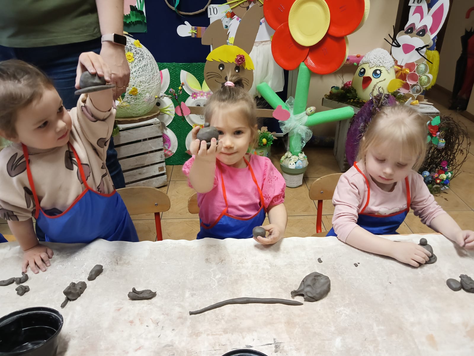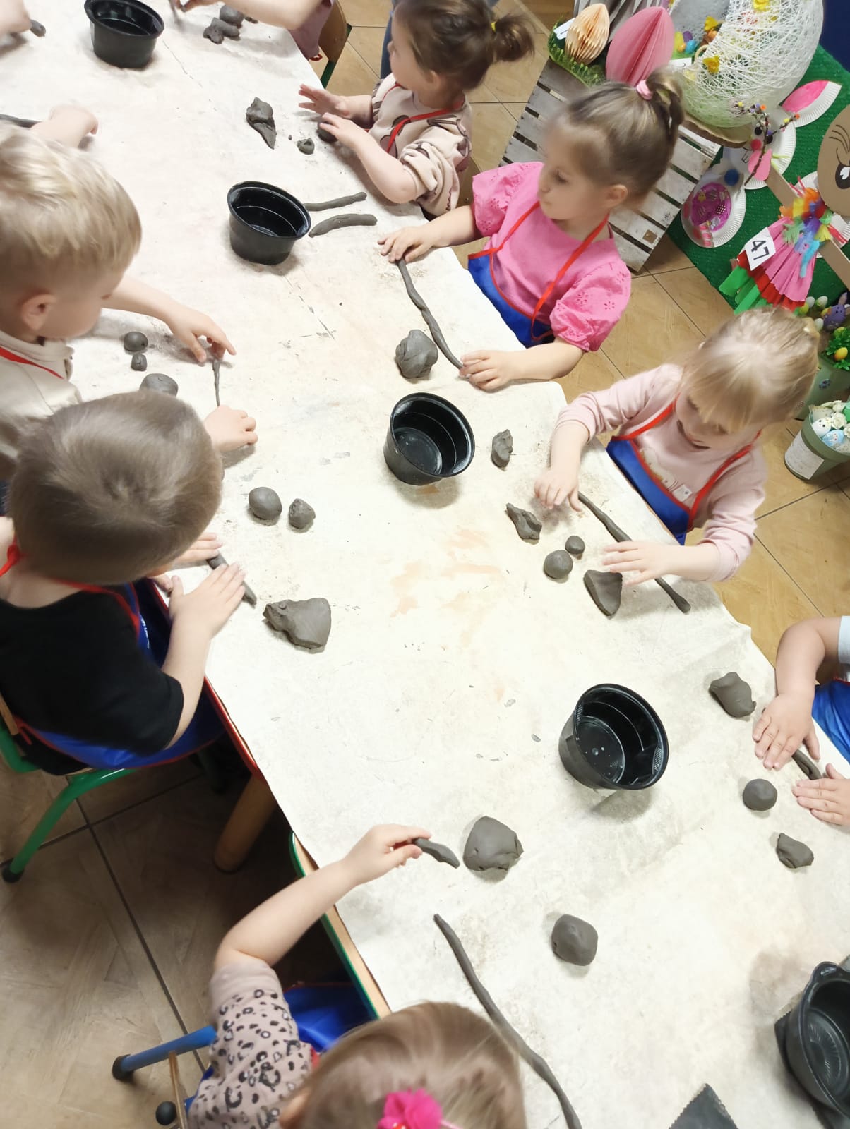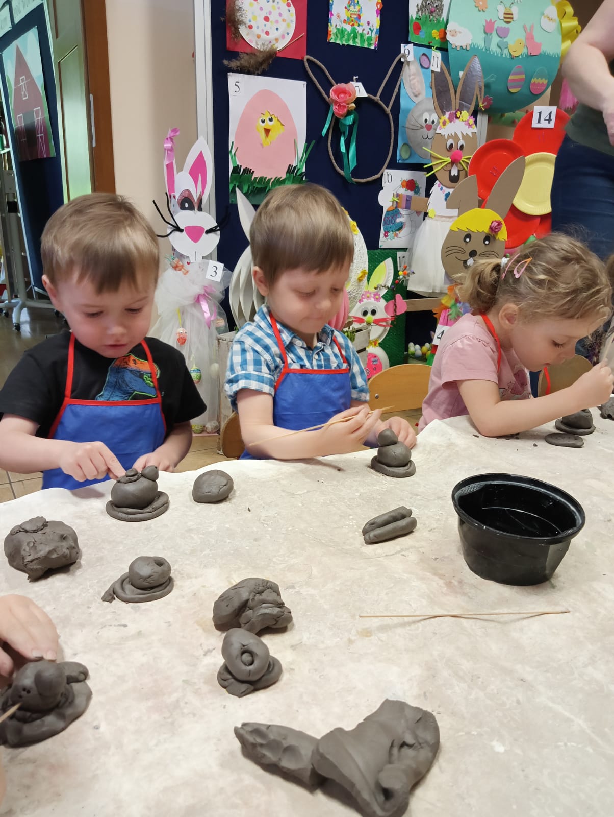 Dnia 09.04.2025 roku przedszkolaki z oddziału „Żuczki” uczestniczyły w warsztatach z ceramiki – lepienie z gliny. Praca z gliną znakomicie stymuluje i rozwija układ nerwowy, uczy skupienia i cierpliwości. Rozwija wyobraźnię, zdolności manualne, ekspresję plastyczną, a przede wszystkim jest wspaniałą zabawą. Sama zabawa gliną była dla dzieci wielką przyjemnością, a kiedy zaczęły powstawać małe arcydzieła, dzieci były zachwycone. Efektem zabawy z gliną były wielkanocne kurczaczki, które następnie zostaną wypalone w specjalnie przeznaczonym do tego piecu.
