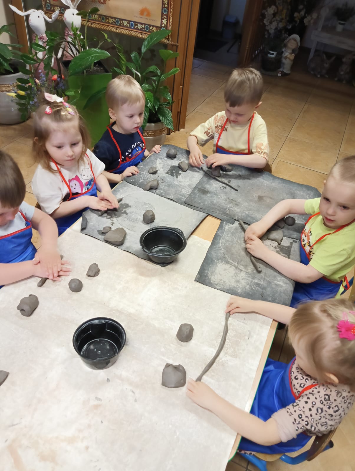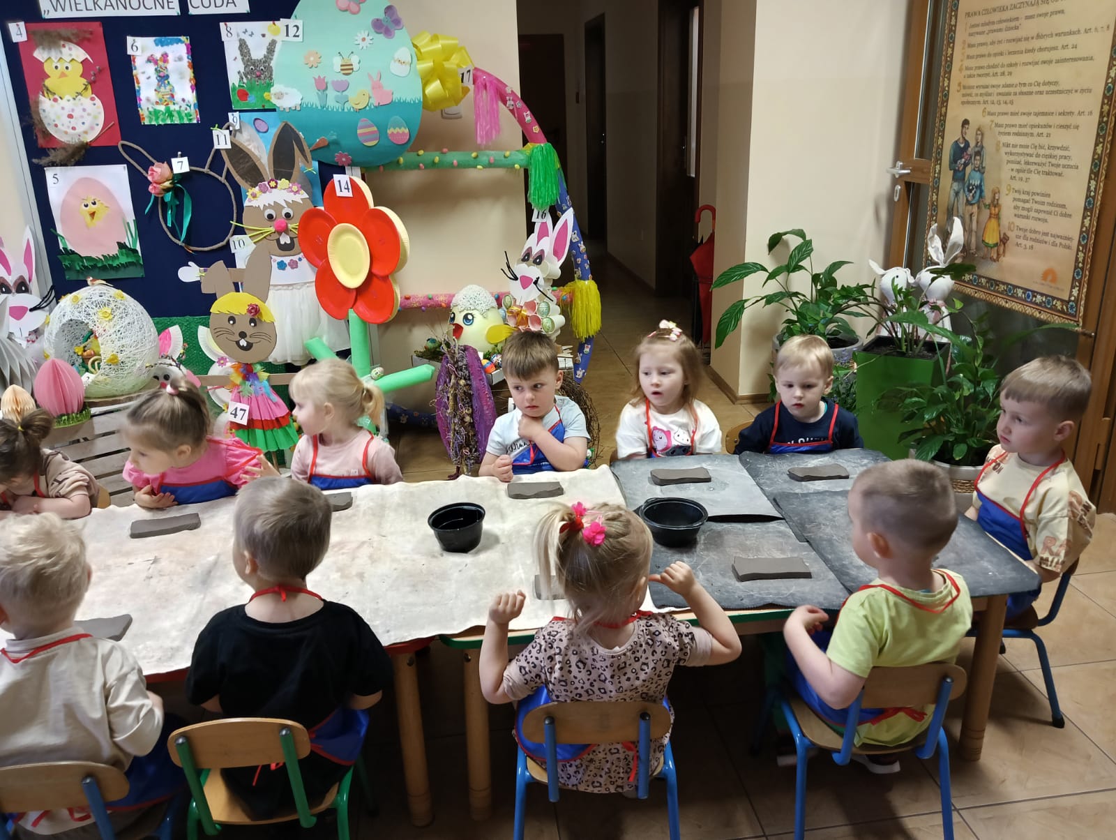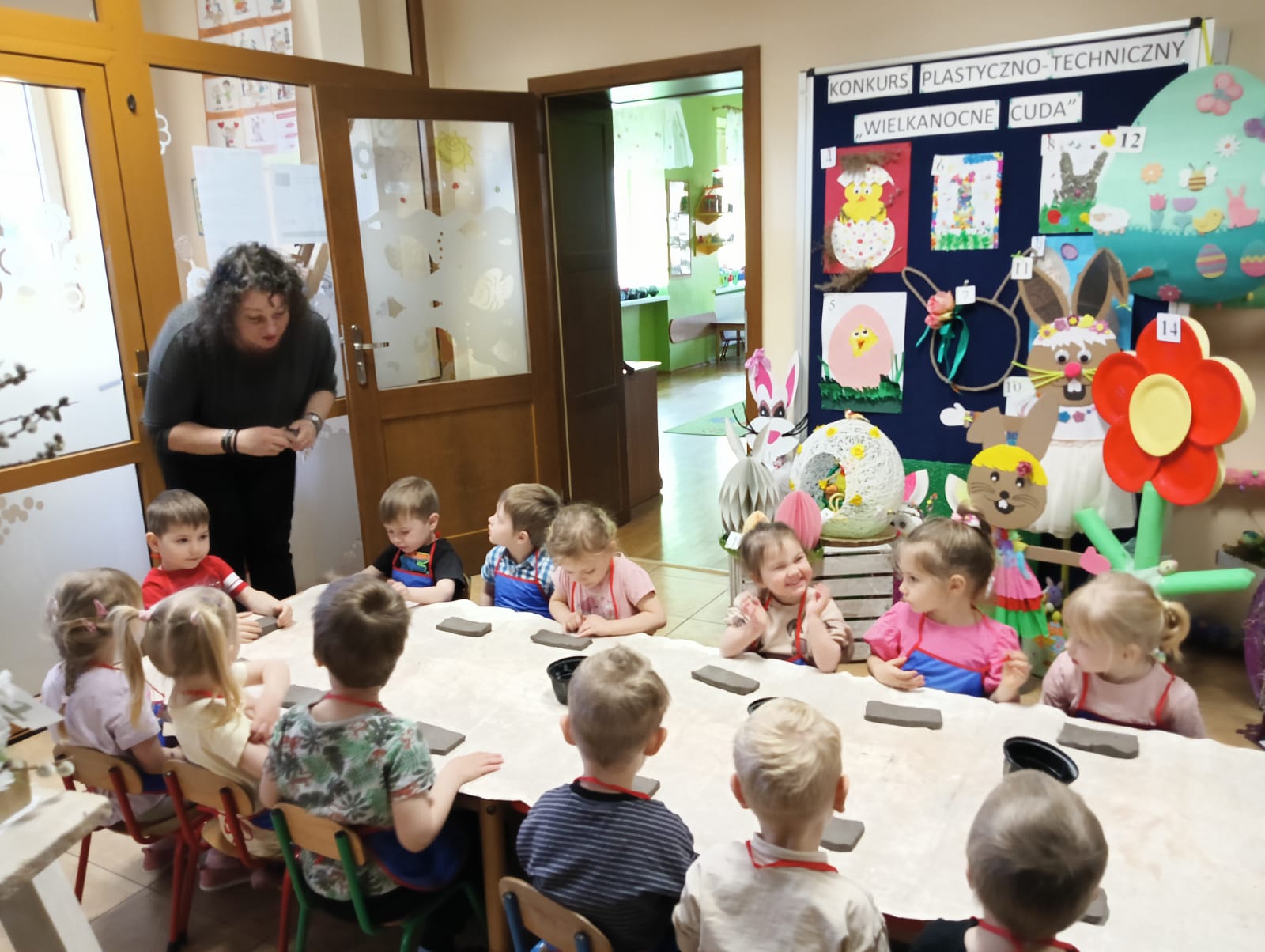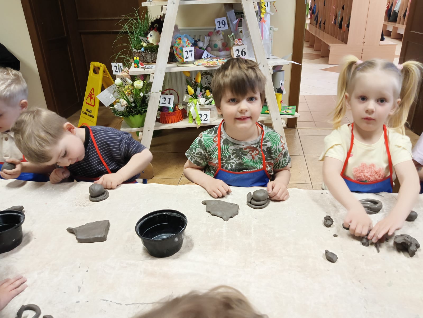 Dnia 09.04.2025 roku przedszkolaki z oddziału „Żuczki” uczestniczyły w warsztatach z ceramiki – lepienie z gliny. Praca z gliną znakomicie stymuluje i rozwija układ nerwowy, uczy skupienia i cierpliwości. Rozwija wyobraźnię, zdolności manualne, ekspresję plastyczną, a przede wszystkim jest wspaniałą zabawą. Sama zabawa gliną była dla dzieci wielką przyjemnością, a kiedy zaczęły powstawać małe arcydzieła, dzieci były zachwycone. Efektem zabawy z gliną były wielkanocne kurczaczki, które następnie zostaną wypalone w specjalnie przeznaczonym do tego piecu.