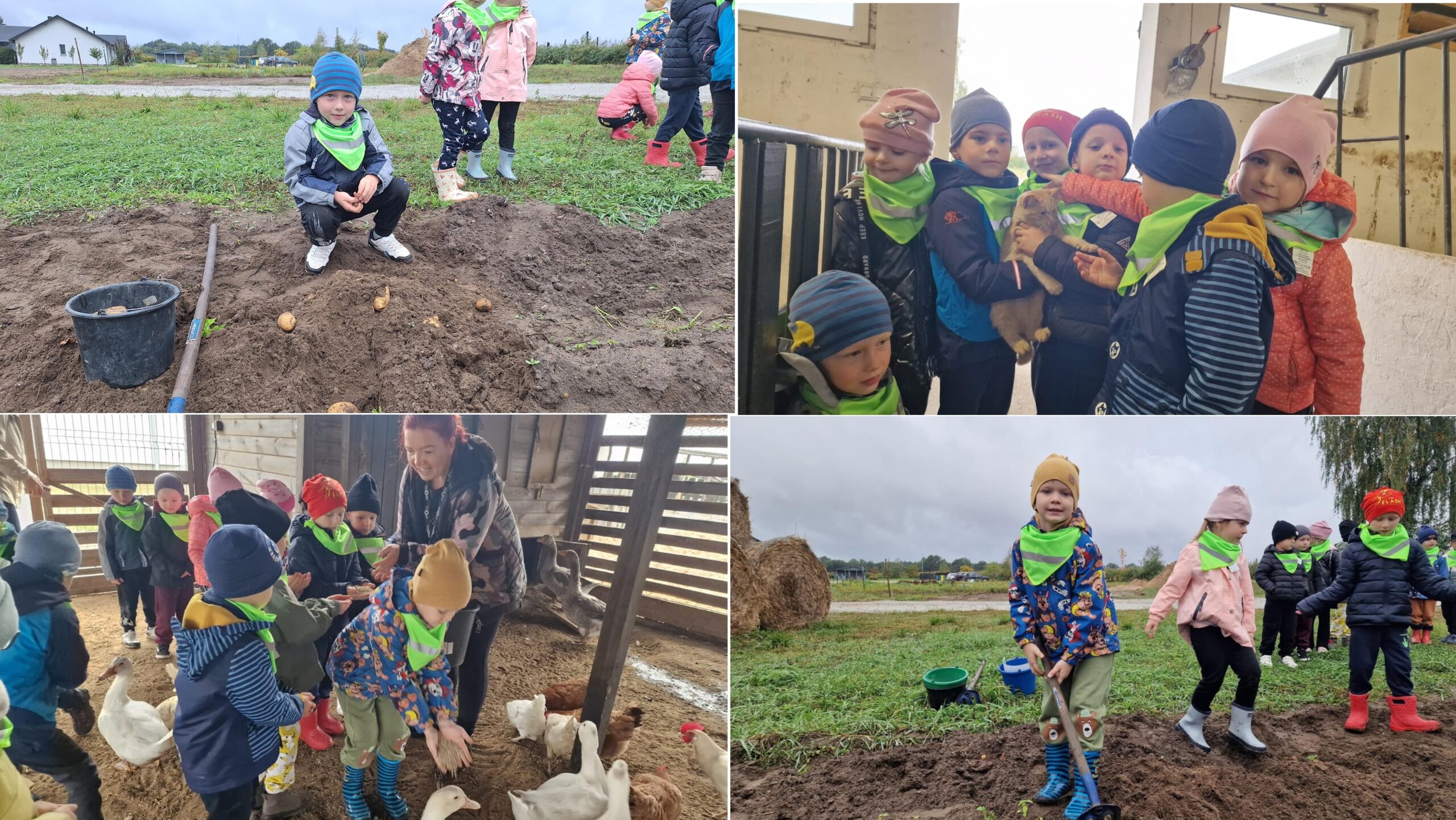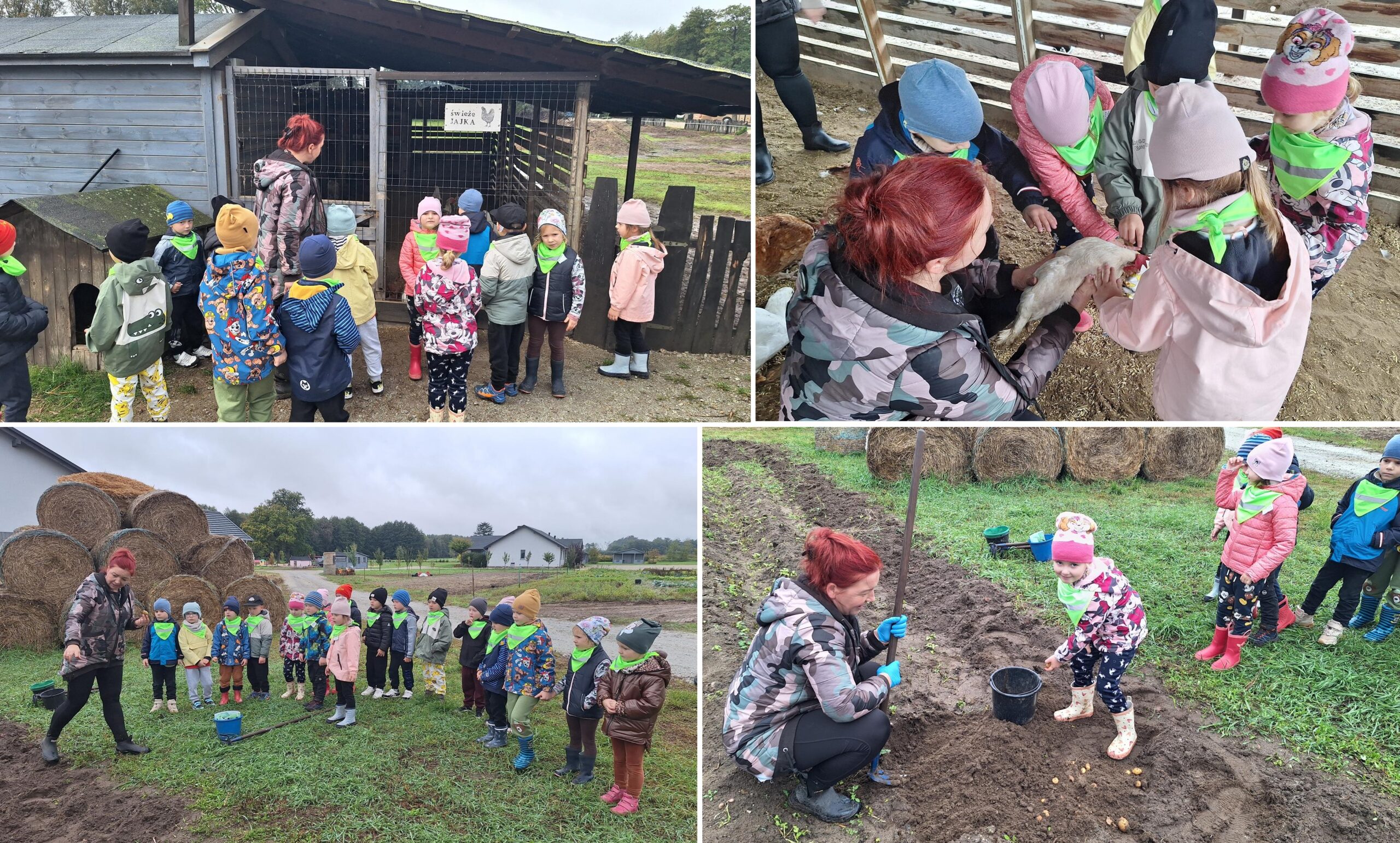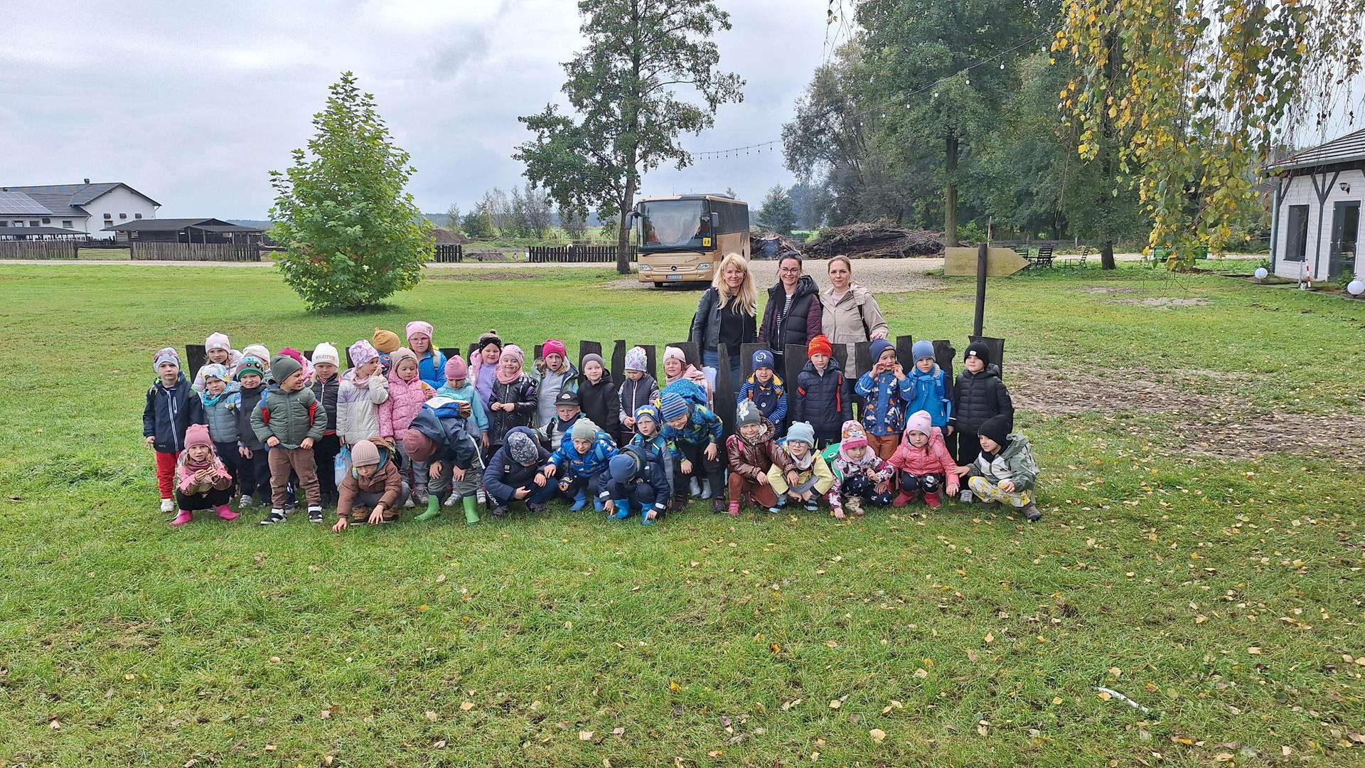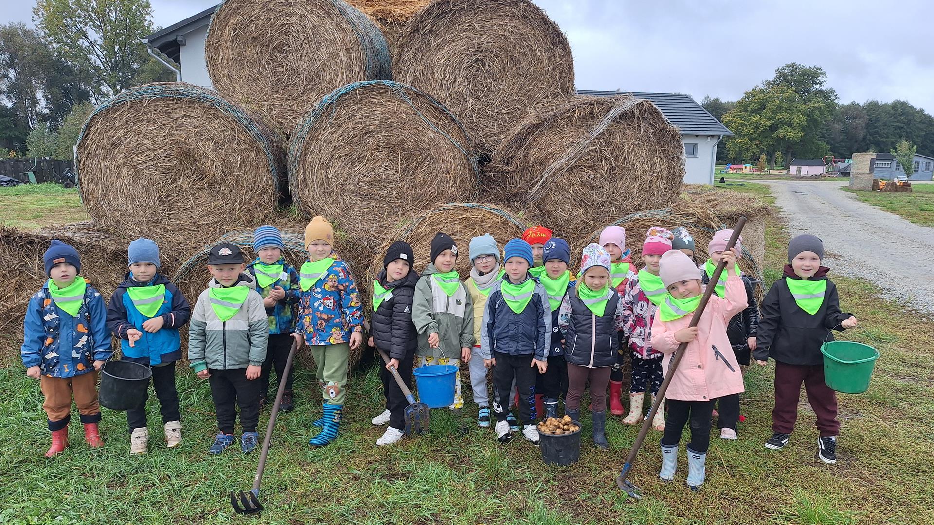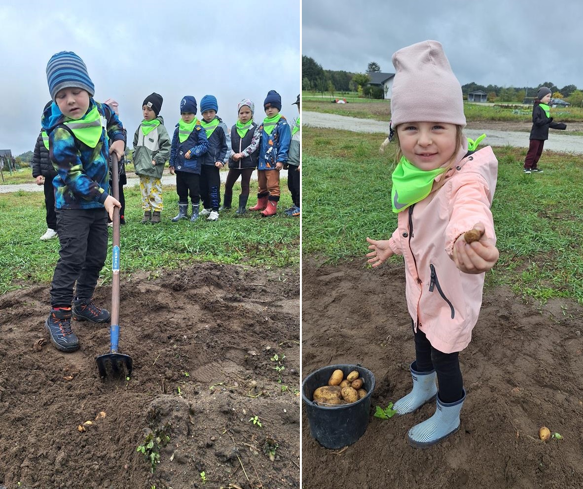 Dnia 9 października 2025 roku dzieci z oddziału Biedronek i Motylków udały się na wycieczkę autokarową do Gospodarstwa Agroturystycznego „Wesołe Ranczo” w miejscowości Niechłód. Na miejscu na dzieci czekało mnóstwo atrakcji. Na początku przedszkolaki zapoznały się z uprawą ziemniaków, miały okazję samodzielnie brać udział w wykopkach i odnajdywać w ziemi ziemniaczane skarby. Największą radość sprawił dzieciom spacer po ekologicznym gospodarstwie i spotkanie z wiejskimi zwierzętami. Przedszkolaki mogły karmić i głaskać młode cielaki, kózki, kucyki, króliki, świnki morskie, kaczki, gęsi i kury. Na koniec zostaliśmy ugoszczeni pysznym ciastem czekoladowym, kiełbaską i ziemniaczkami z ogniska. Pełny emocji i radości październikowy dzień upłynął dzieciom stanowczo za szybko. W drodze powrotnej, pomimo zmęczenia, dzieciom dopisywały humory i z entuzjazmem dzieliły się wrażeniami z wycieczki.