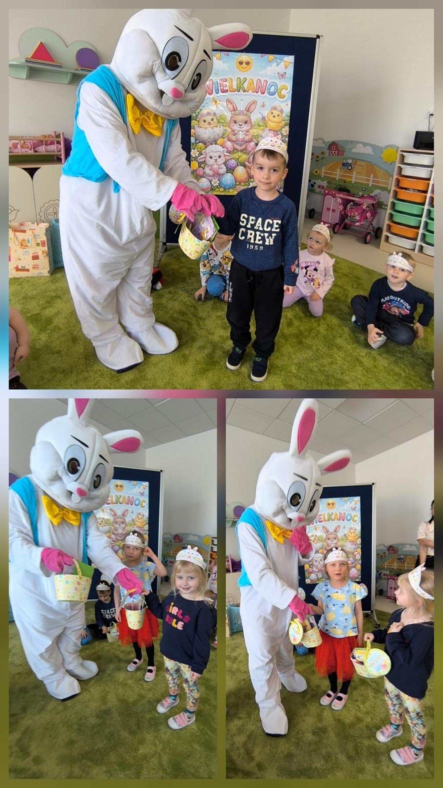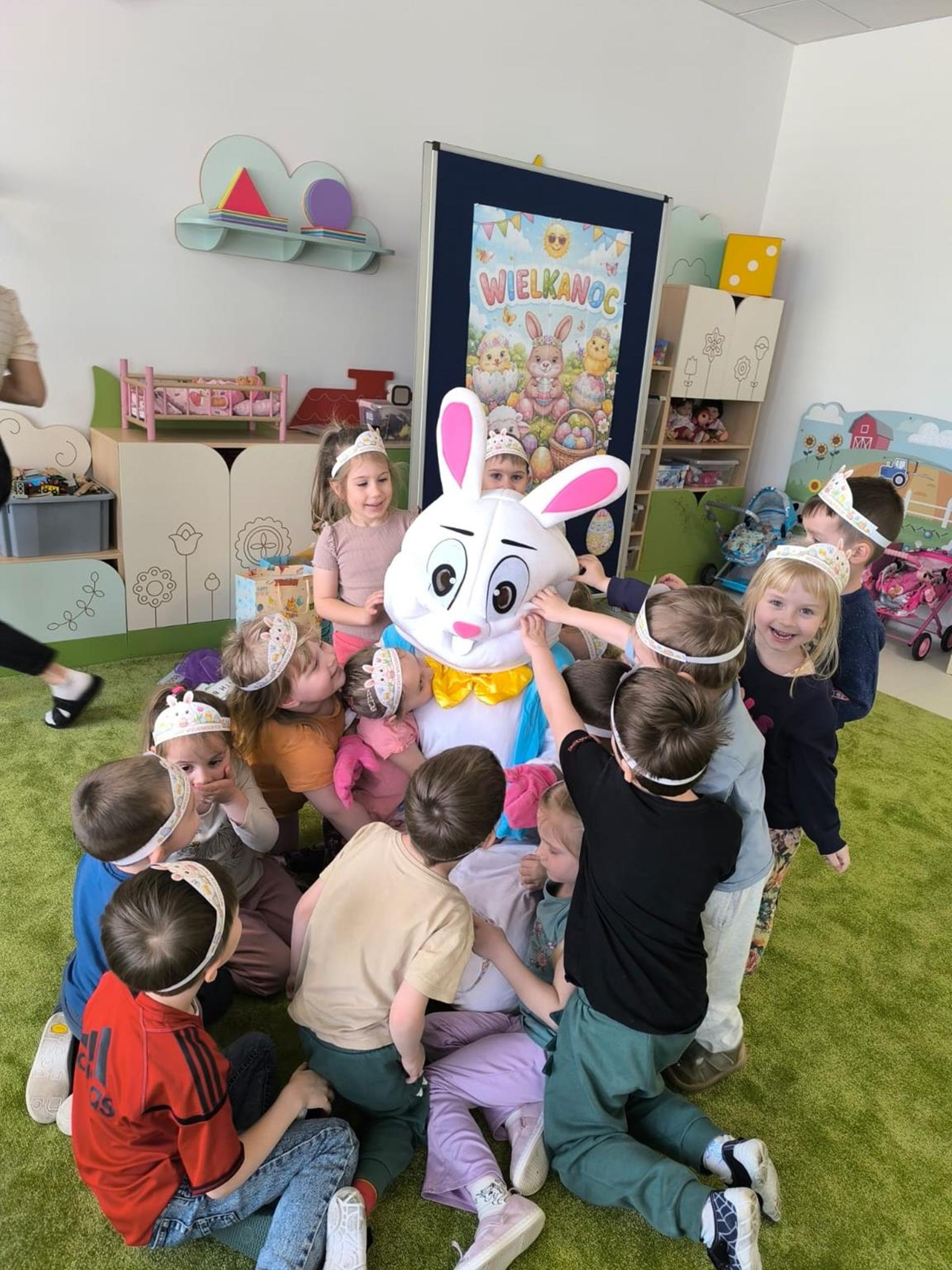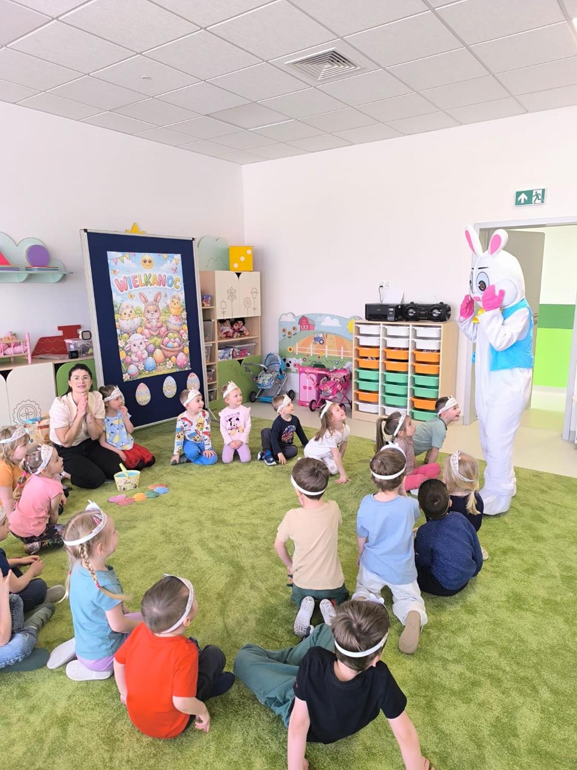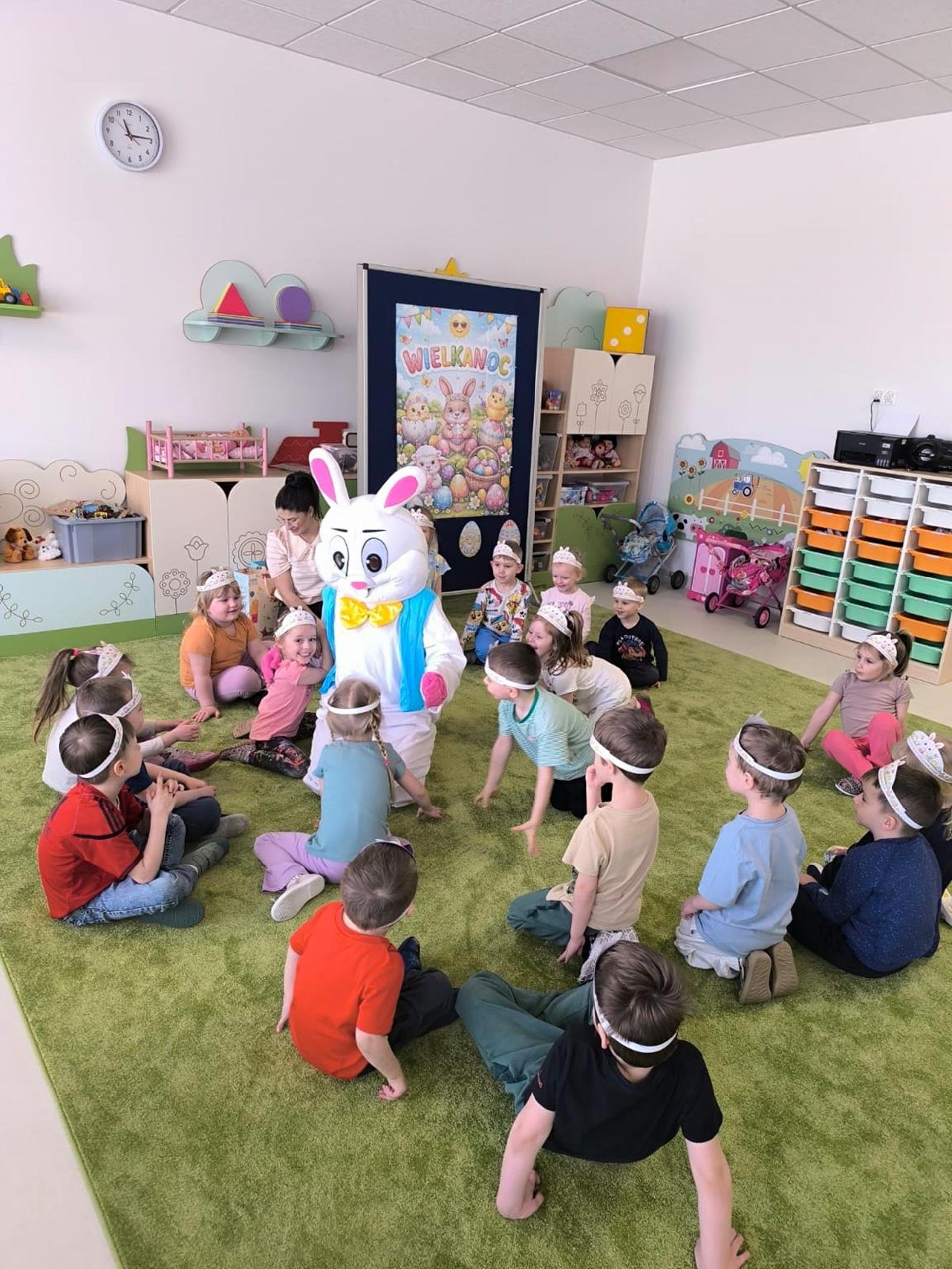 Dnia 1.04.2026r. w nasze przedszkole odwiedził Zajączek Wielkanocny. Dzieci brały udział w rozmowie kierowanej o zajączku, dzieliły się swoimi doświadczeniami związanymi ze świętami, następnie uczestniczyły w zabawach ruchowych oraz w poszukiwaniu ukrytych „prezentów” przygotowanych przez Zajączka. Celem tego było wzbogacanie wiedzy o tradycjach i zwyczajach wielkanocnych, kształtowanie rozwoju mowy, wspieranie aktywności ruchowej poprzez zabawy, integrowanie grupy oraz budowanie radosnej atmosfery. Zajęcia przebiegły w miłej i radosnej atmosferze, a dzieci chętnie uczestniczyły we wszystkich aktywnościach.