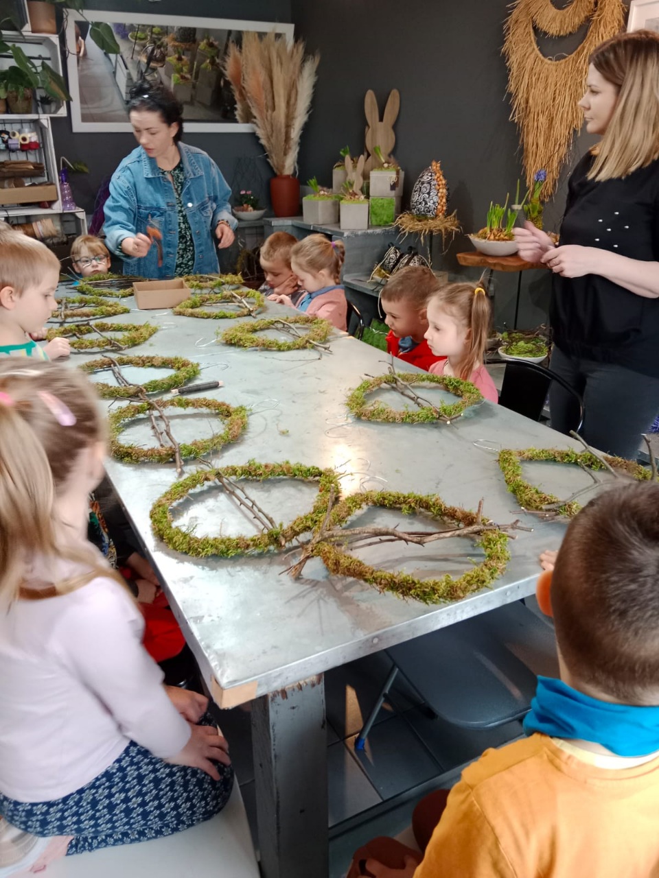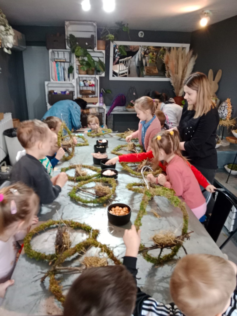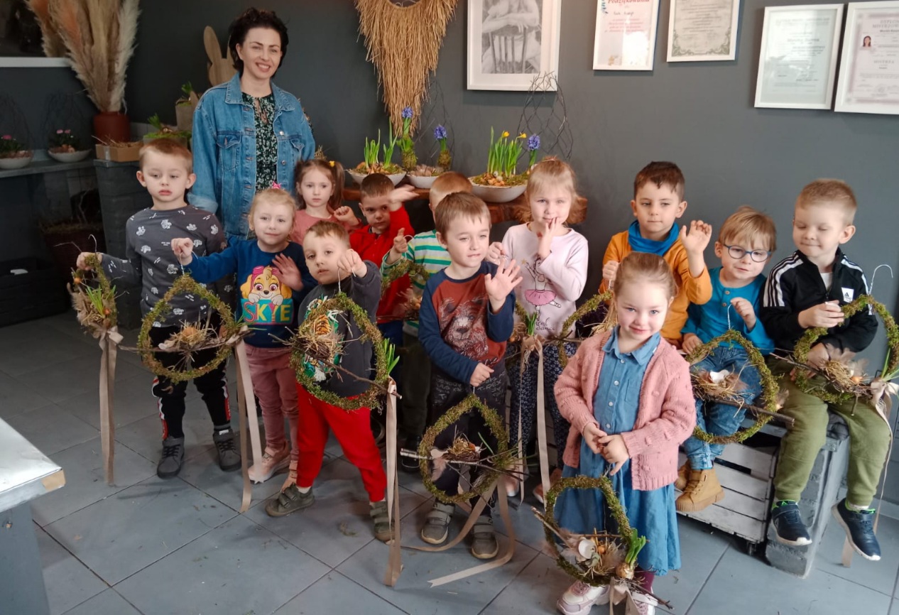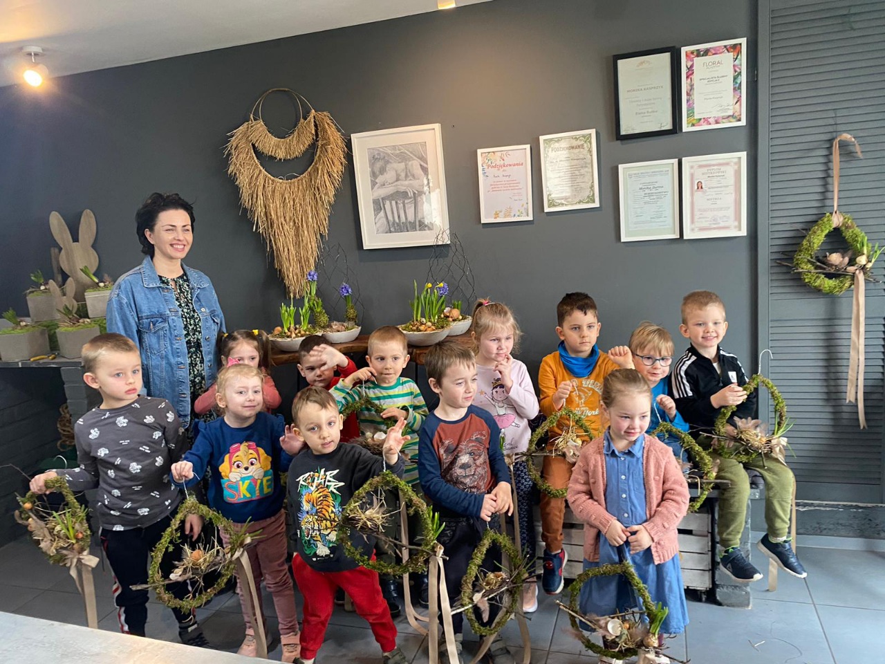 Dnia 22 marca przedszkolaki z oddziału „Mrówki”, udały się do kwiaciarni „Mięta do kwiatów” na warsztaty florystyczne. Gdzie pod czujnym okiem zawodowej florystki Pani Moniki Kasprzyk, dzieci maiły możliwość aktywnego uczestnictwa w niezwykle wyjątkowych warsztatach. Podczas tworzenia wianków świątecznych przedszkolaki manipulowały materiałem naturalnym i wykorzystały: mech, patyki, sianko, kwiaty i cebulki kwiatowe, jajeczka różnej wielkości i piórka. Dzieci doskonaliły technikę owijania materiału naturalnego na wianek za pomocą drucika. Każdy wianek był piękny i niepowtarzalny, a co najważniejsze samodzielnie wykonany i zabrany przez dzieci do domu. Dziękujemy Pani Monice za poświęcony czas i możliwość wykonania dekoracji pod fachowym okiem florysty.