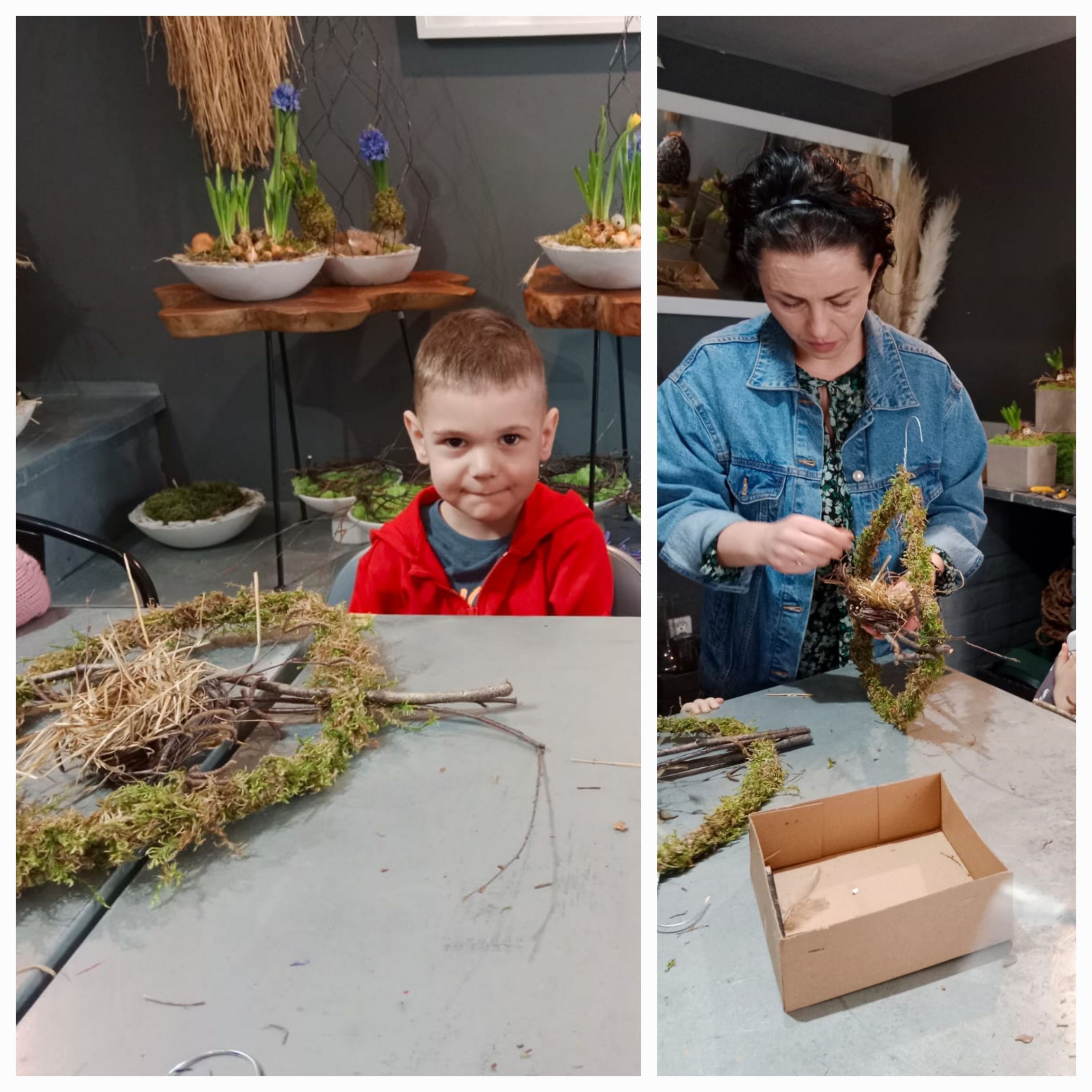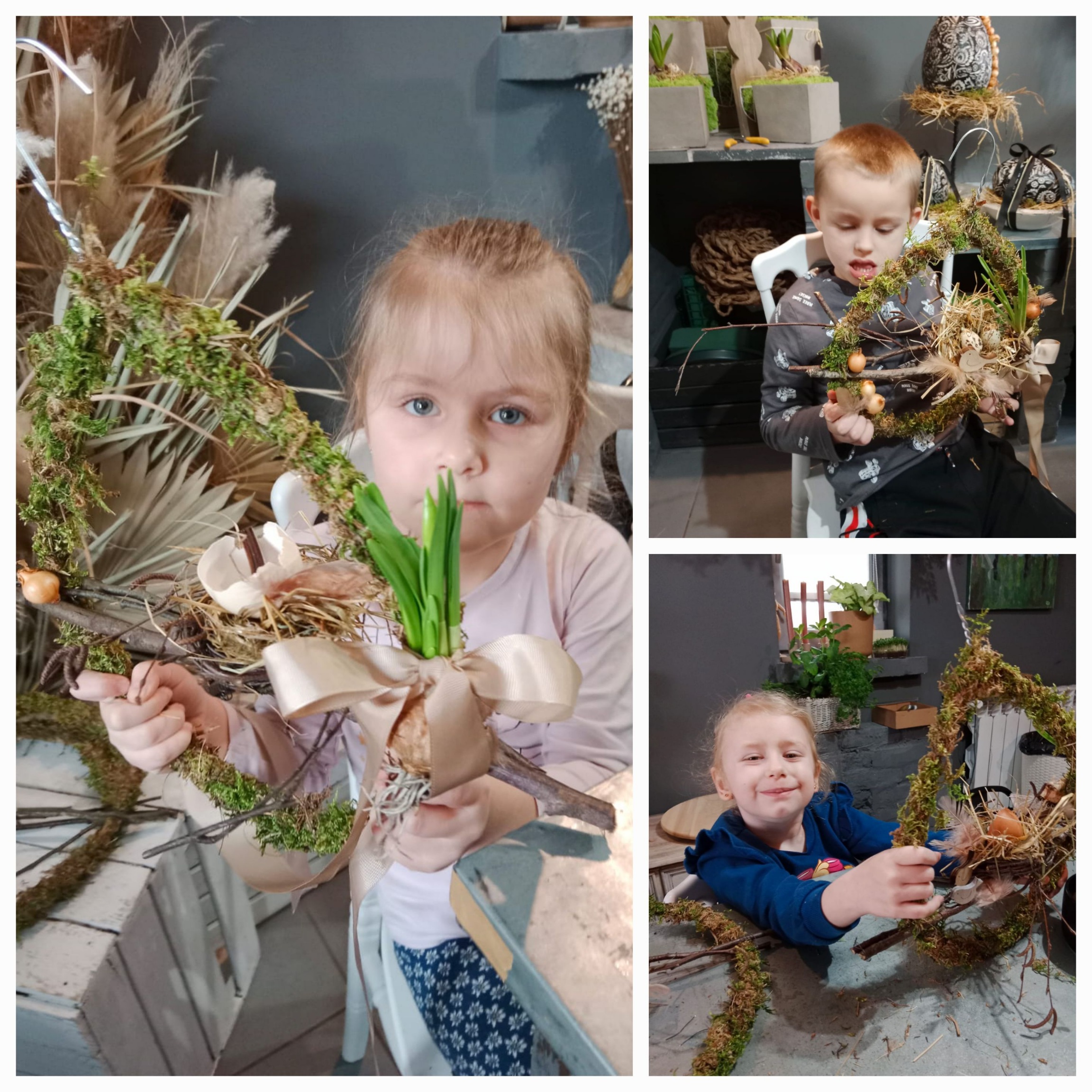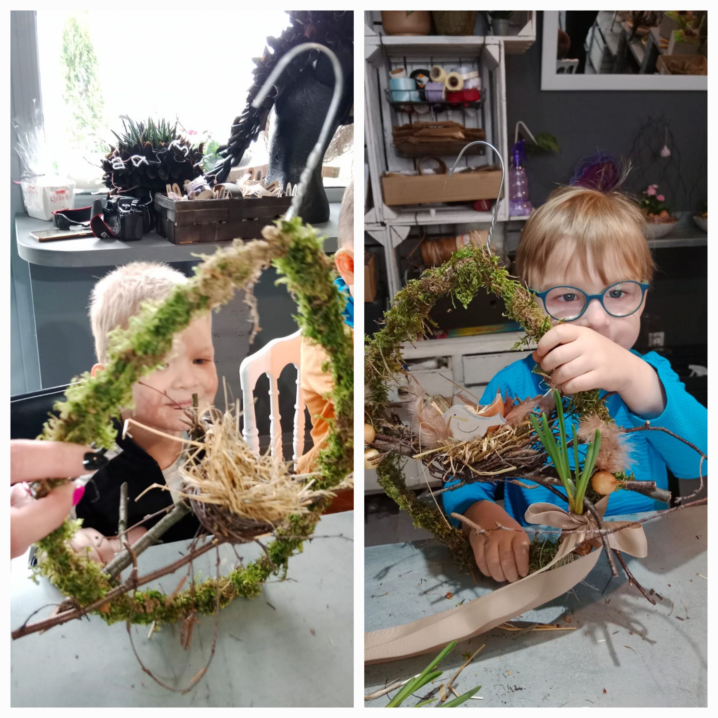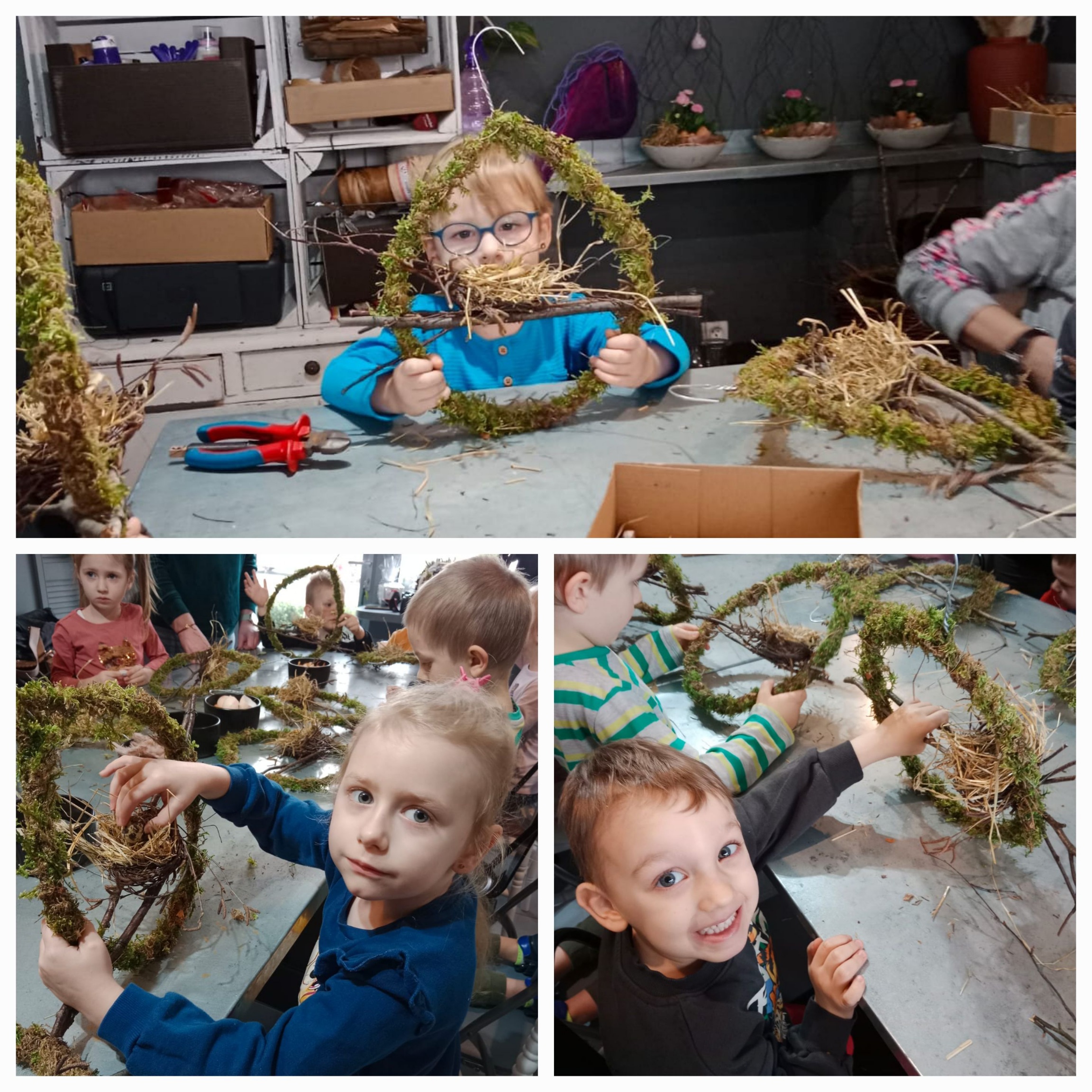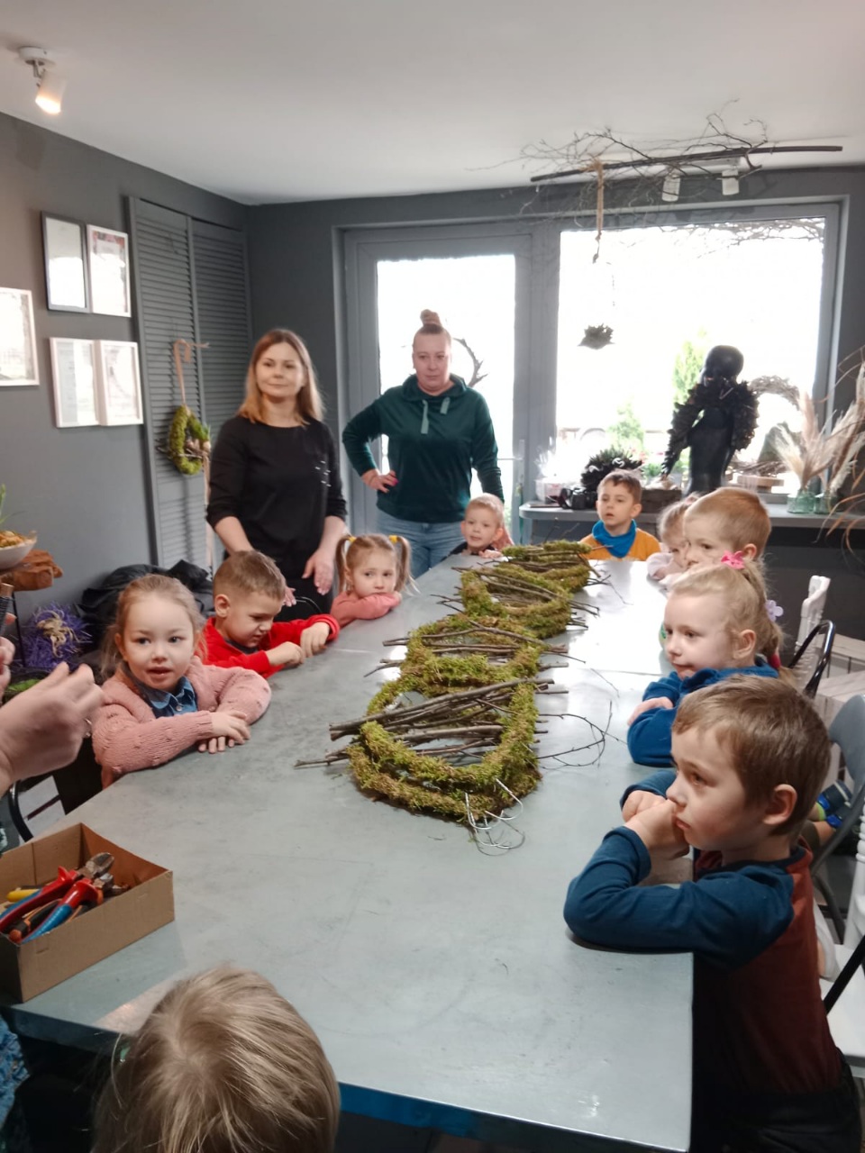 Dnia 22 marca przedszkolaki z oddziału „Mrówki”, udały się do kwiaciarni „Mięta do kwiatów” na warsztaty florystyczne. Gdzie pod czujnym okiem zawodowej florystki Pani Moniki Kasprzyk, dzieci maiły możliwość aktywnego uczestnictwa w niezwykle wyjątkowych warsztatach. Podczas tworzenia wianków świątecznych przedszkolaki manipulowały materiałem naturalnym i wykorzystały: mech, patyki, sianko, kwiaty i cebulki kwiatowe, jajeczka różnej wielkości i piórka. Dzieci doskonaliły technikę owijania materiału naturalnego na wianek za pomocą drucika. Każdy wianek był piękny i niepowtarzalny, a co najważniejsze samodzielnie wykonany i zabrany przez dzieci do domu. Dziękujemy Pani Monice za poświęcony czas i możliwość wykonania dekoracji pod fachowym okiem florysty.
