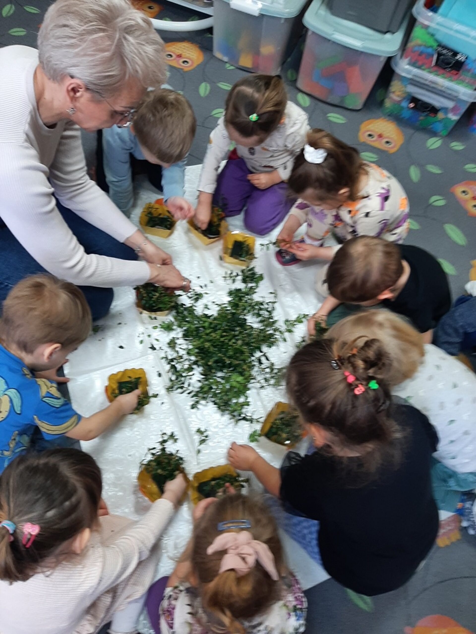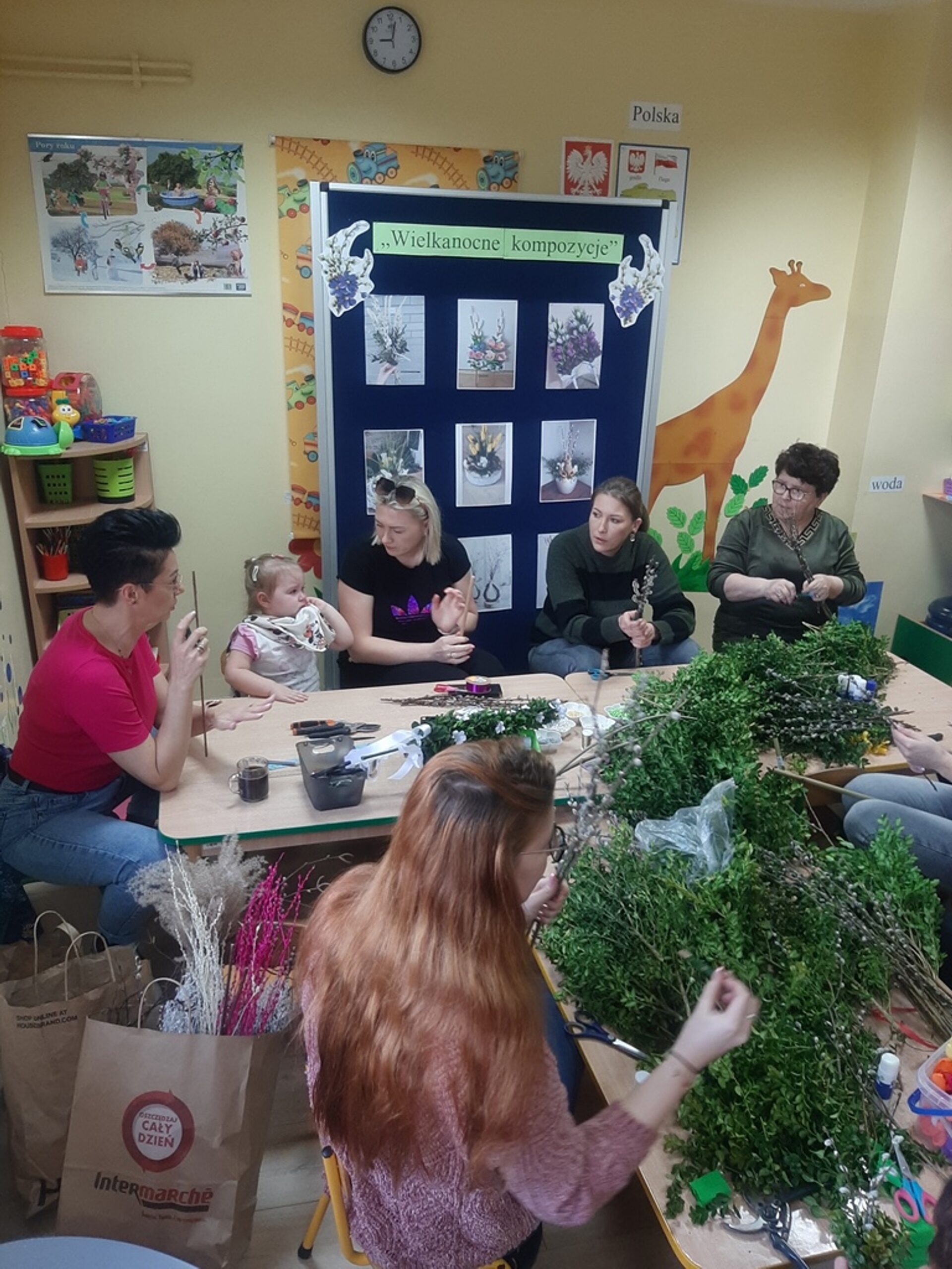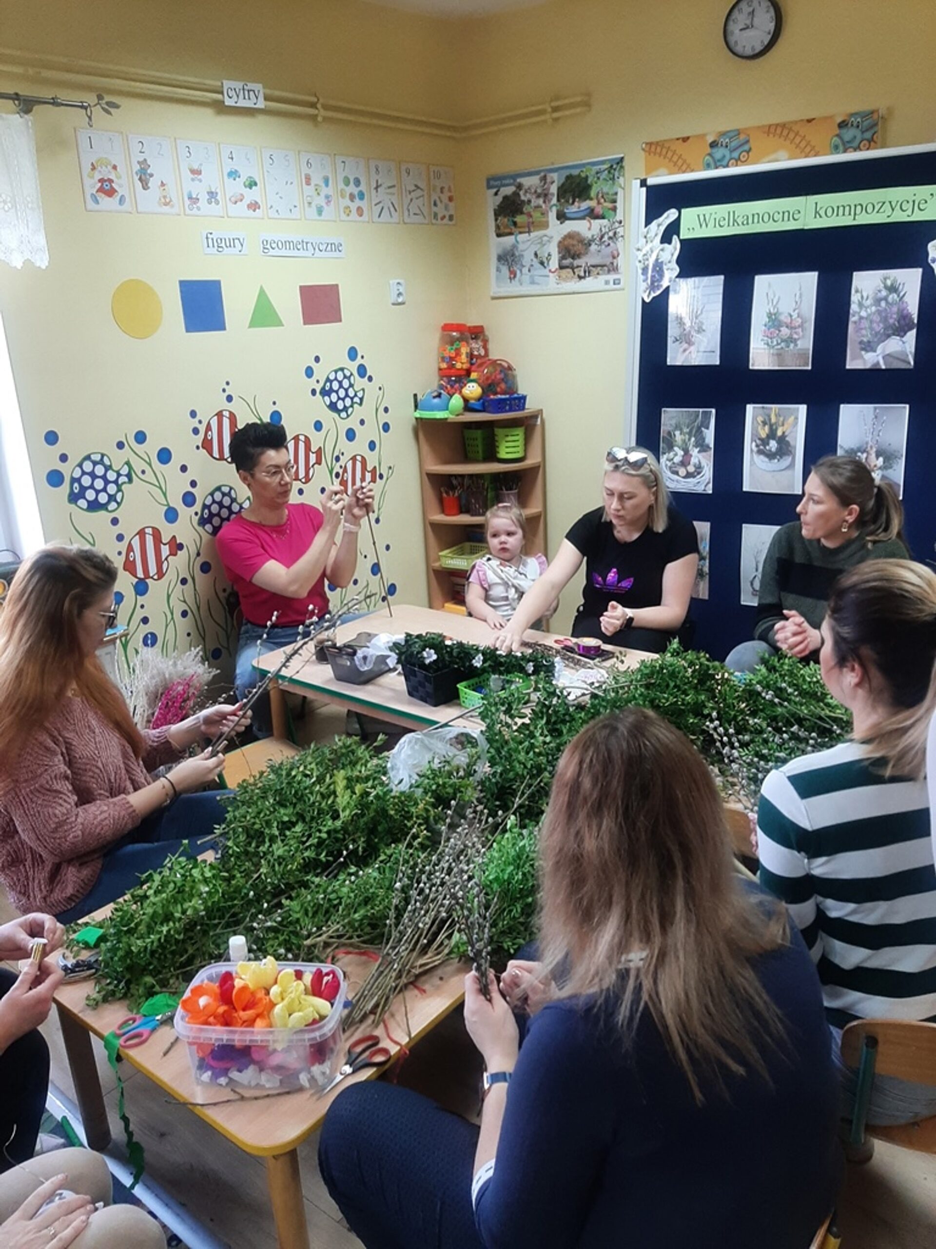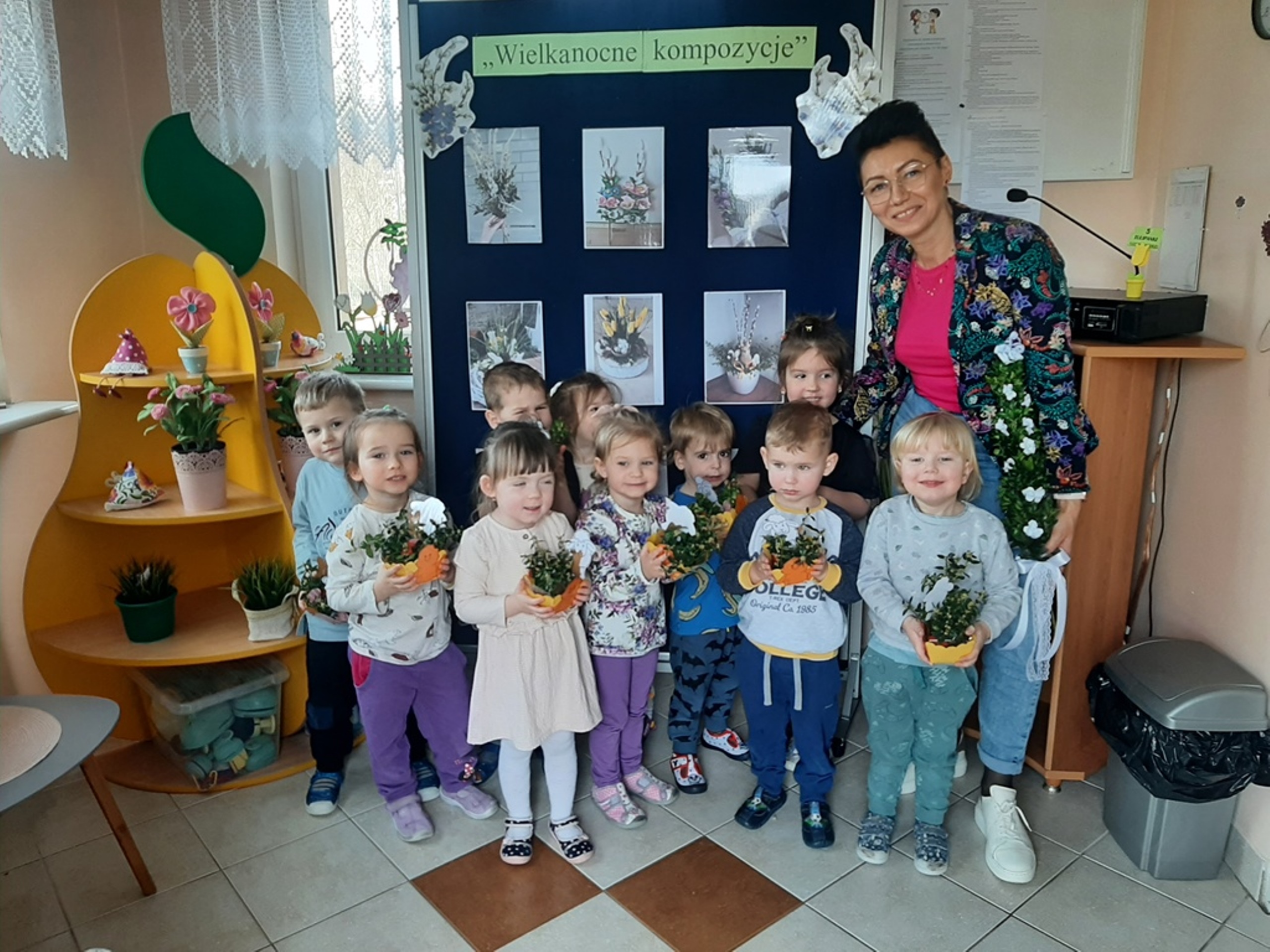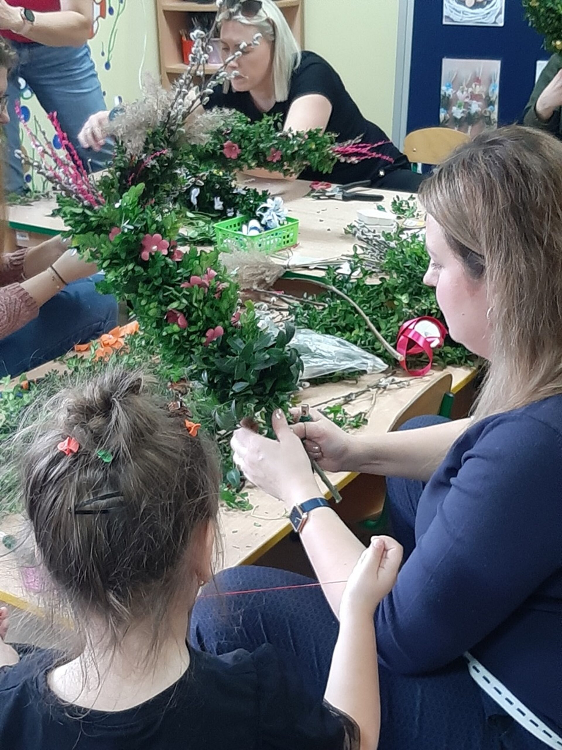 Dnia 20.03.2024r. w naszym przedszkolu – oddziale „Bratki” odbyły się wspaniałe warsztaty florystyczne. Warsztaty prowadziła pani Magdalena Kamińska. Dzieci miały okazję zapoznać się z zawodem florysty oraz sposobami uprawy roślin i kwiatów. Przedszkolaki bardzo chętnie uczestniczyły w zajęciach, wykonując przy tym powierzone im przez Panie zadania. W dalszej części warsztatów dzieci, krok po kroku same wykonały kompozycje wiosenne. Efekty pracy będą mogli podziwiać członkowie rodzin naszych podopiecznych na wielkanocnych stołach. Rodzice natomiast pod czujnym okiem pani Magdy wykonywały palmę wielkanocną z bukszpanu, bazi i kwiatów. Był to mile spędzony czas, podczas którego wszyscy dobrze się bawili.