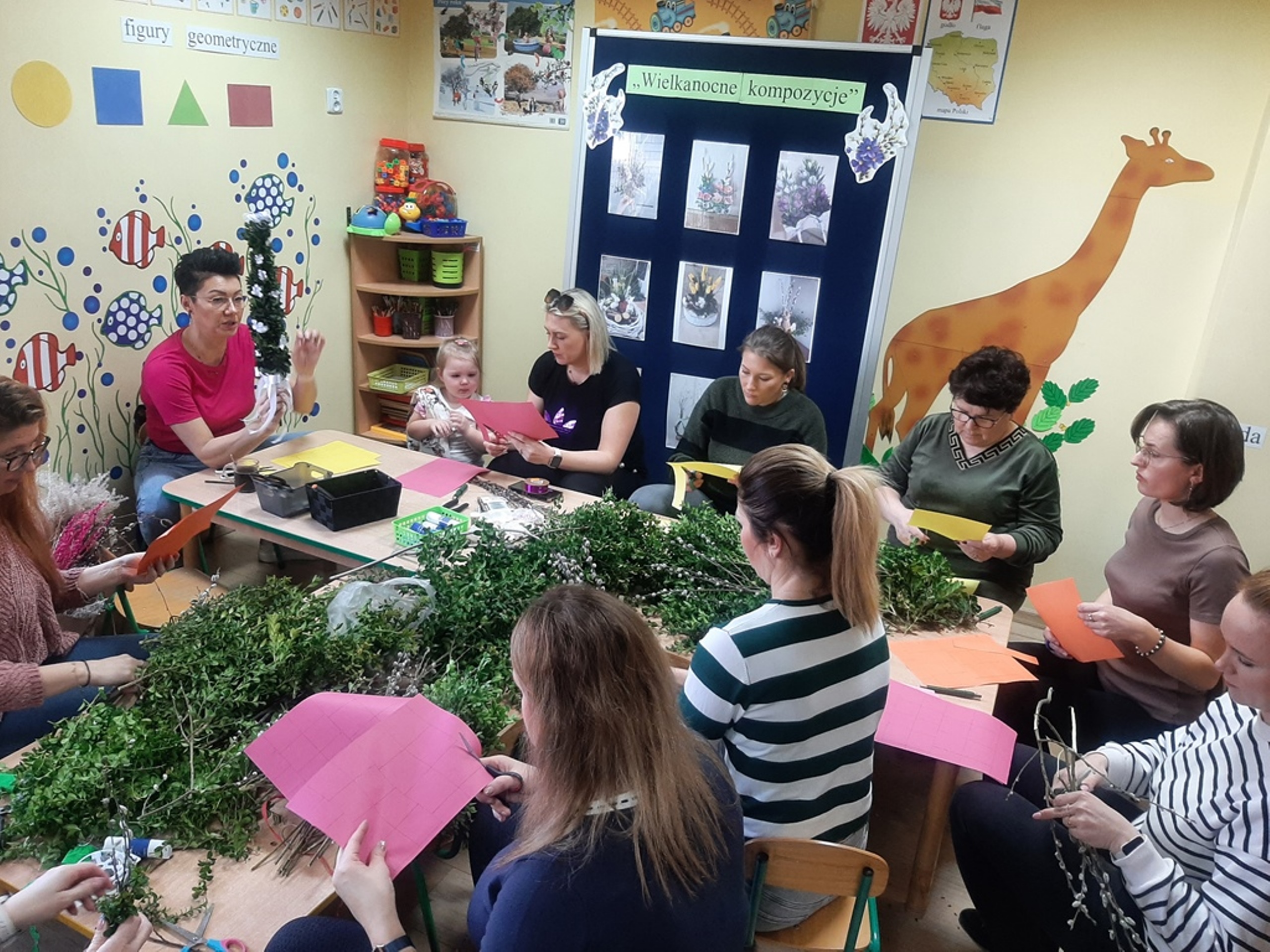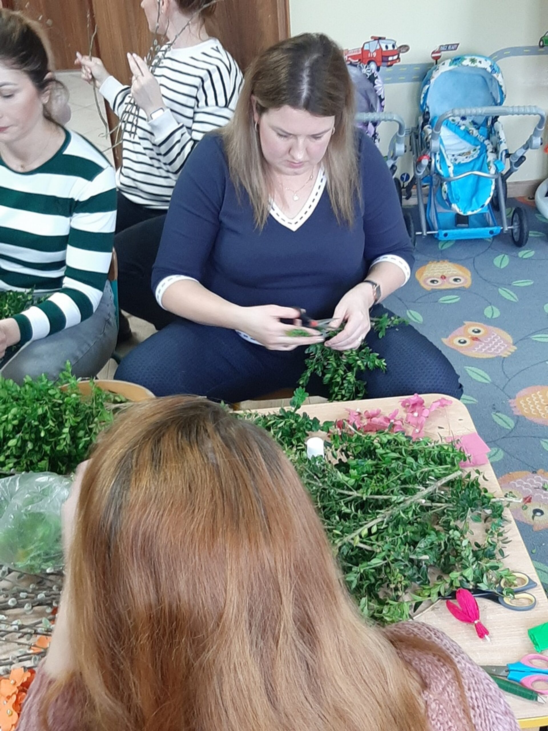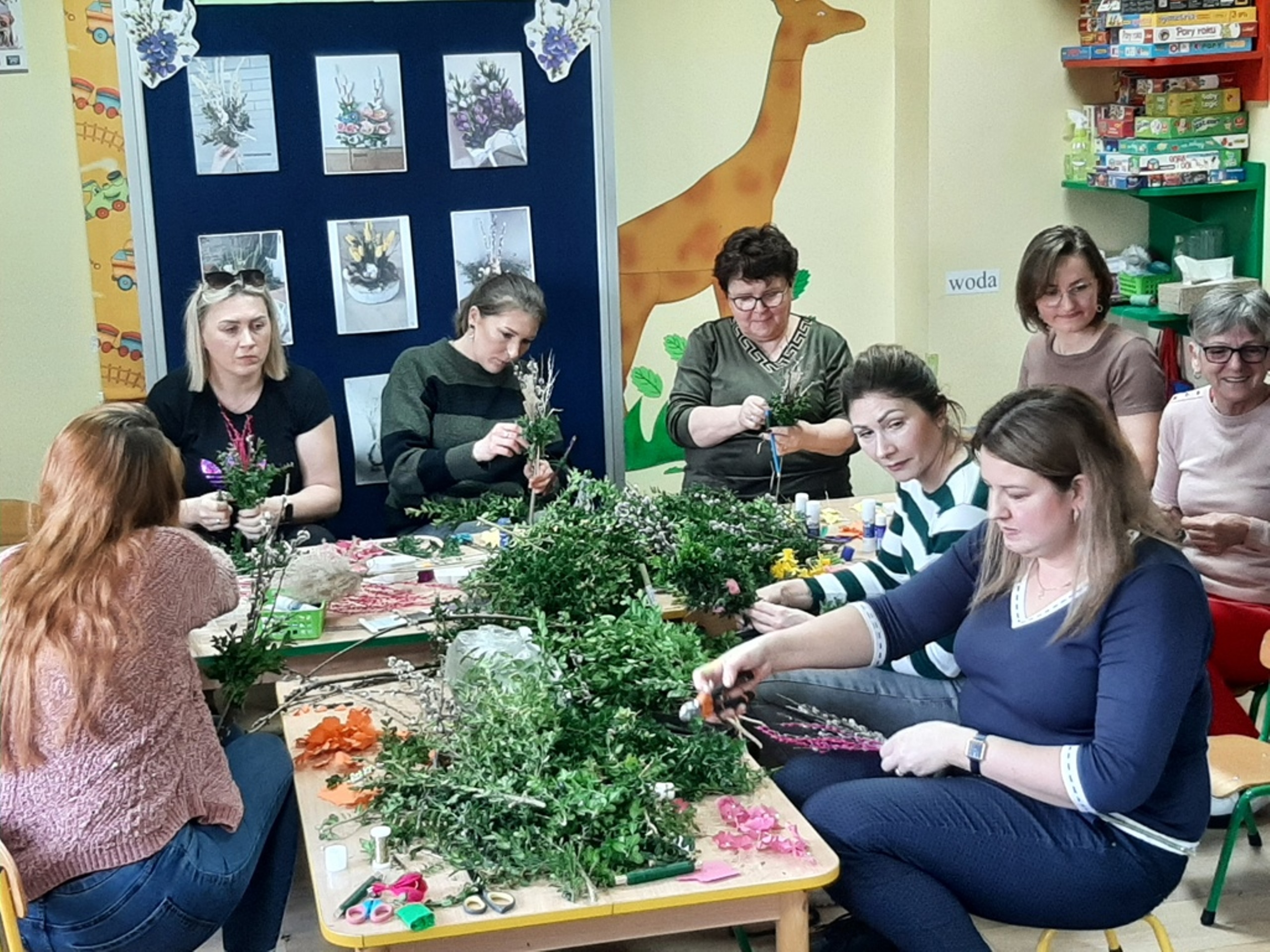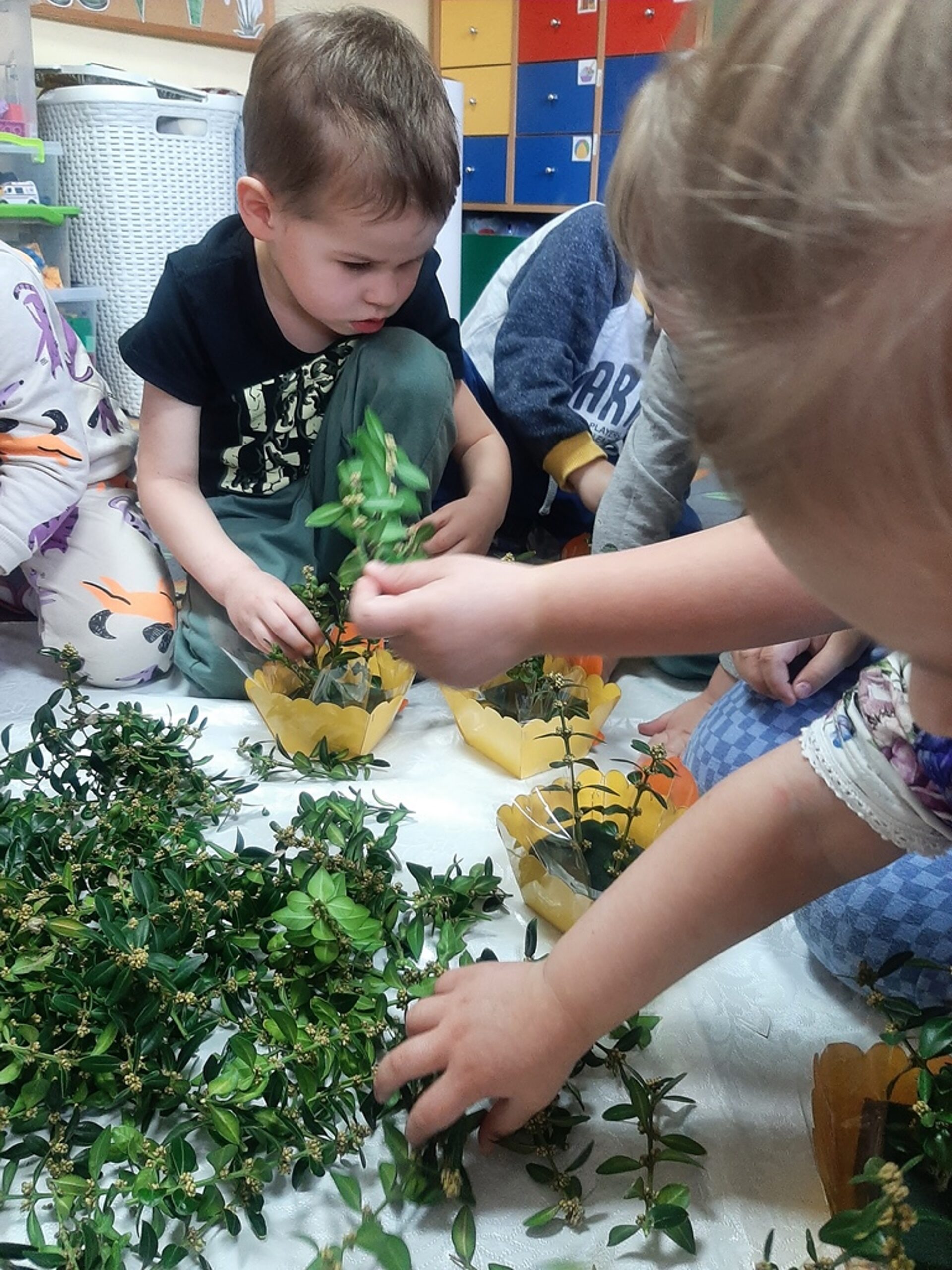 Dnia 20.03.2024r. w naszym przedszkolu – oddziale „Bratki” odbyły się wspaniałe warsztaty florystyczne. Warsztaty prowadziła pani Magdalena Kamińska. Dzieci miały okazję zapoznać się z zawodem florysty oraz sposobami uprawy roślin i kwiatów. Przedszkolaki bardzo chętnie uczestniczyły w zajęciach, wykonując przy tym powierzone im przez Panie zadania. W dalszej części warsztatów dzieci, krok po kroku same wykonały kompozycje wiosenne. Efekty pracy będą mogli podziwiać członkowie rodzin naszych podopiecznych na wielkanocnych stołach. Rodzice natomiast pod czujnym okiem pani Magdy wykonywały palmę wielkanocną z bukszpanu, bazi i kwiatów. Był to mile spędzony czas, podczas którego wszyscy dobrze się bawili.