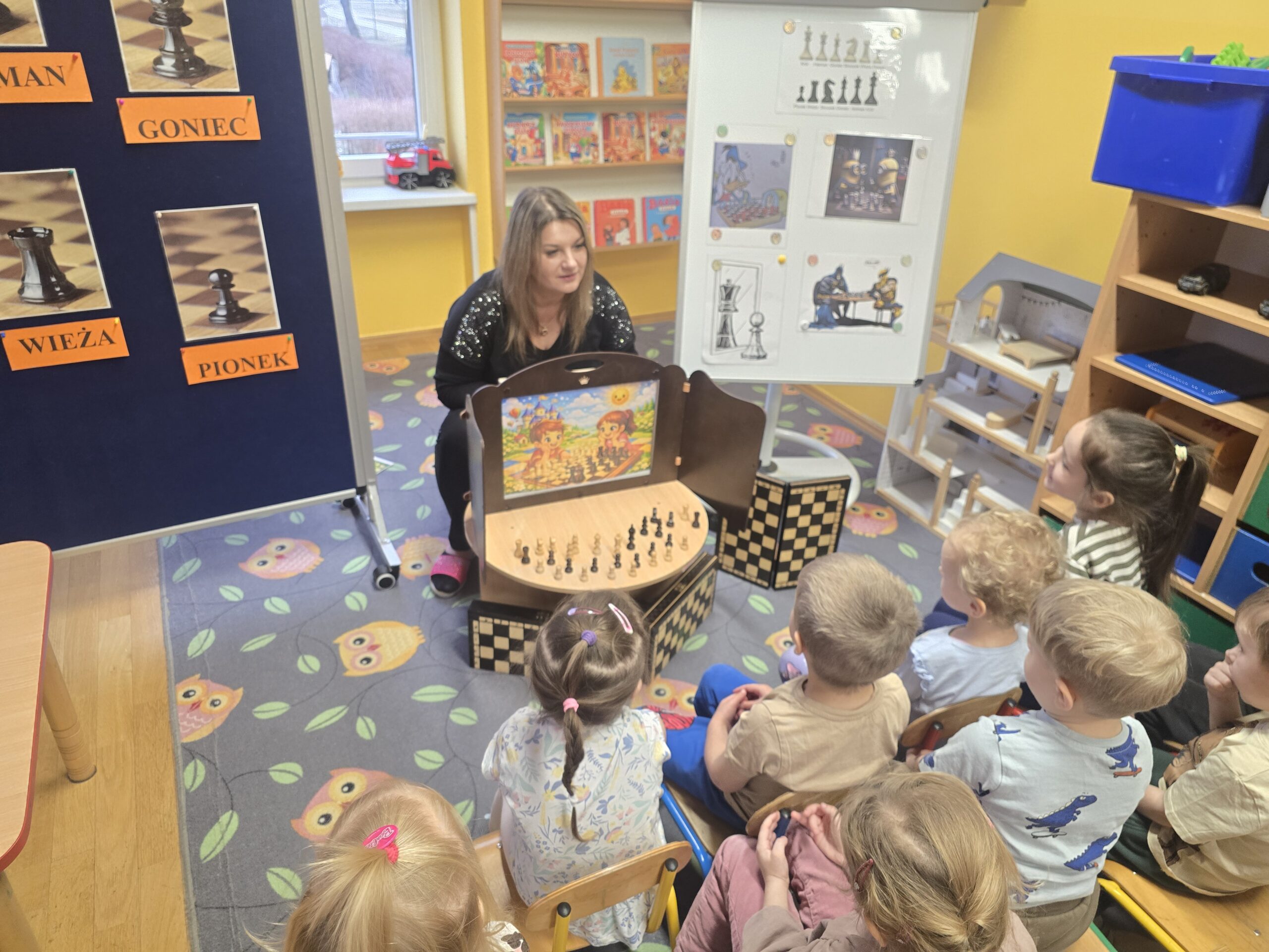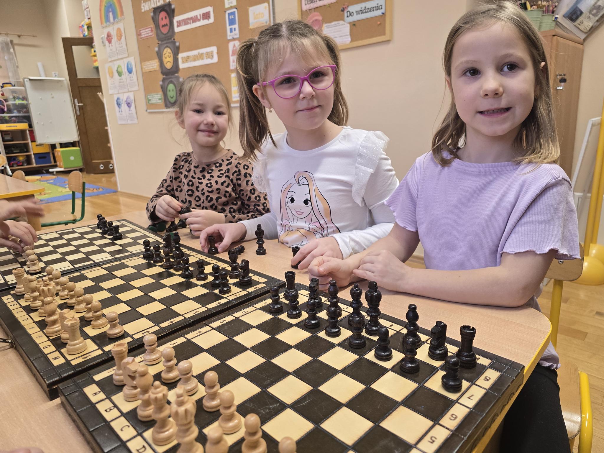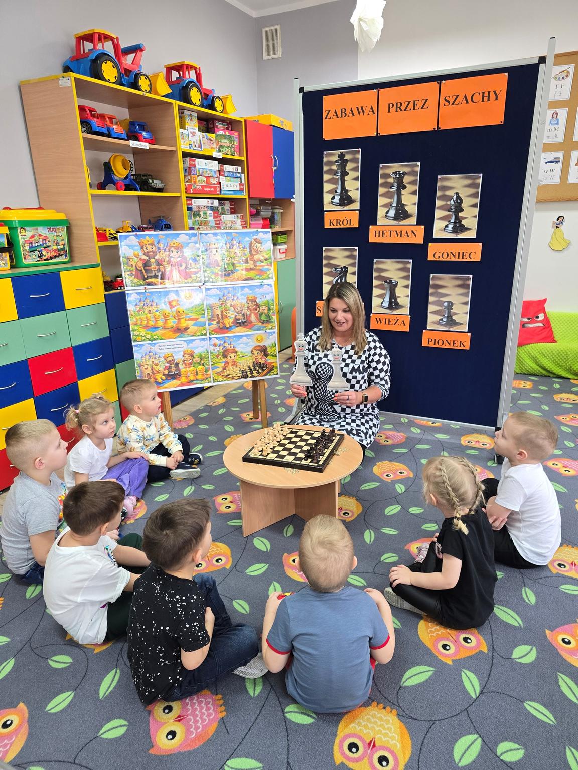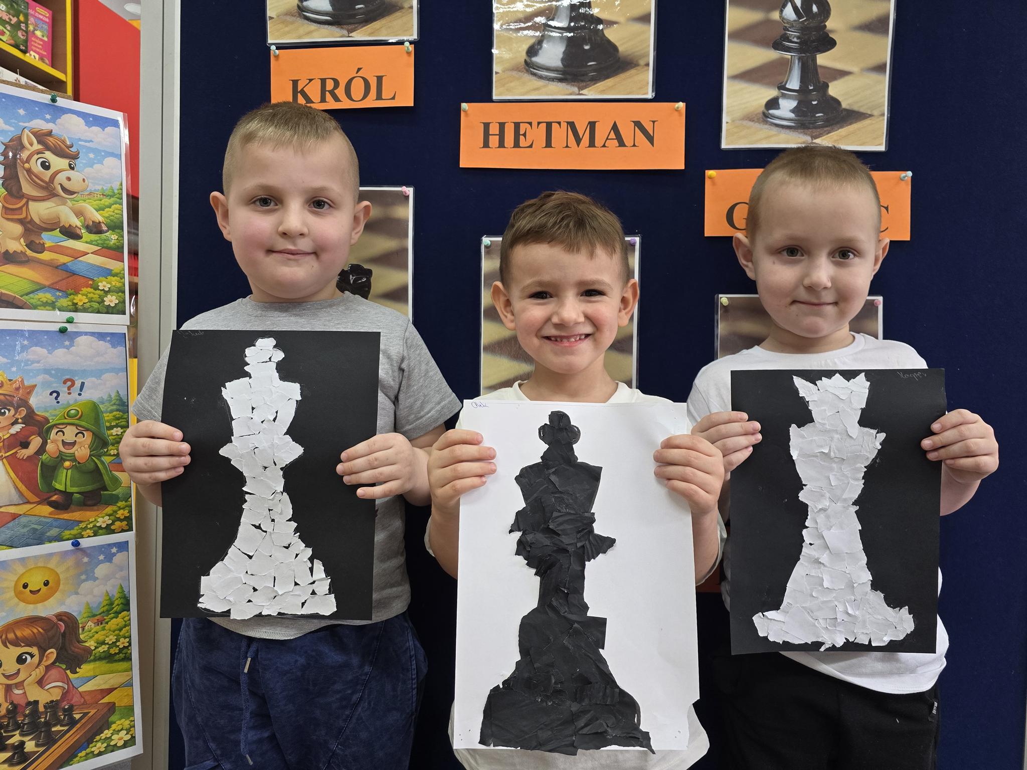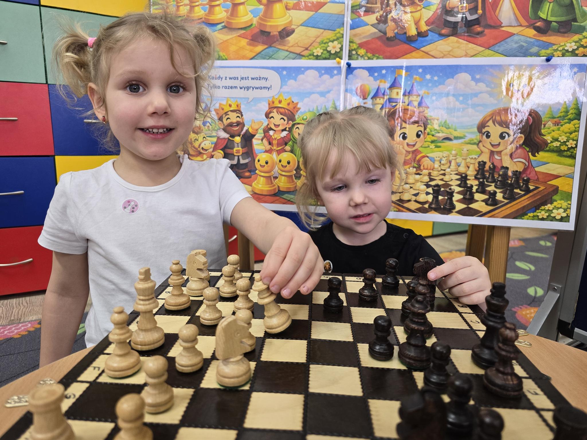 Każda figura stała się bohaterem bajkowej historii – od odważnego króla, przez mądrą królową, aż po dzielne pionki. Dzieci z ogromnym zaangażowaniem uczestniczyły w zabawach dydaktycznych, układały figury na szachownicy, odgrywały role oraz uczyły się zasad współpracy i cierpliwości.