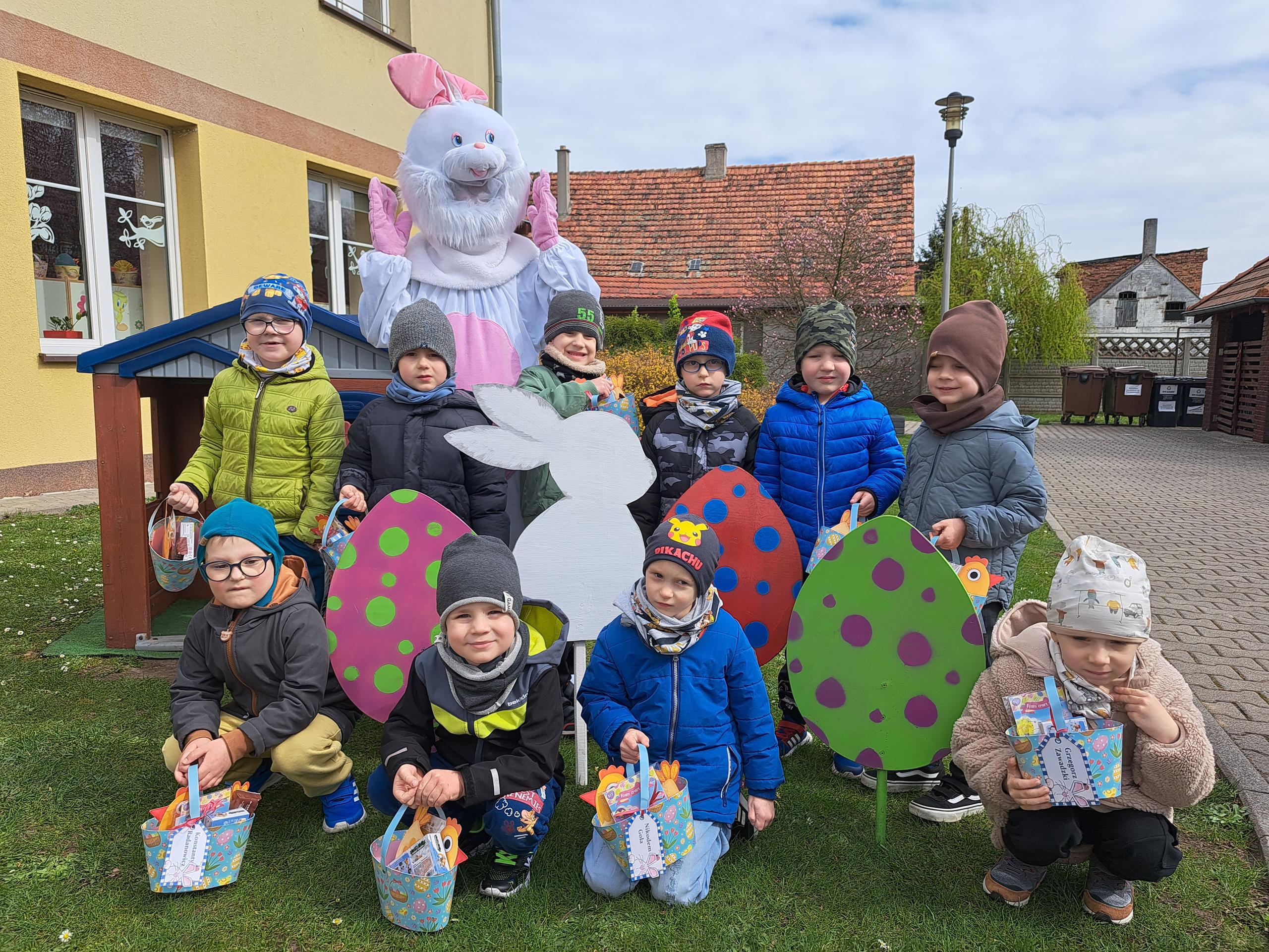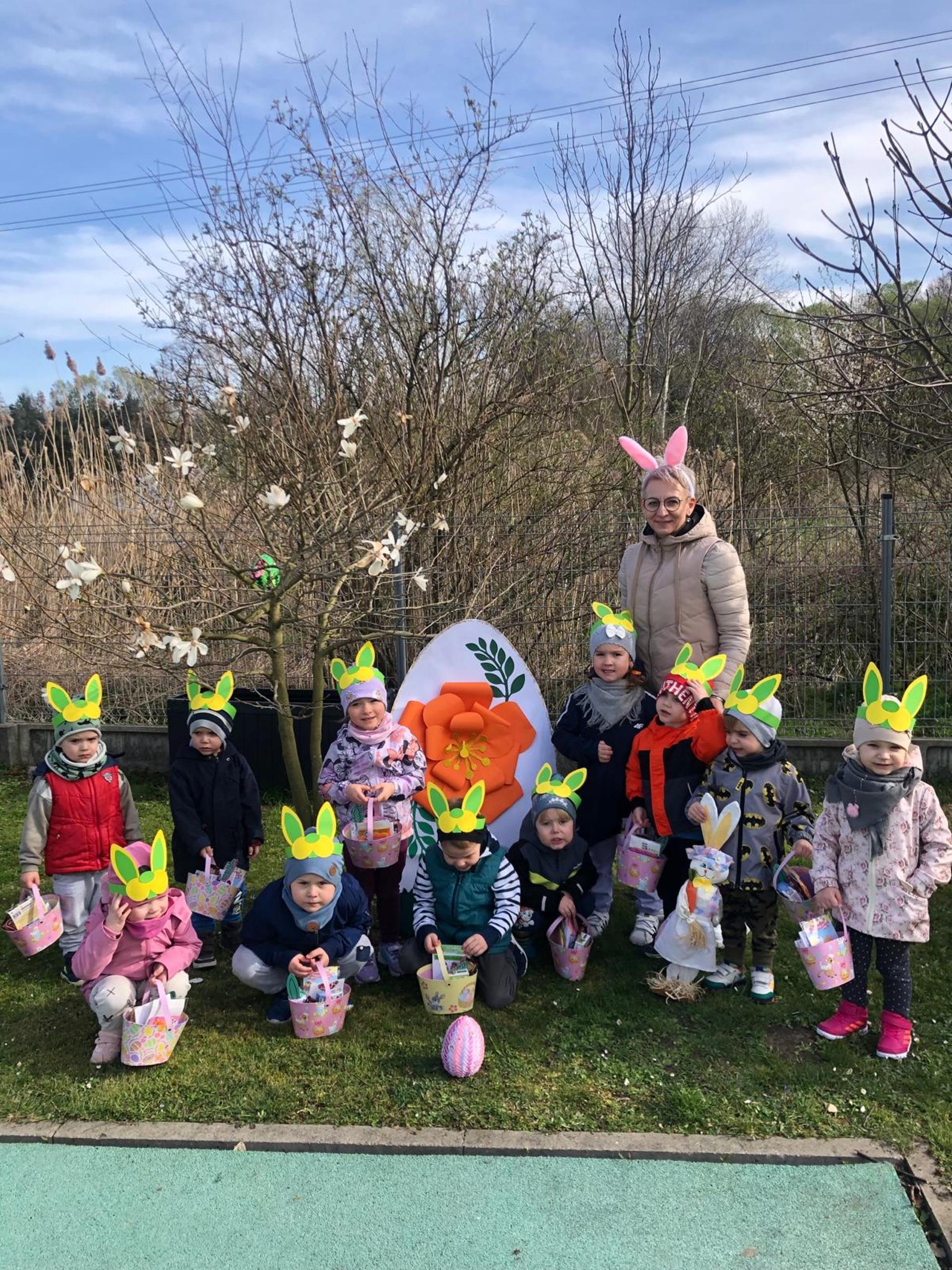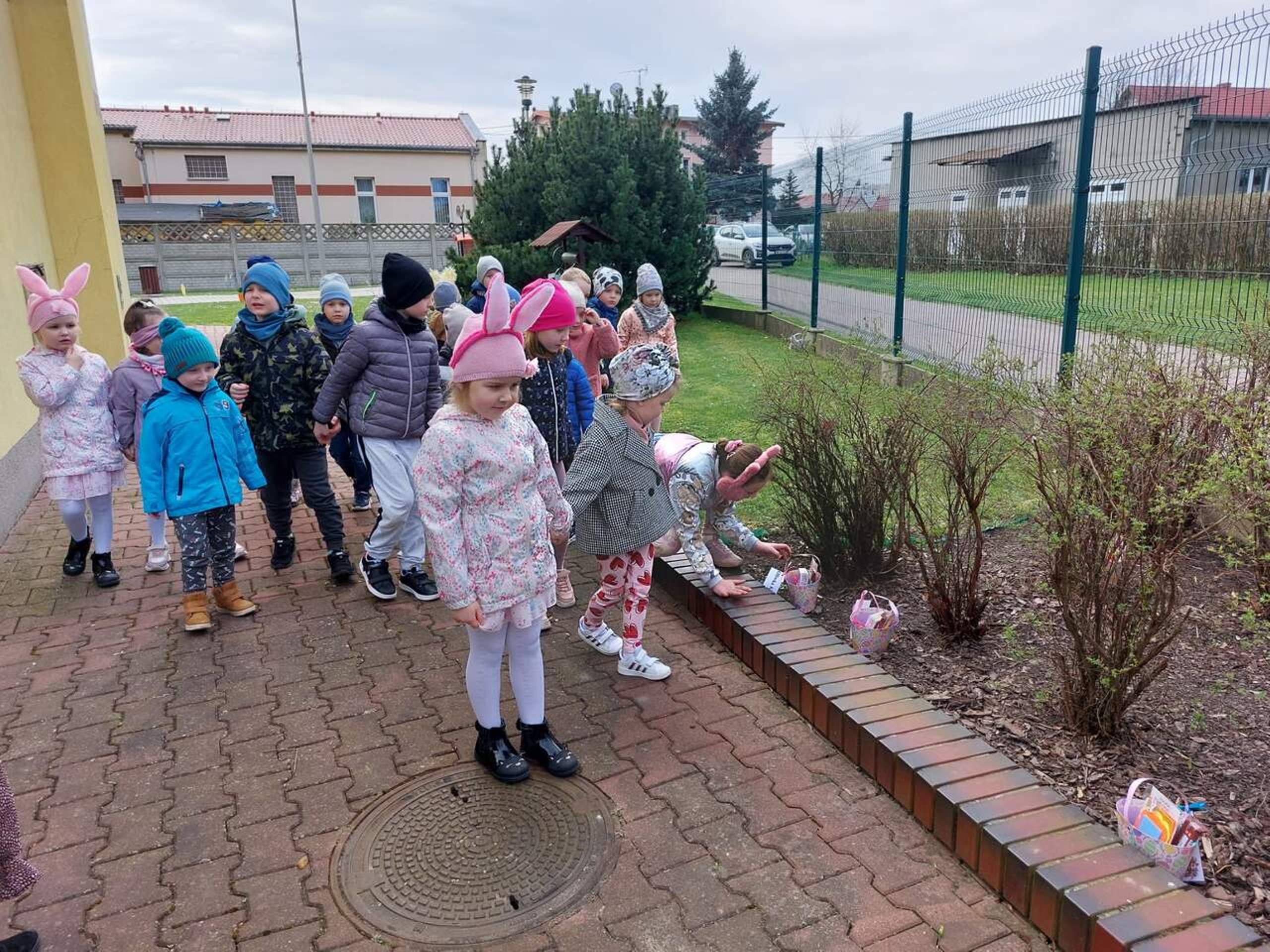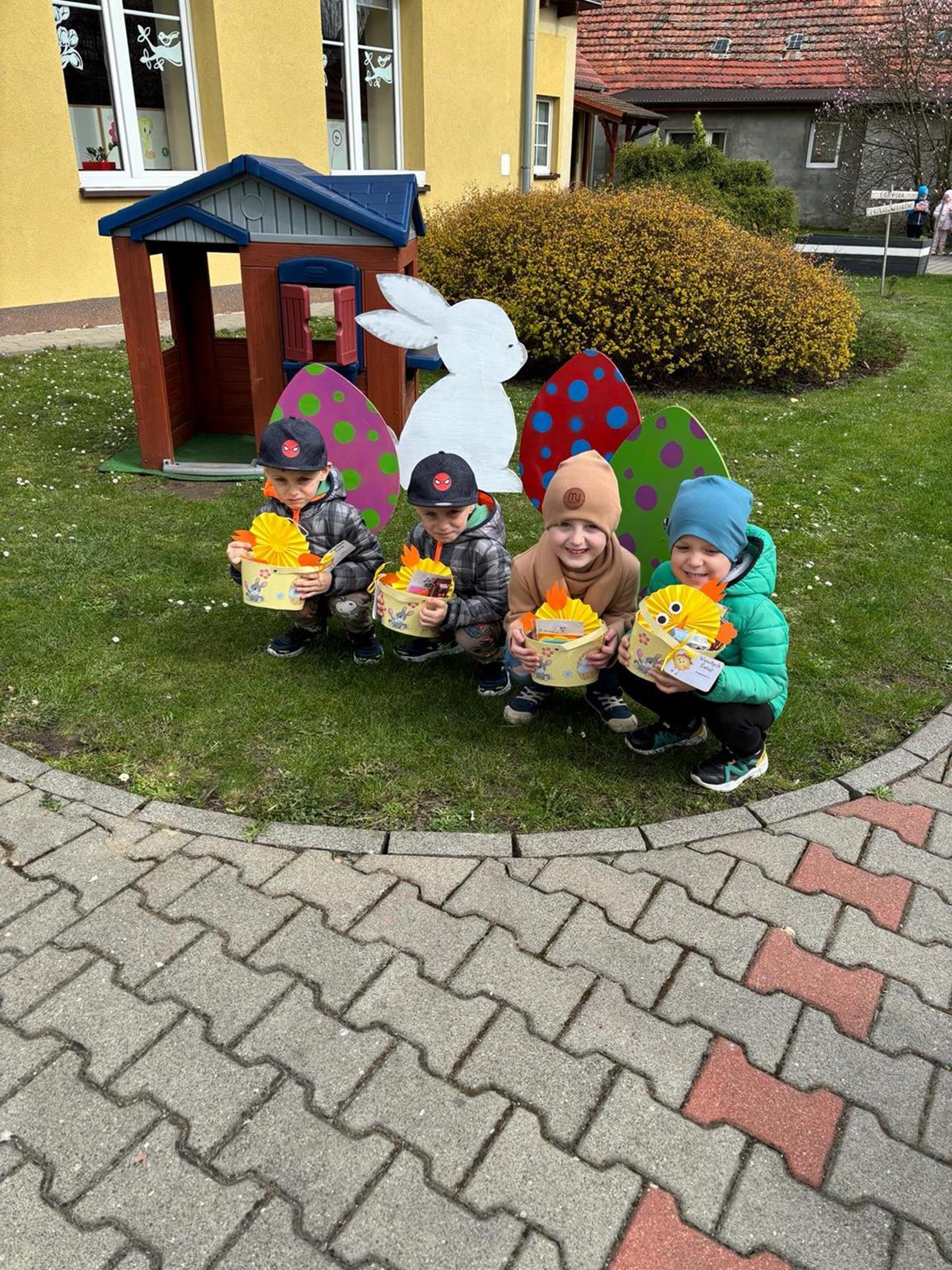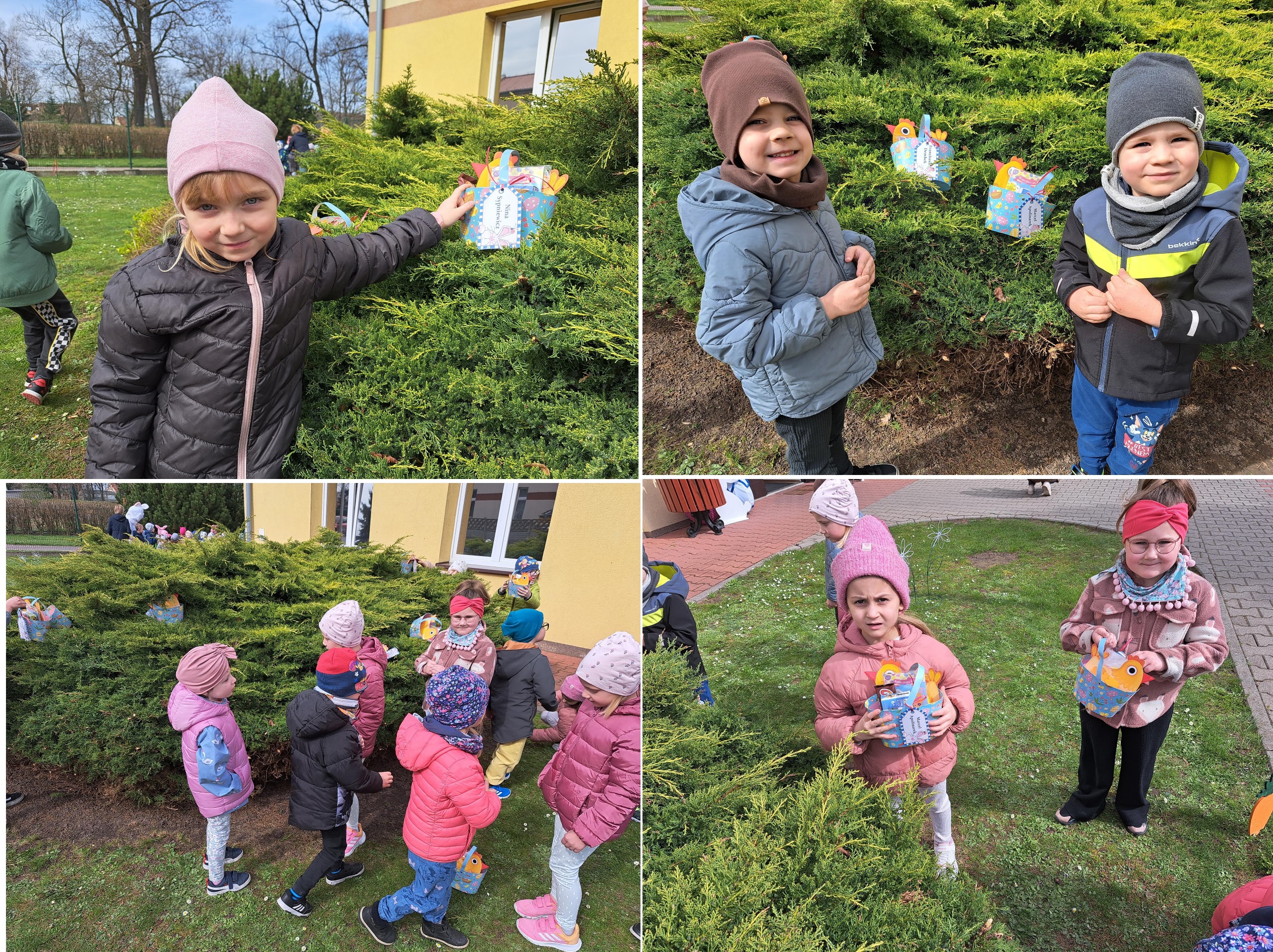 Przedszkolaki już od rana z niecierpliwością czekały na wizytę Zajączka. Kiedy wyszły na przedszkolne place okazało się, że już tam był i w zakamarkach podwórek ukrył koszyczki