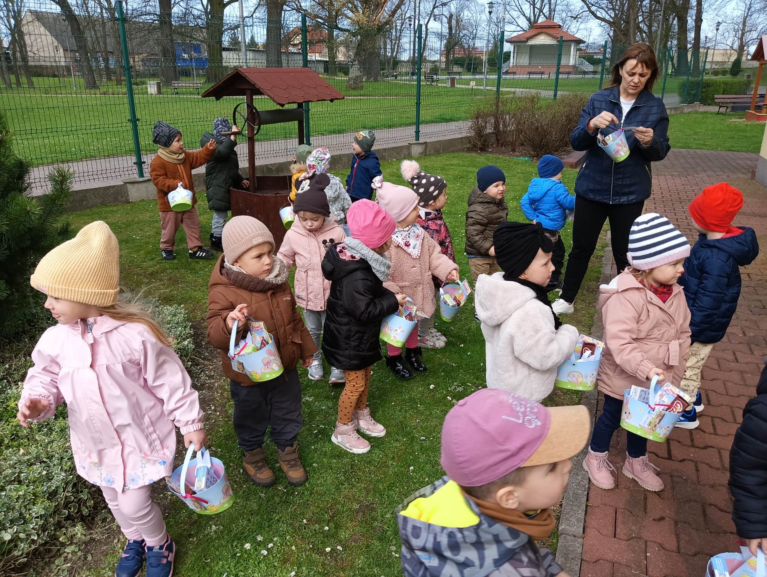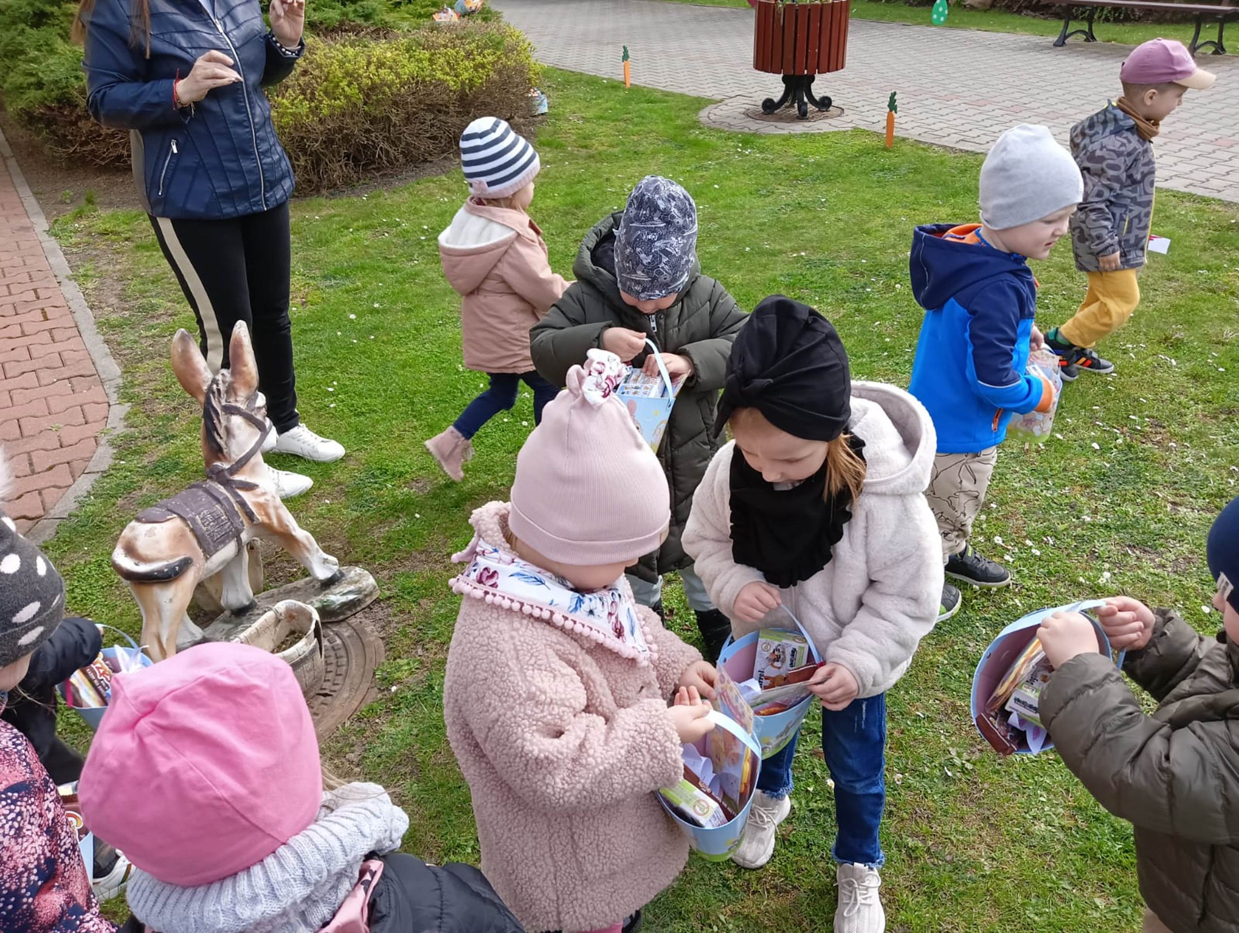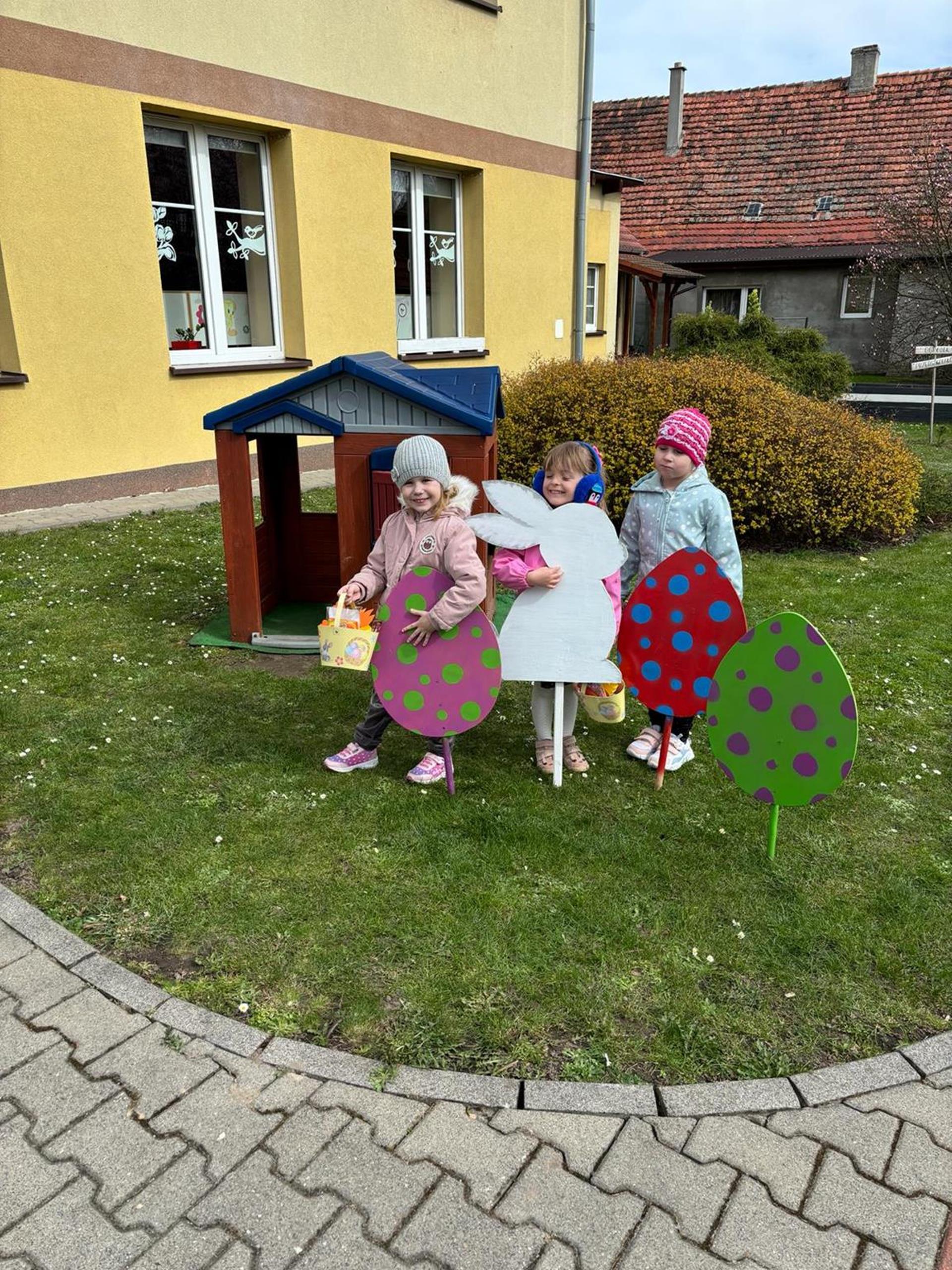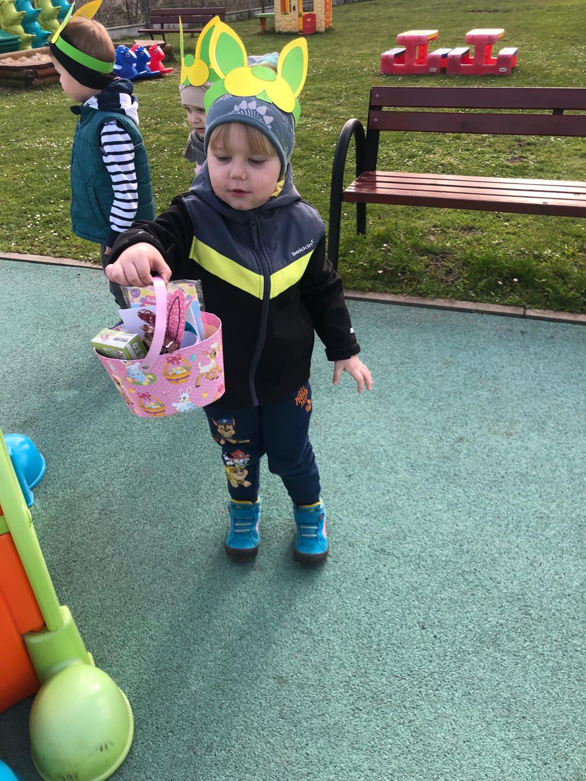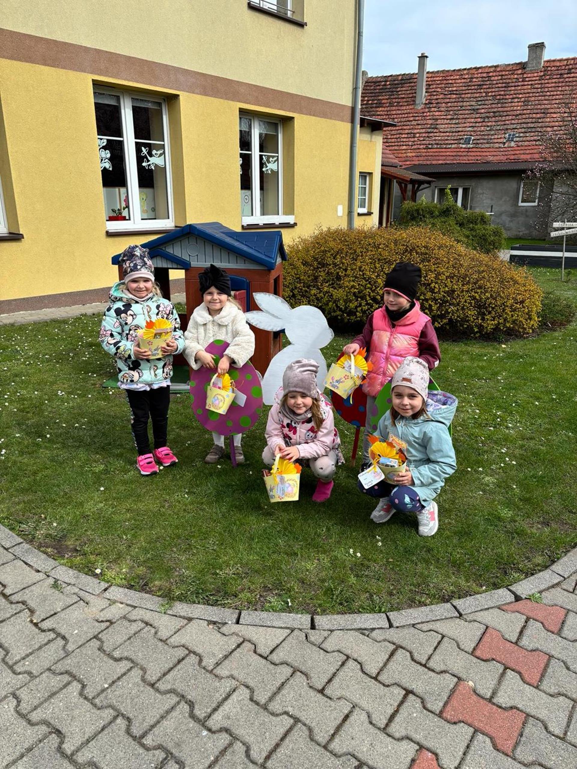 Przedszkolaki już od rana z niecierpliwością czekały na wizytę Zajączka. Kiedy wyszły na przedszkolne place okazało się, że już tam był i w zakamarkach podwórek ukrył koszyczki