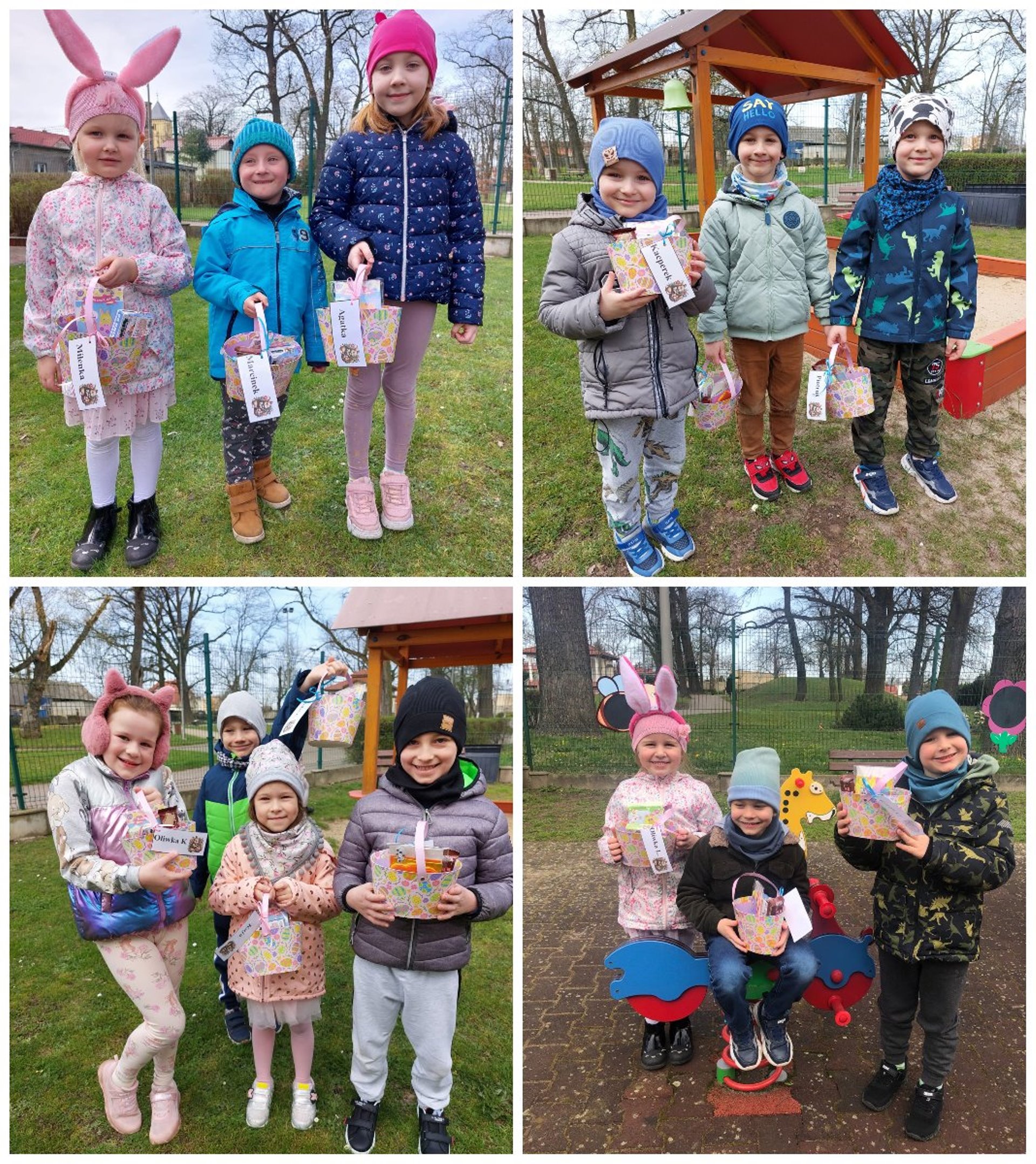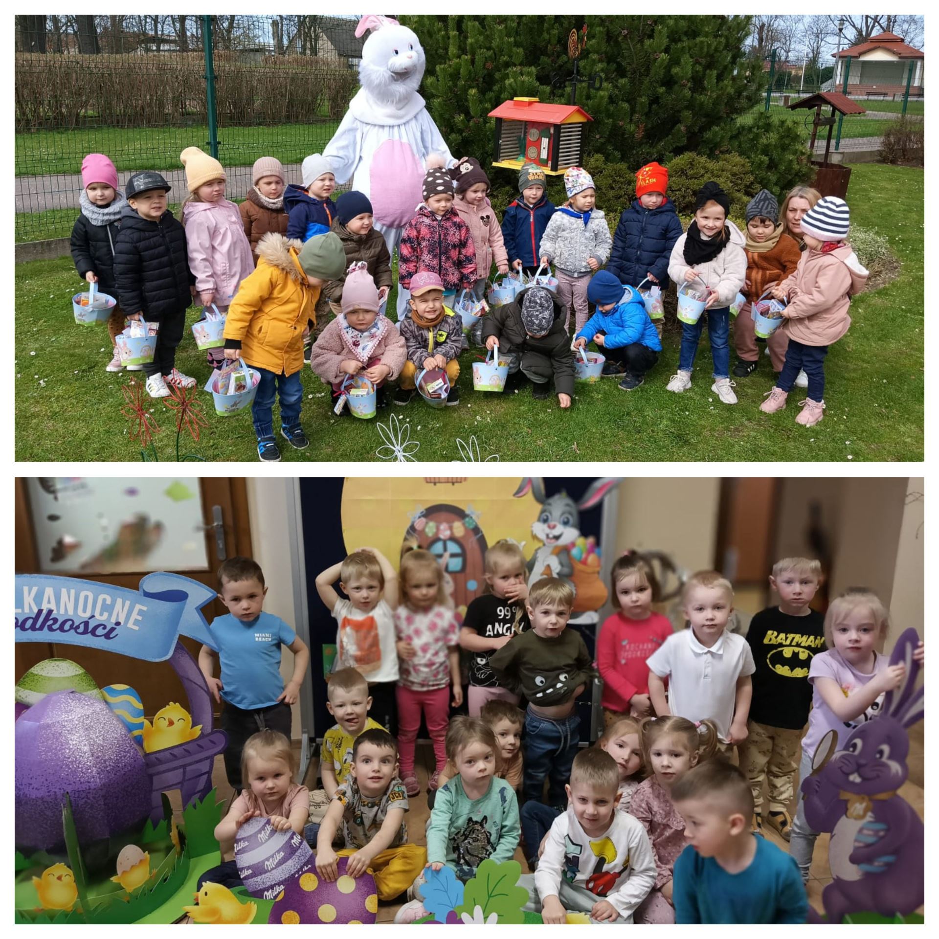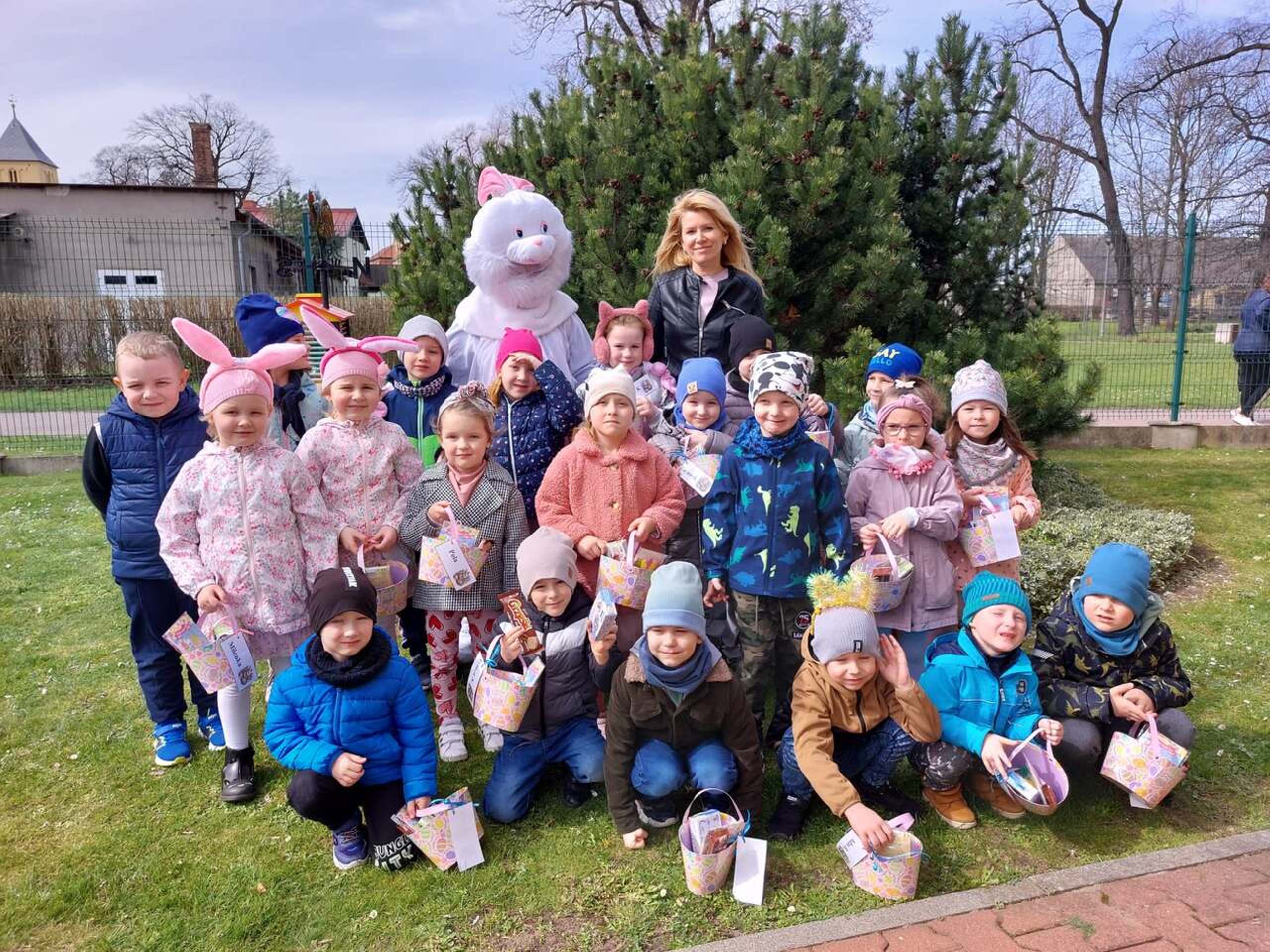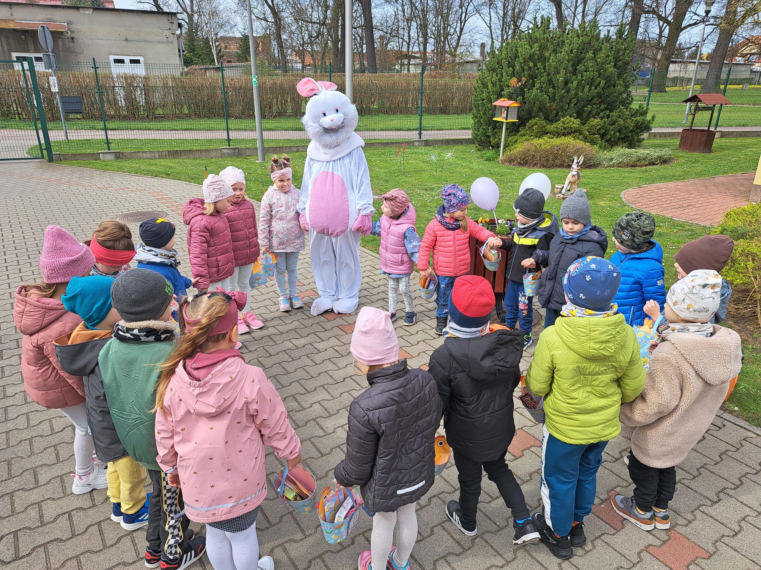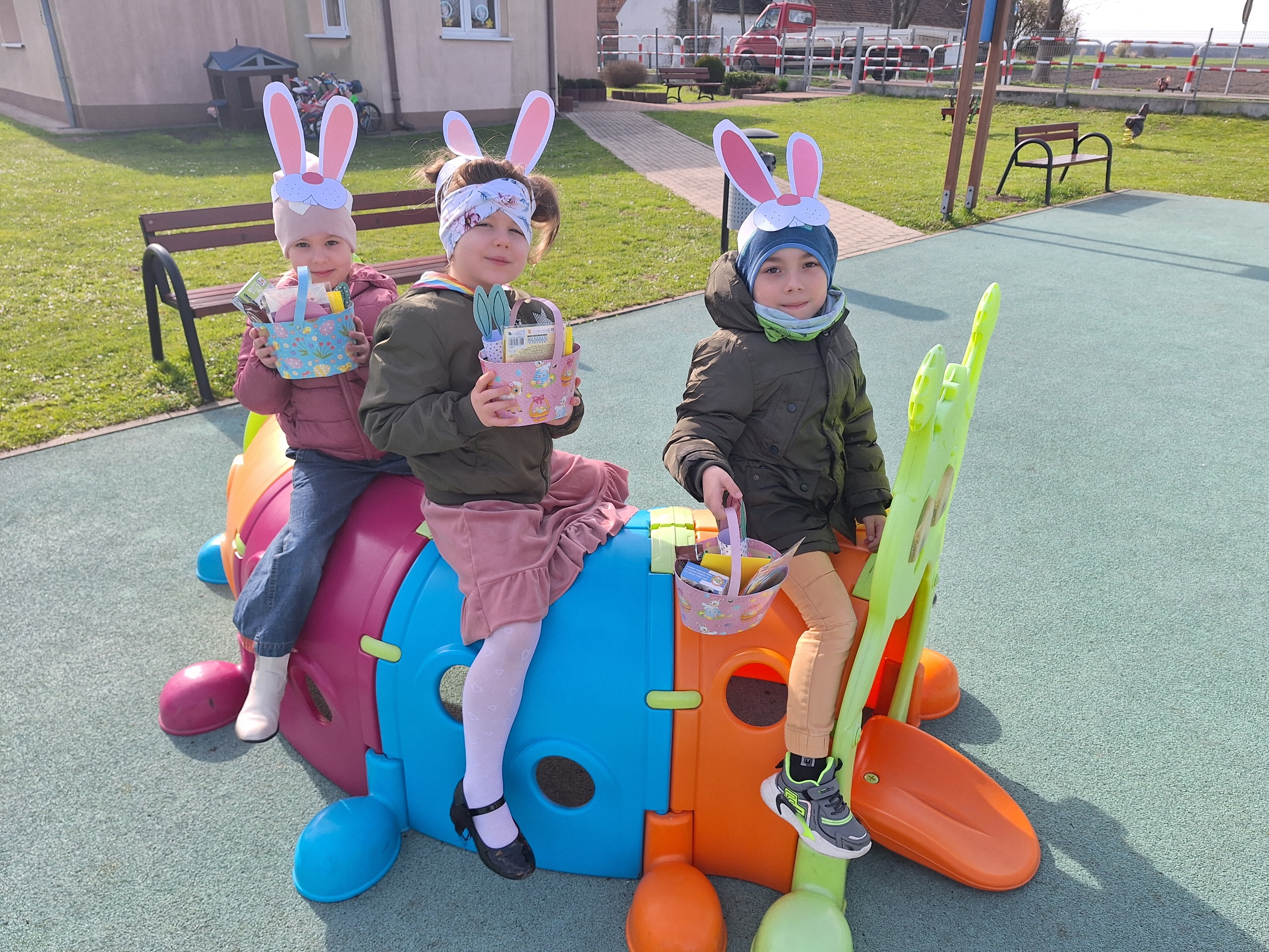 Przedszkolaki już od rana z niecierpliwością czekały na wizytę Zajączka. Kiedy wyszły na przedszkolne place okazało się, że już tam był i w zakamarkach podwórek ukrył koszyczki