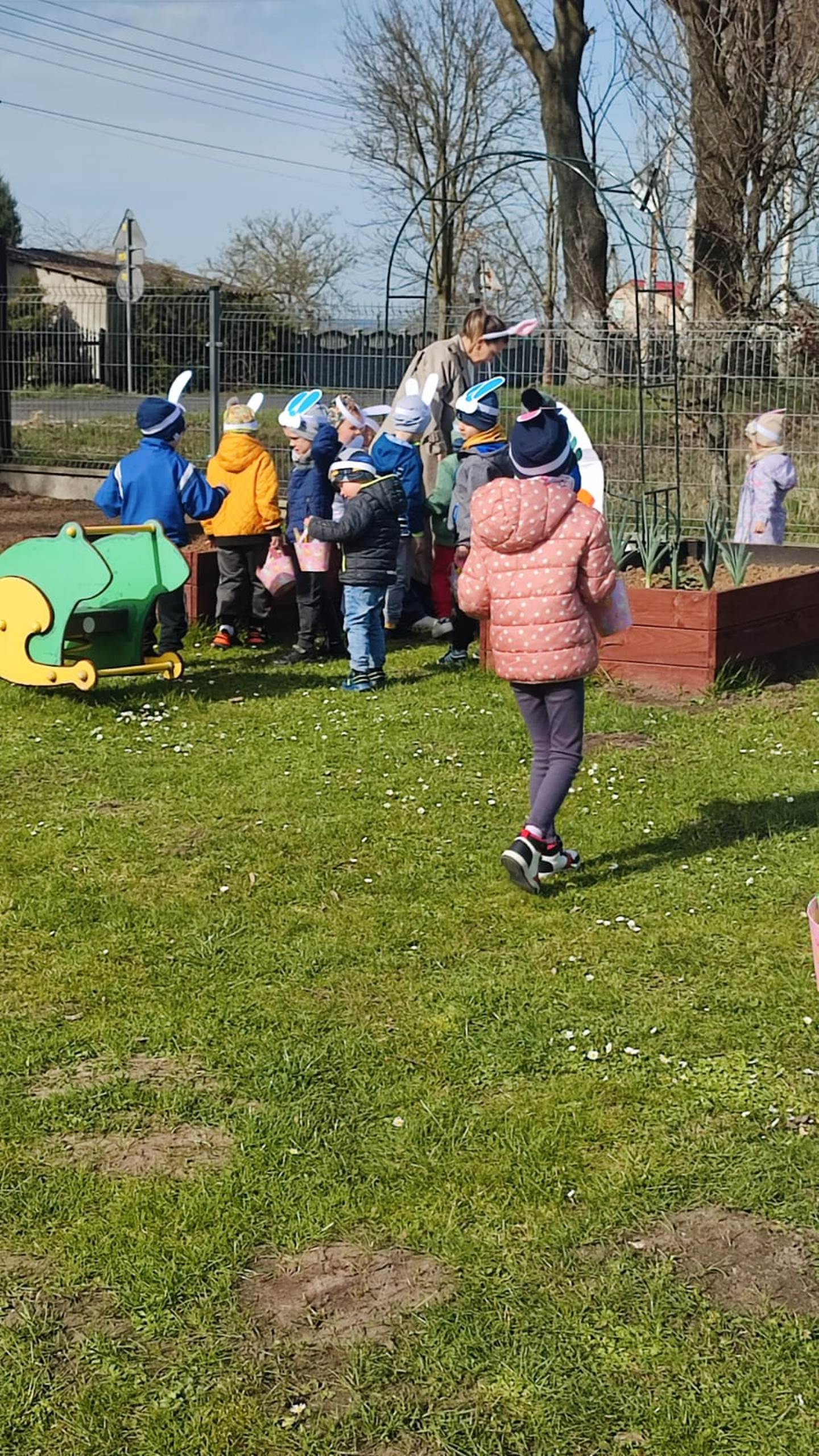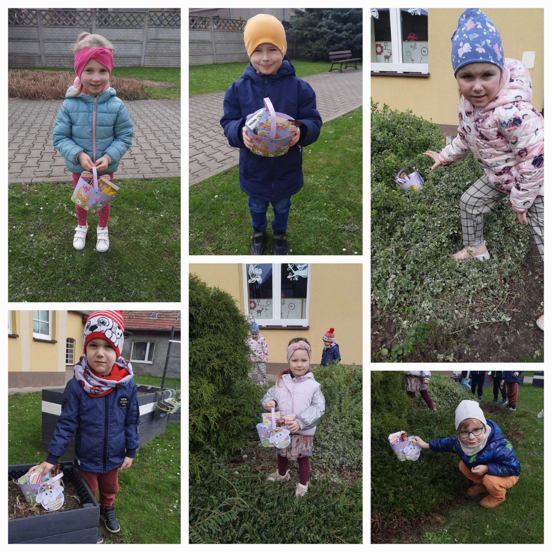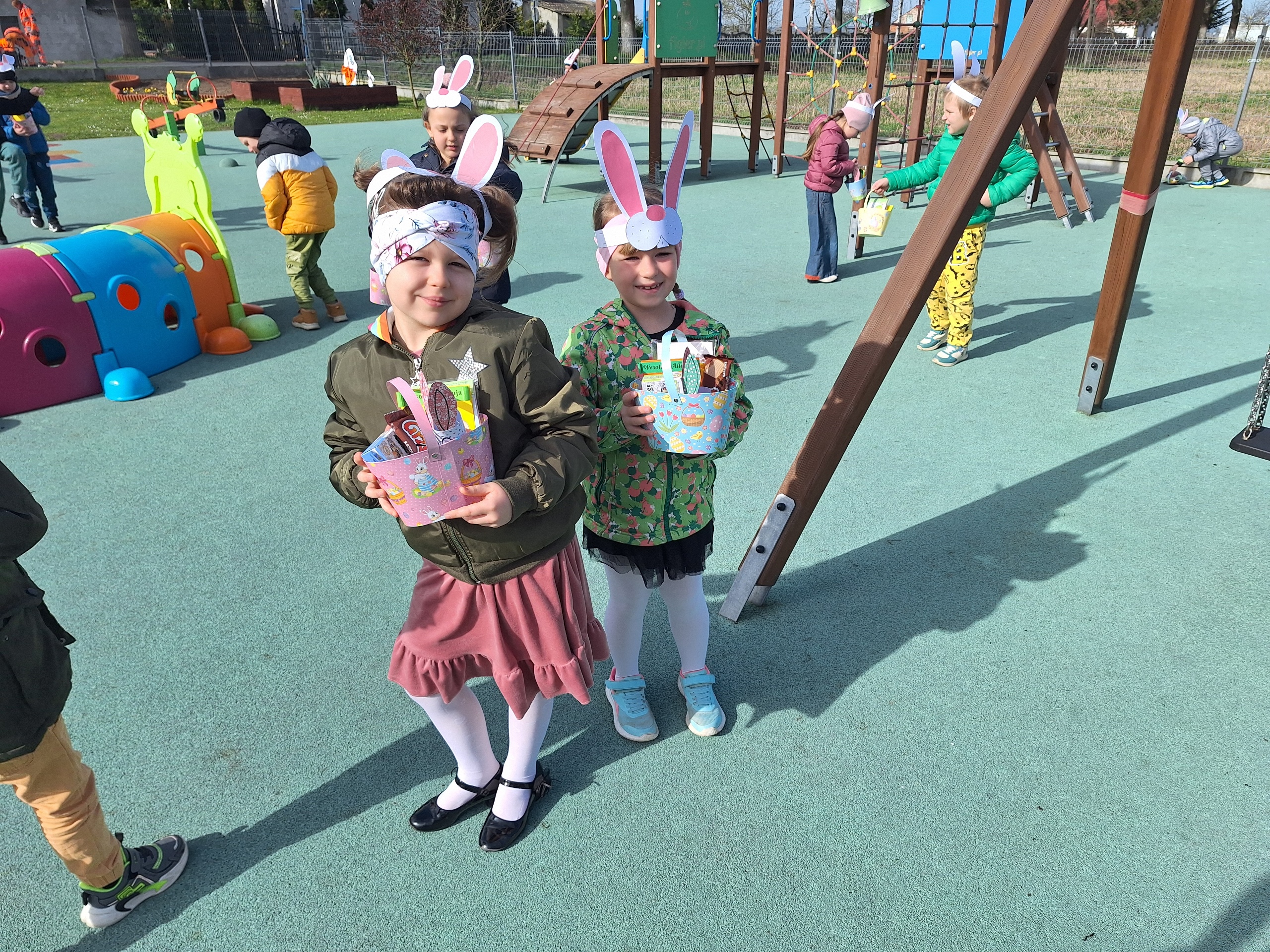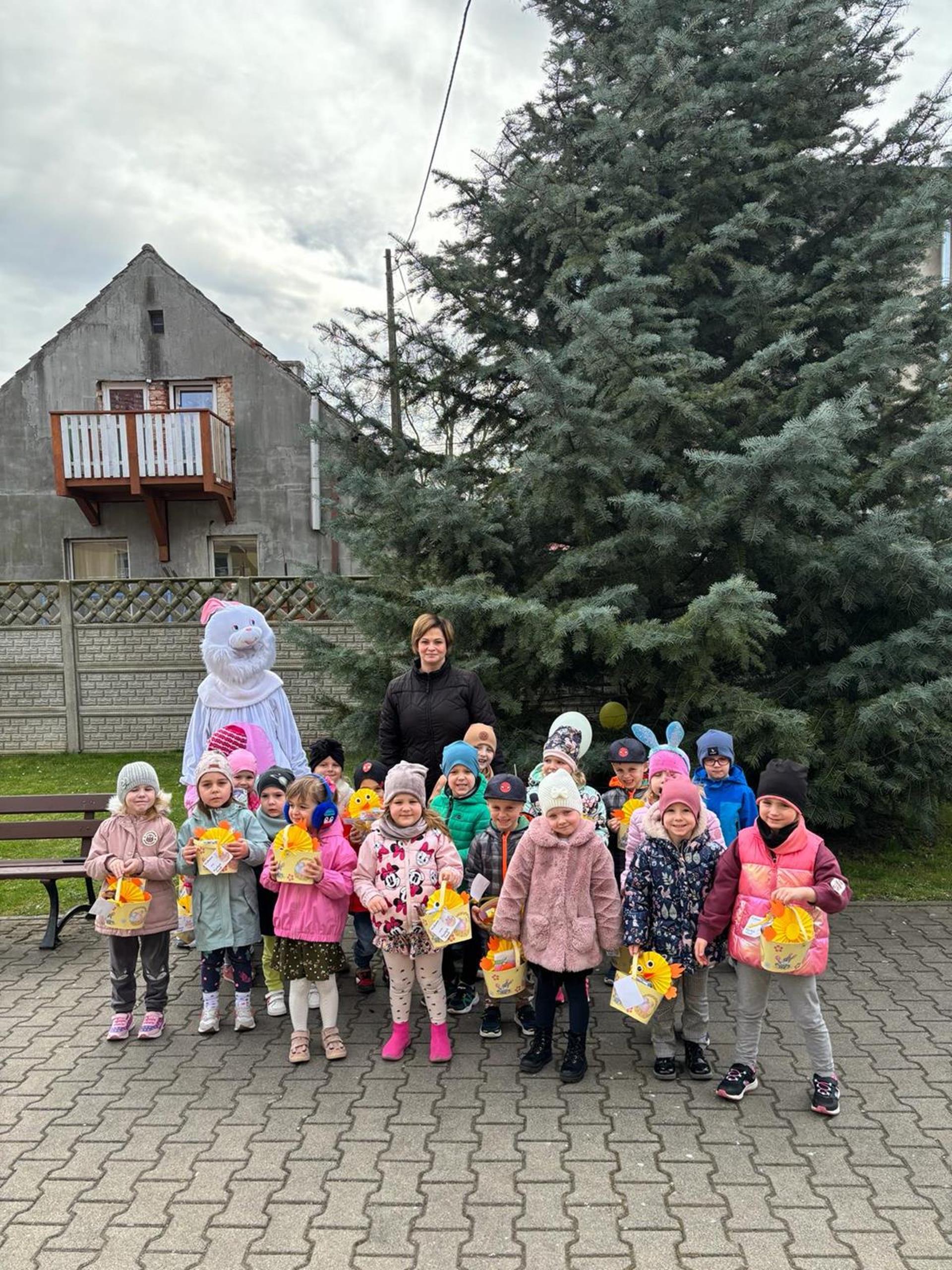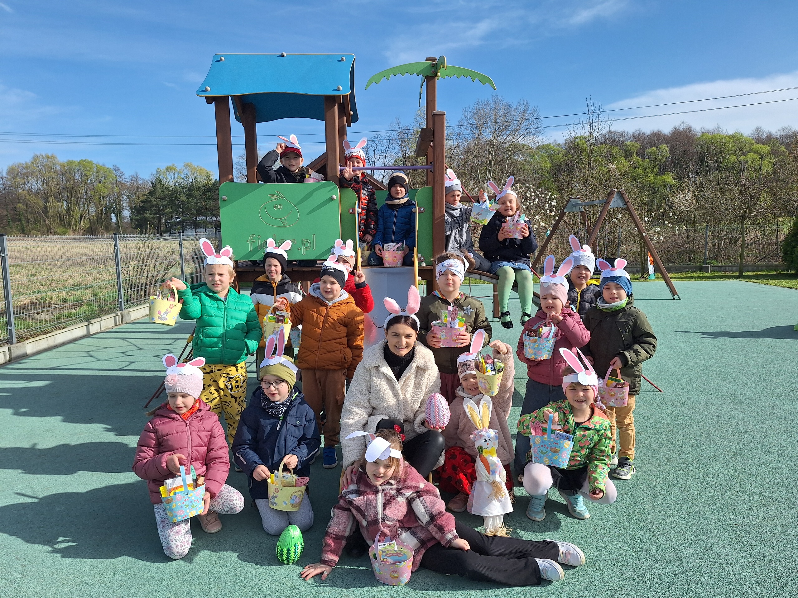 Przedszkolaki już od rana z niecierpliwością czekały na wizytę Zajączka. Kiedy wyszły na przedszkolne place okazało się, że już tam był i w zakamarkach podwórek ukrył koszyczki