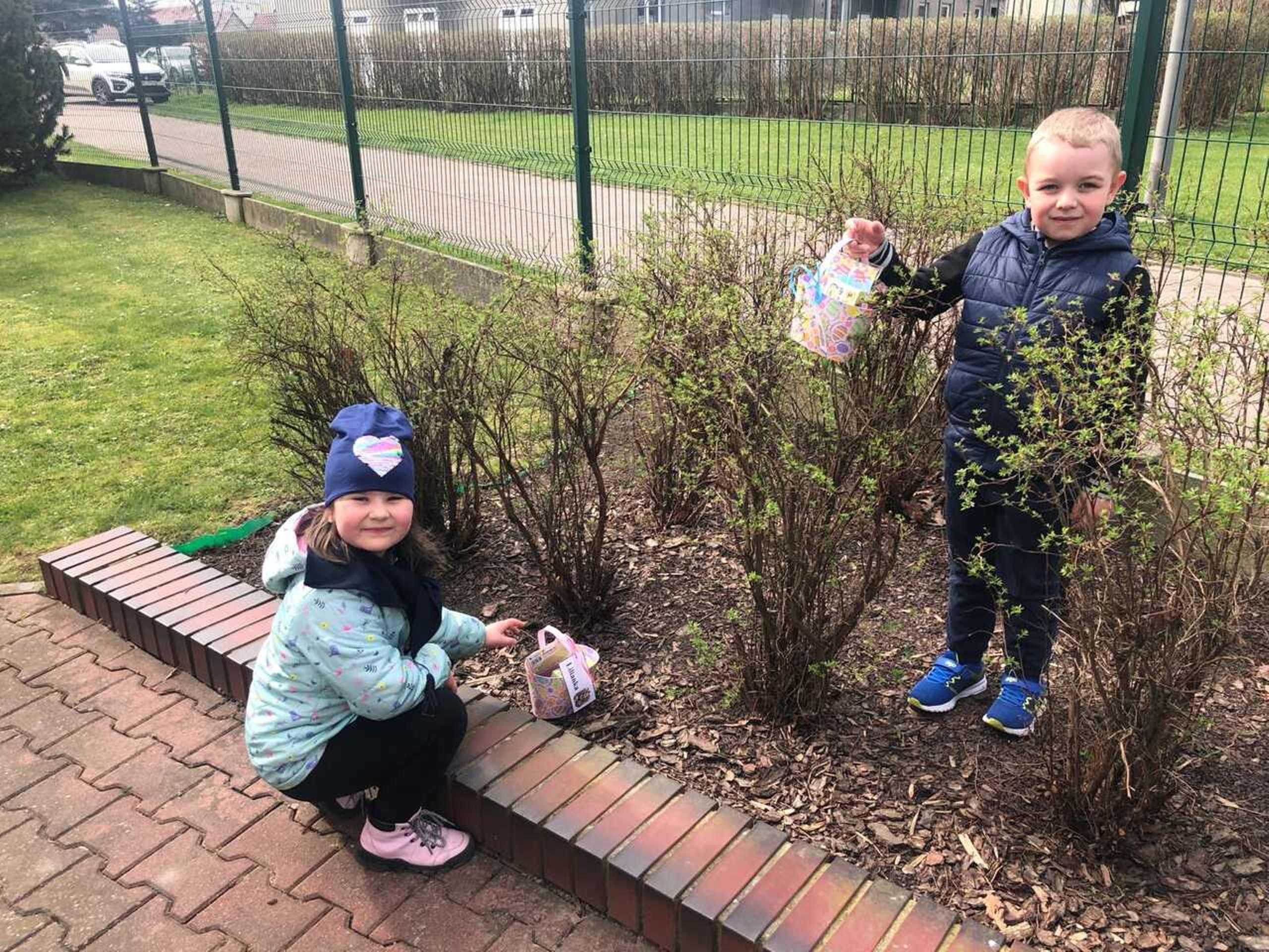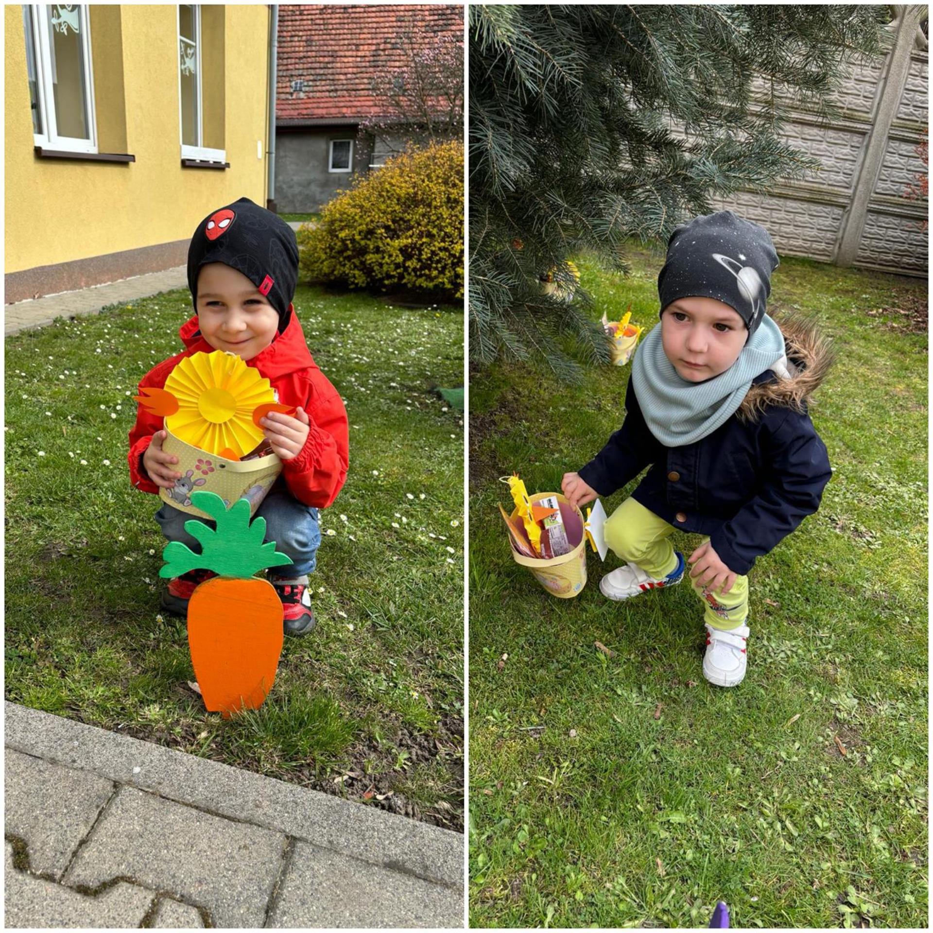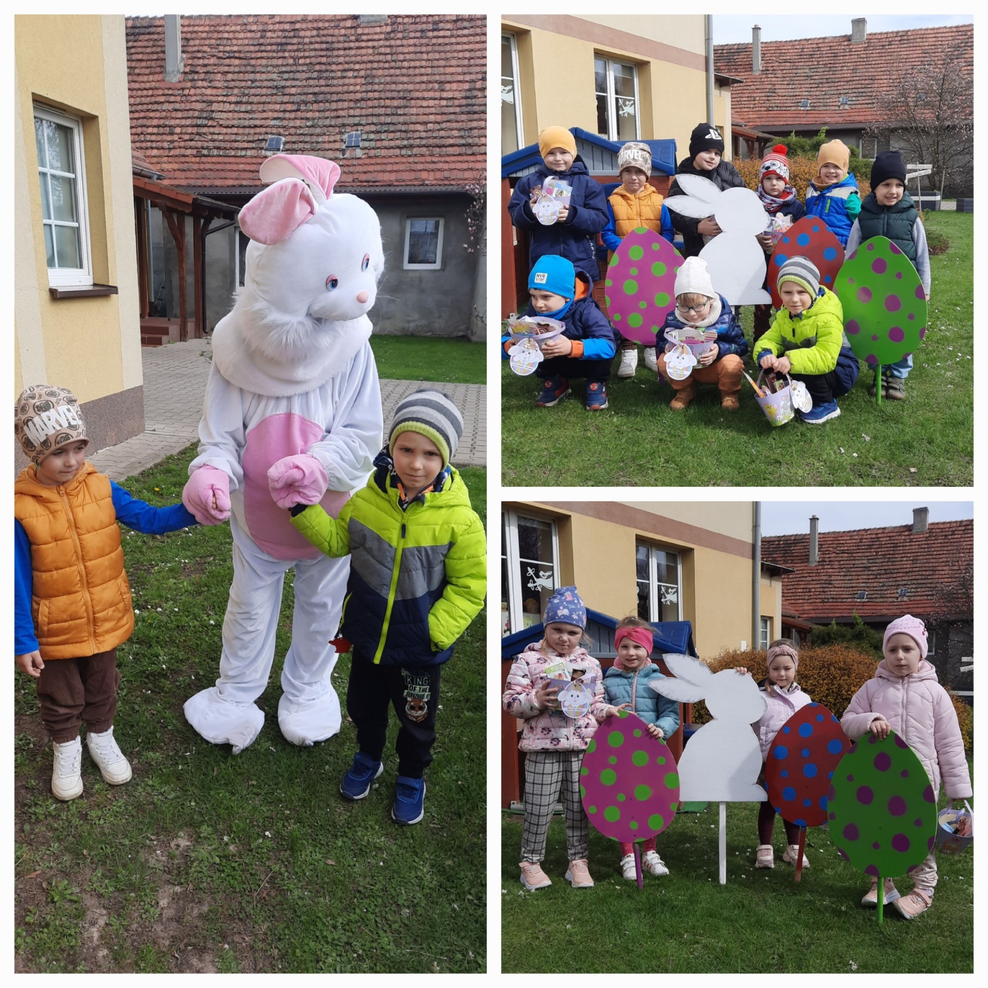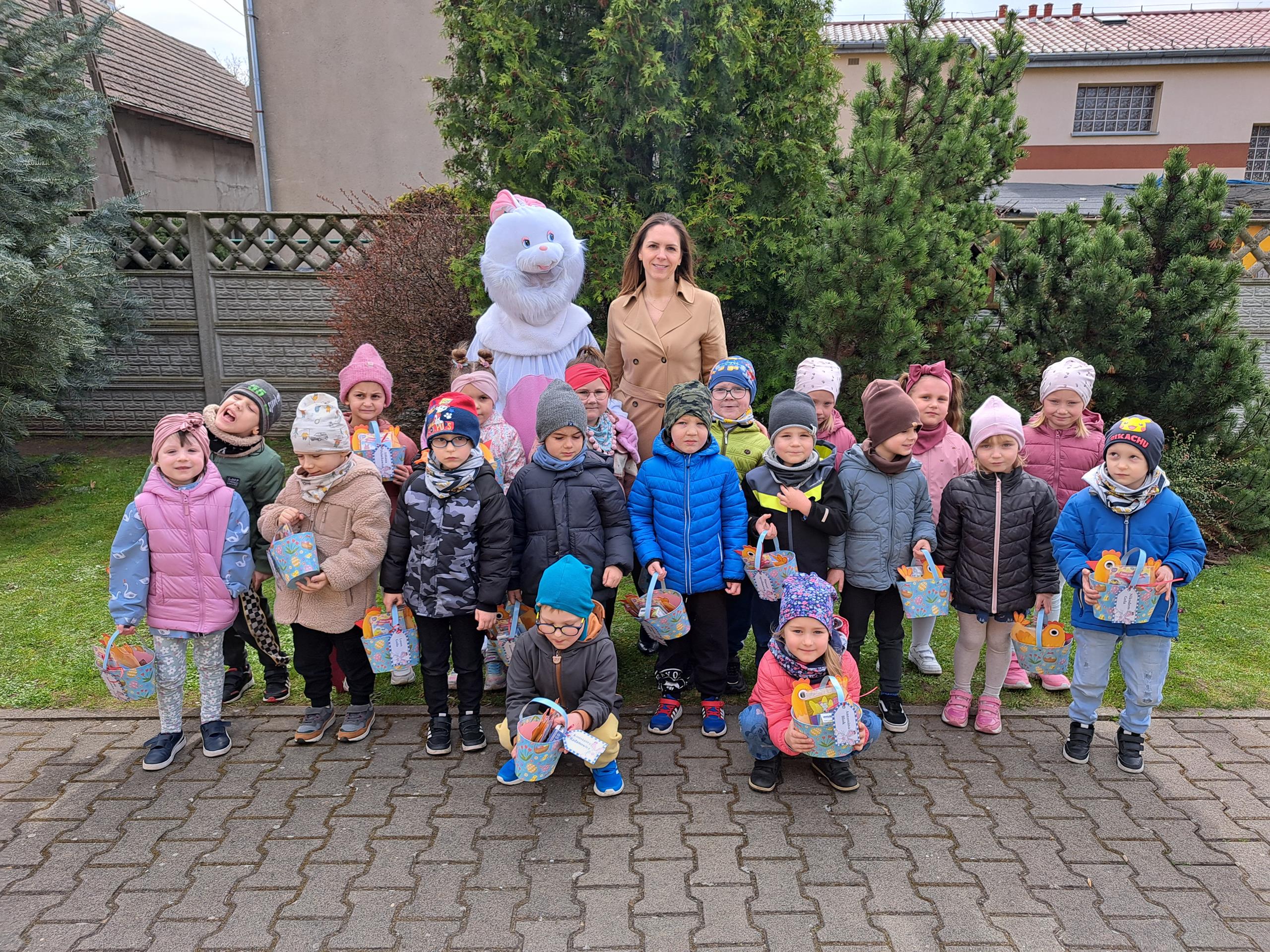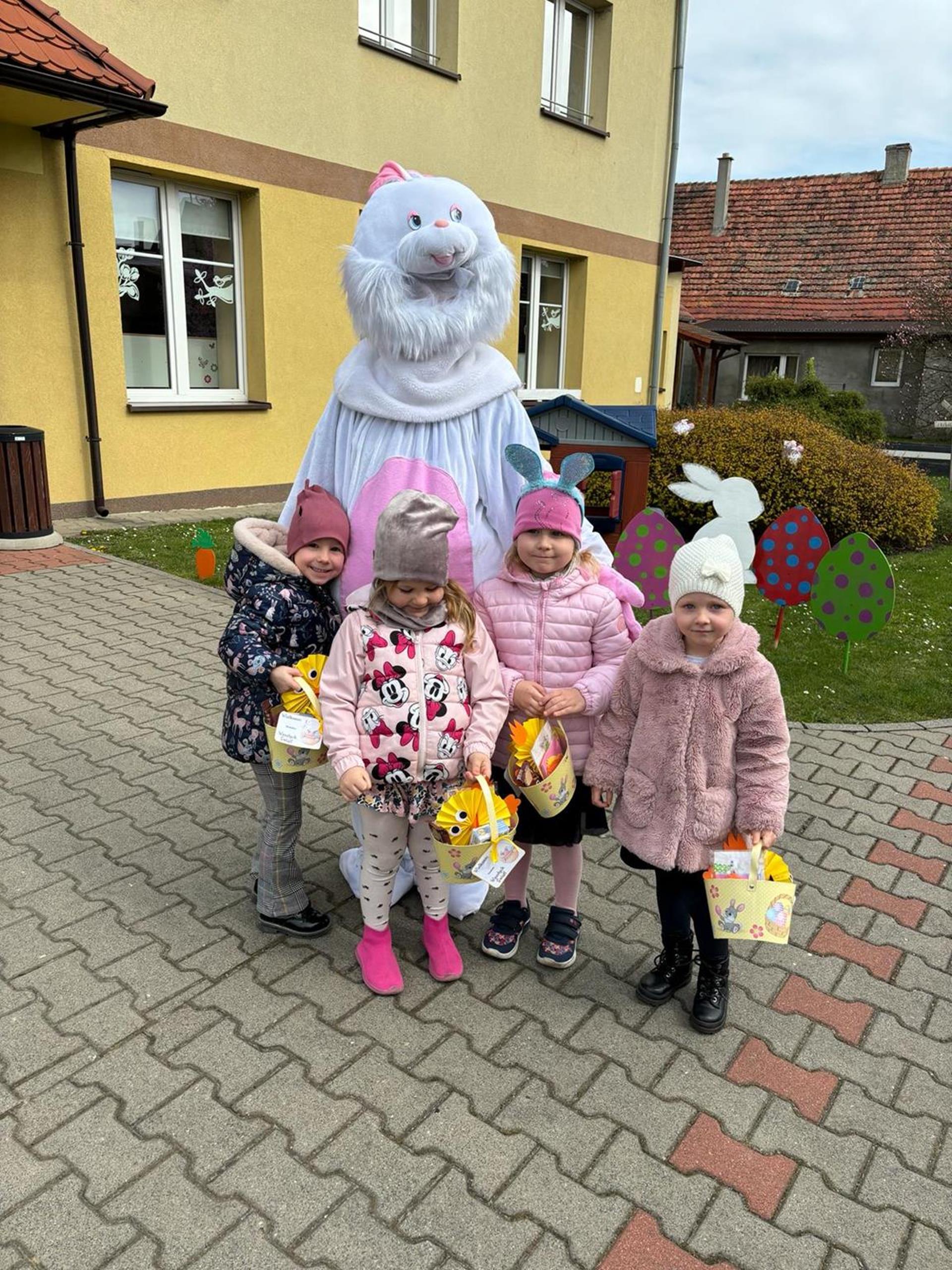 Przedszkolaki już od rana z niecierpliwością czekały na wizytę Zajączka. Kiedy wyszły na przedszkolne place okazało się, że już tam był i w zakamarkach podwórek ukrył koszyczki