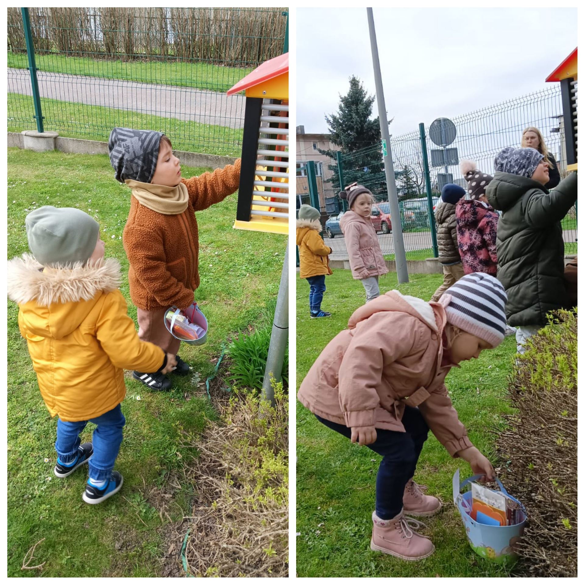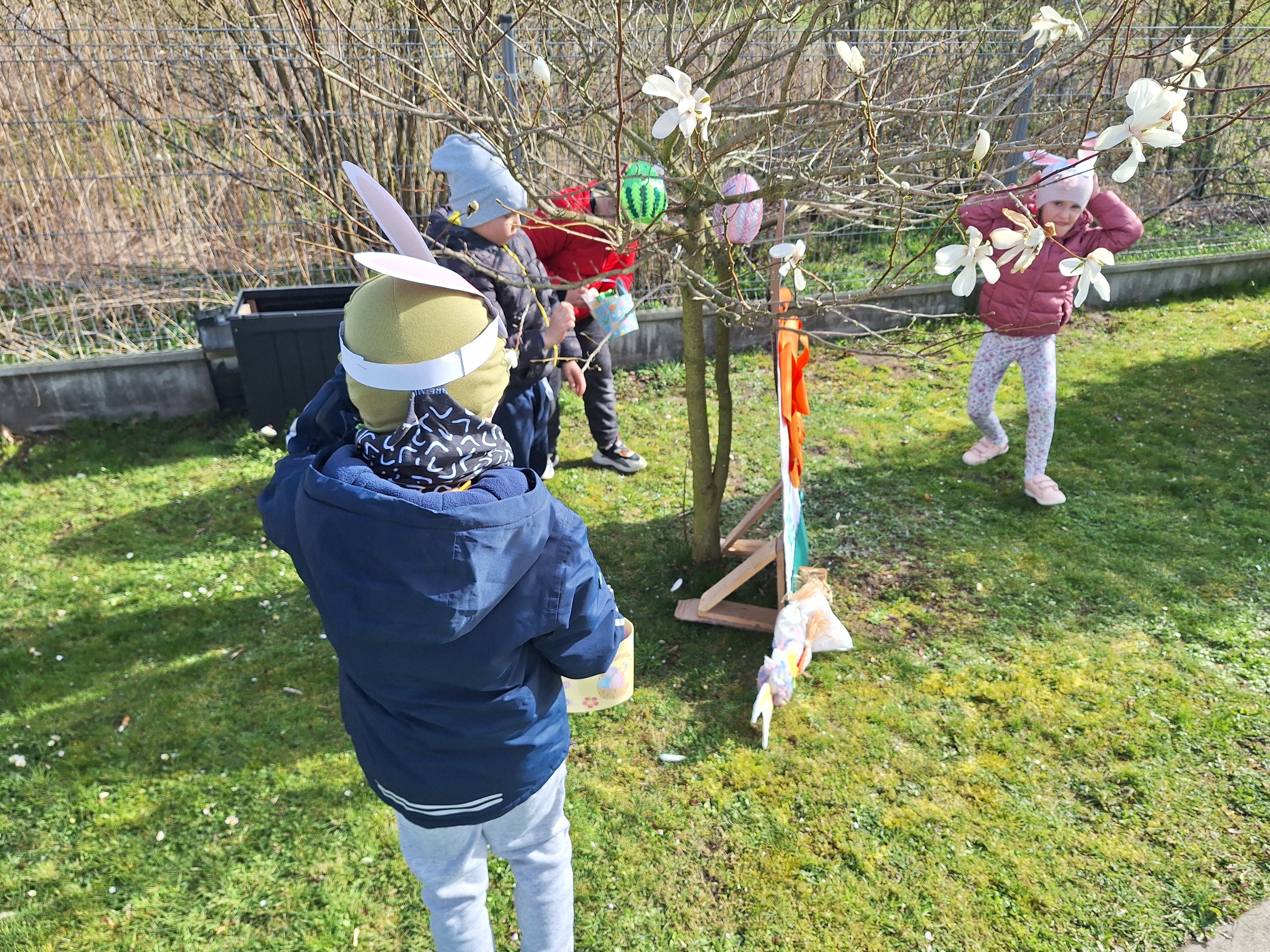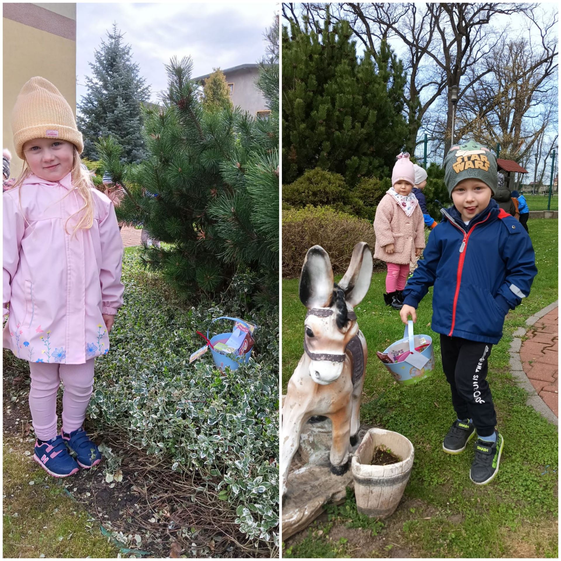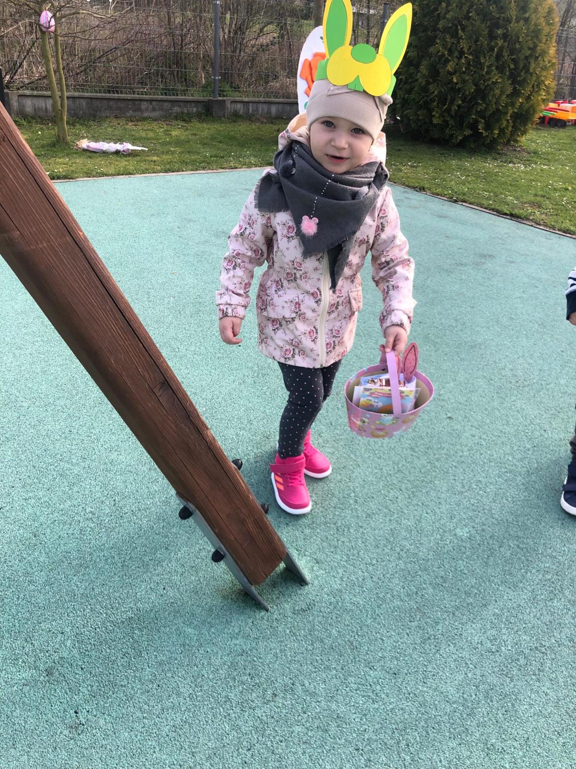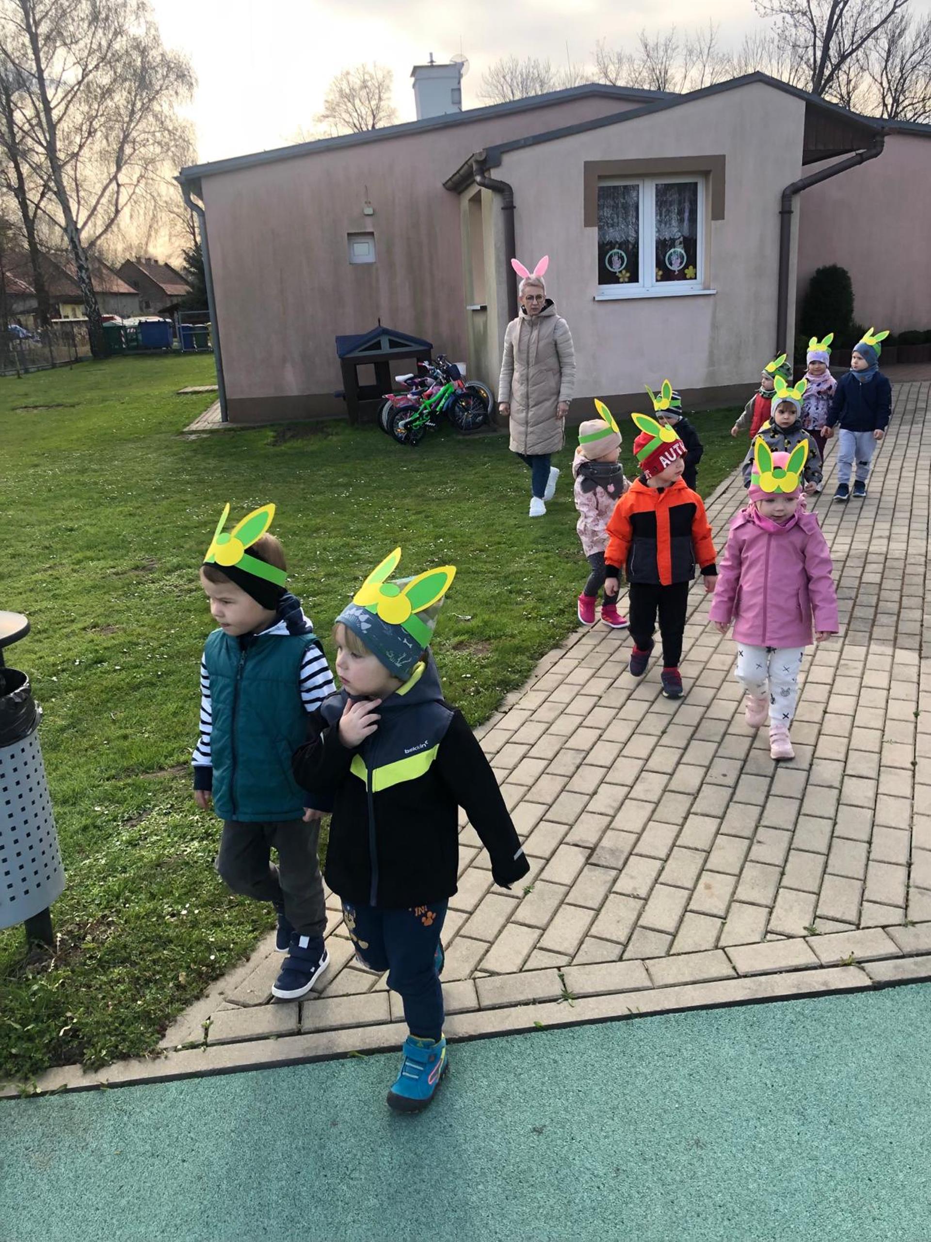 Przedszkolaki już od rana z niecierpliwością czekały na wizytę Zajączka. Kiedy wyszły na przedszkolne place okazało się, że już tam był i w zakamarkach podwórek ukrył koszyczki
