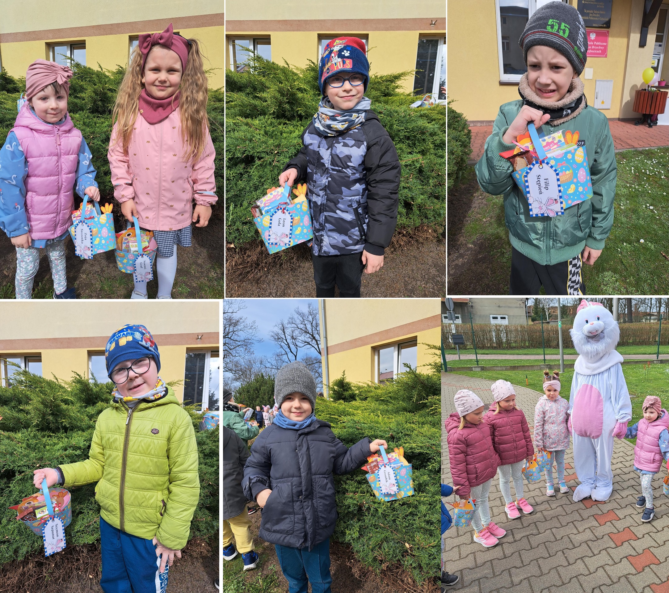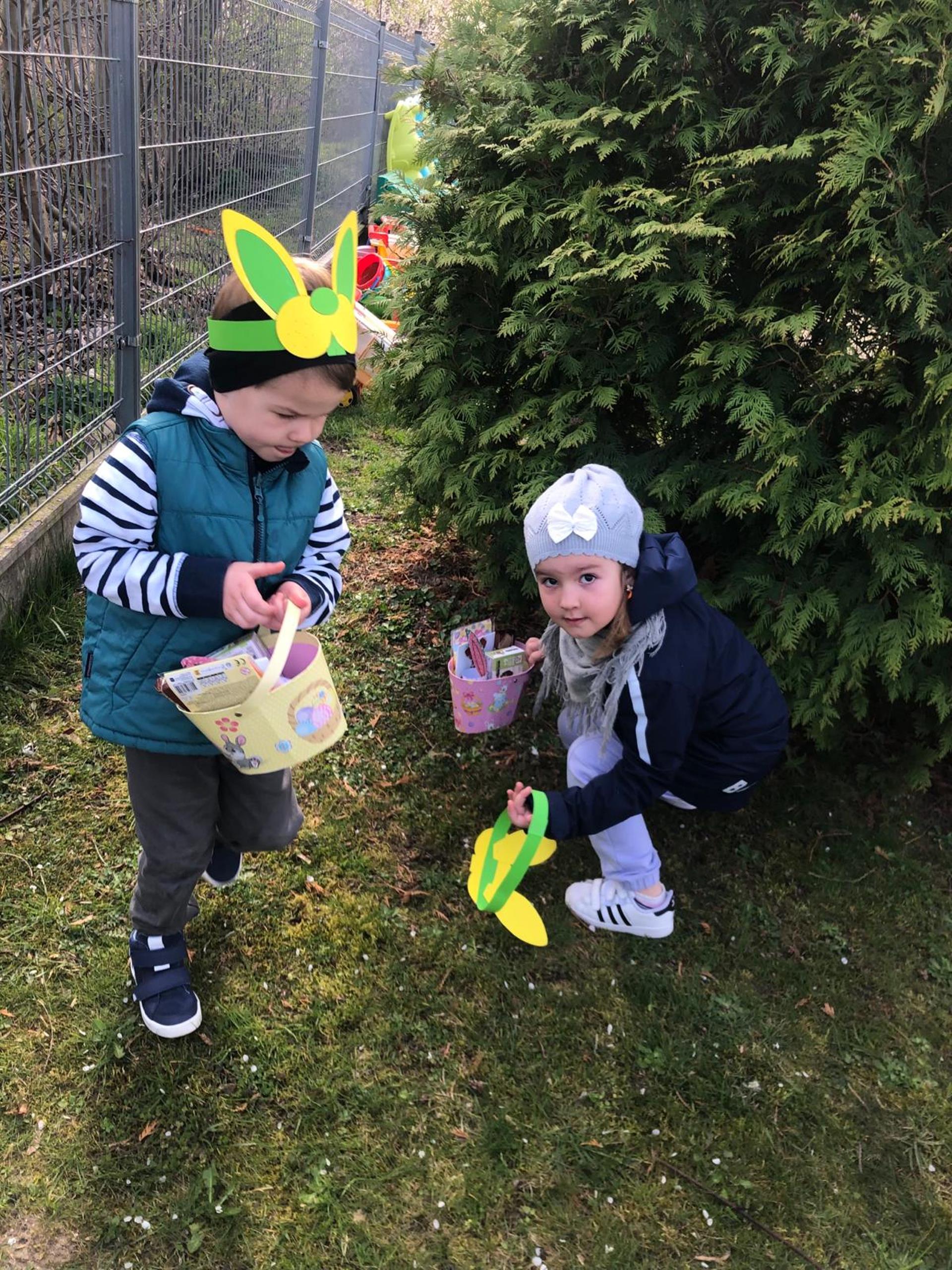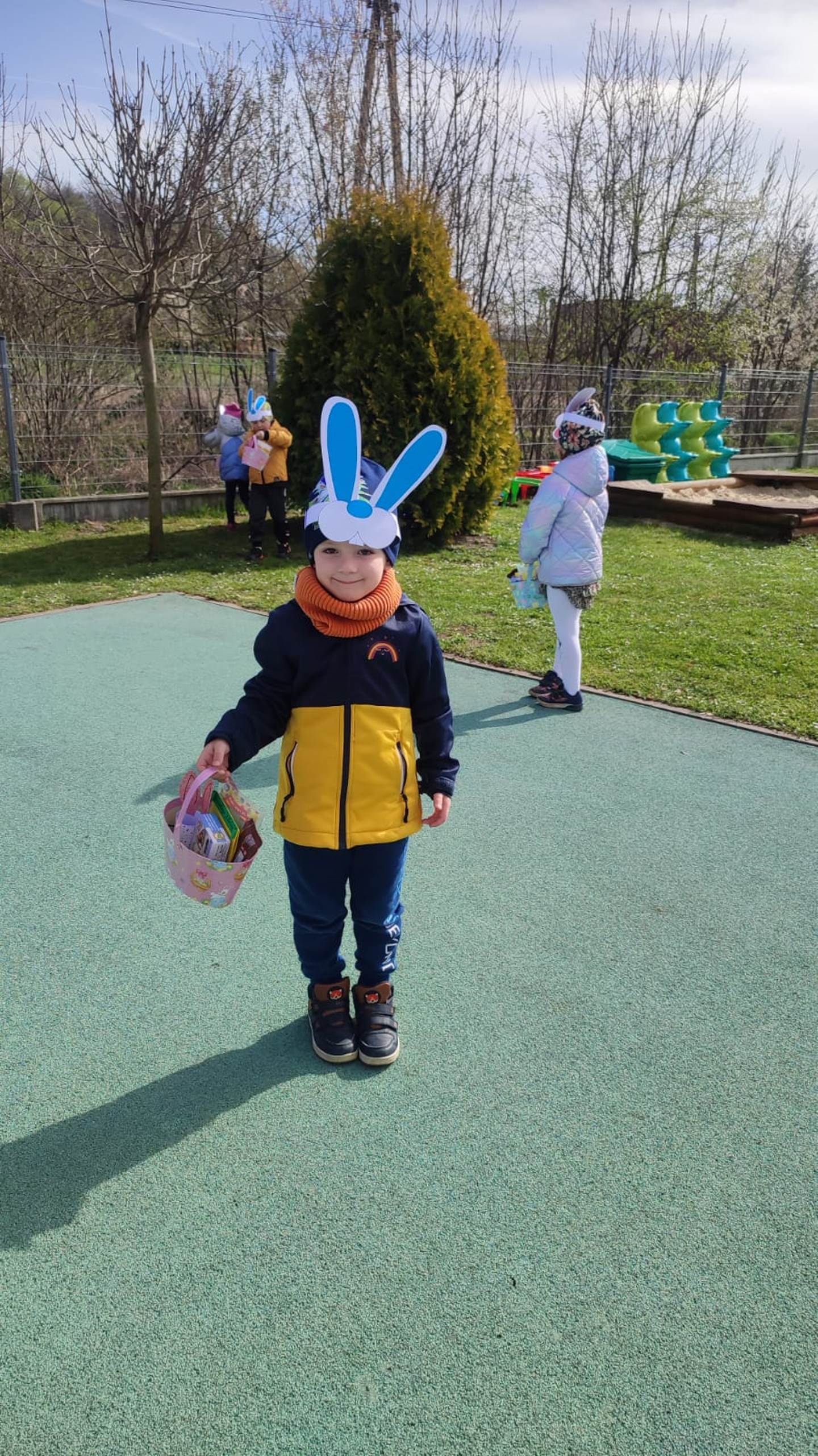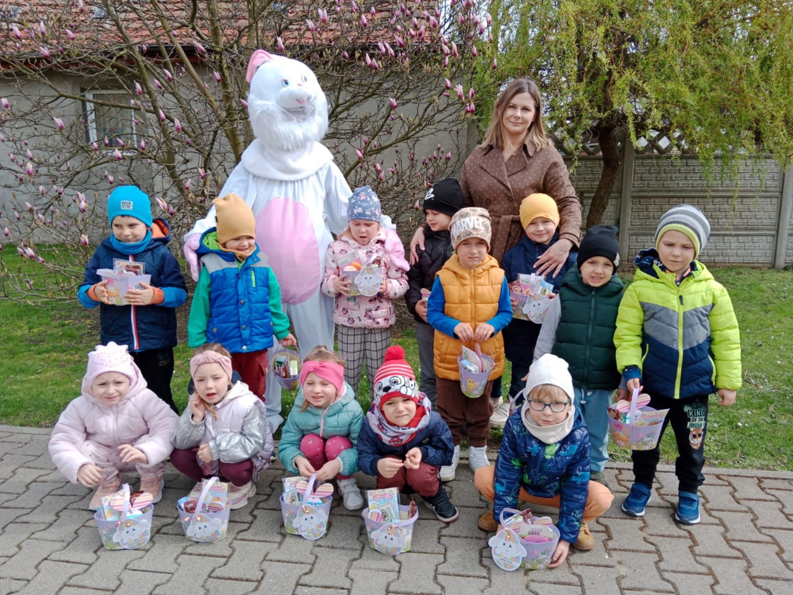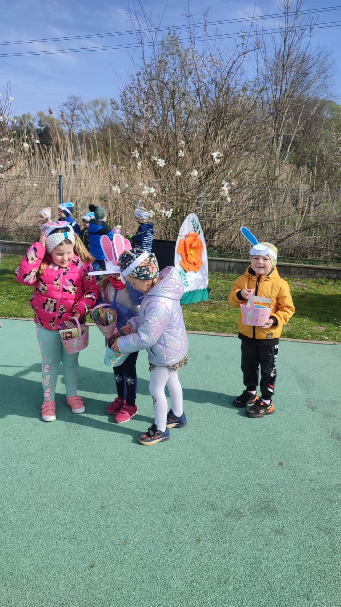 Przedszkolaki już od rana z niecierpliwością czekały na wizytę Zajączka. Kiedy wyszły na przedszkolne place okazało się, że już tam był i w zakamarkach podwórek ukrył koszyczki