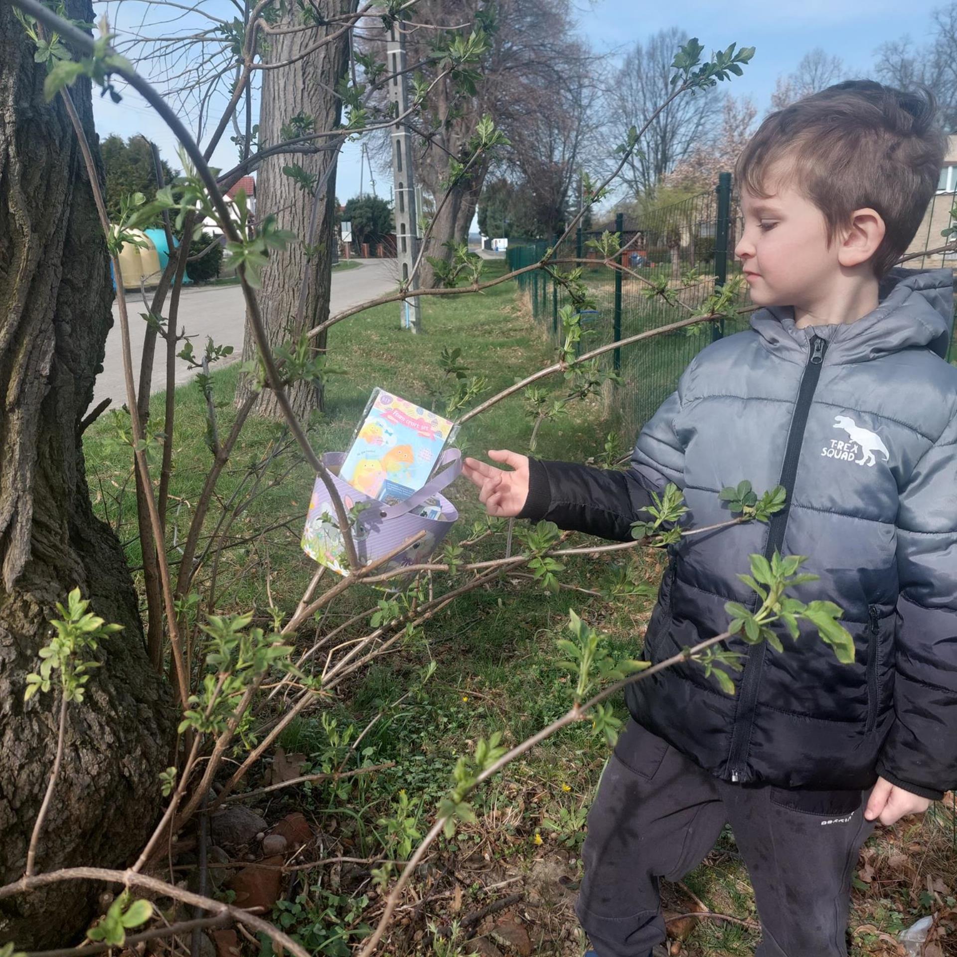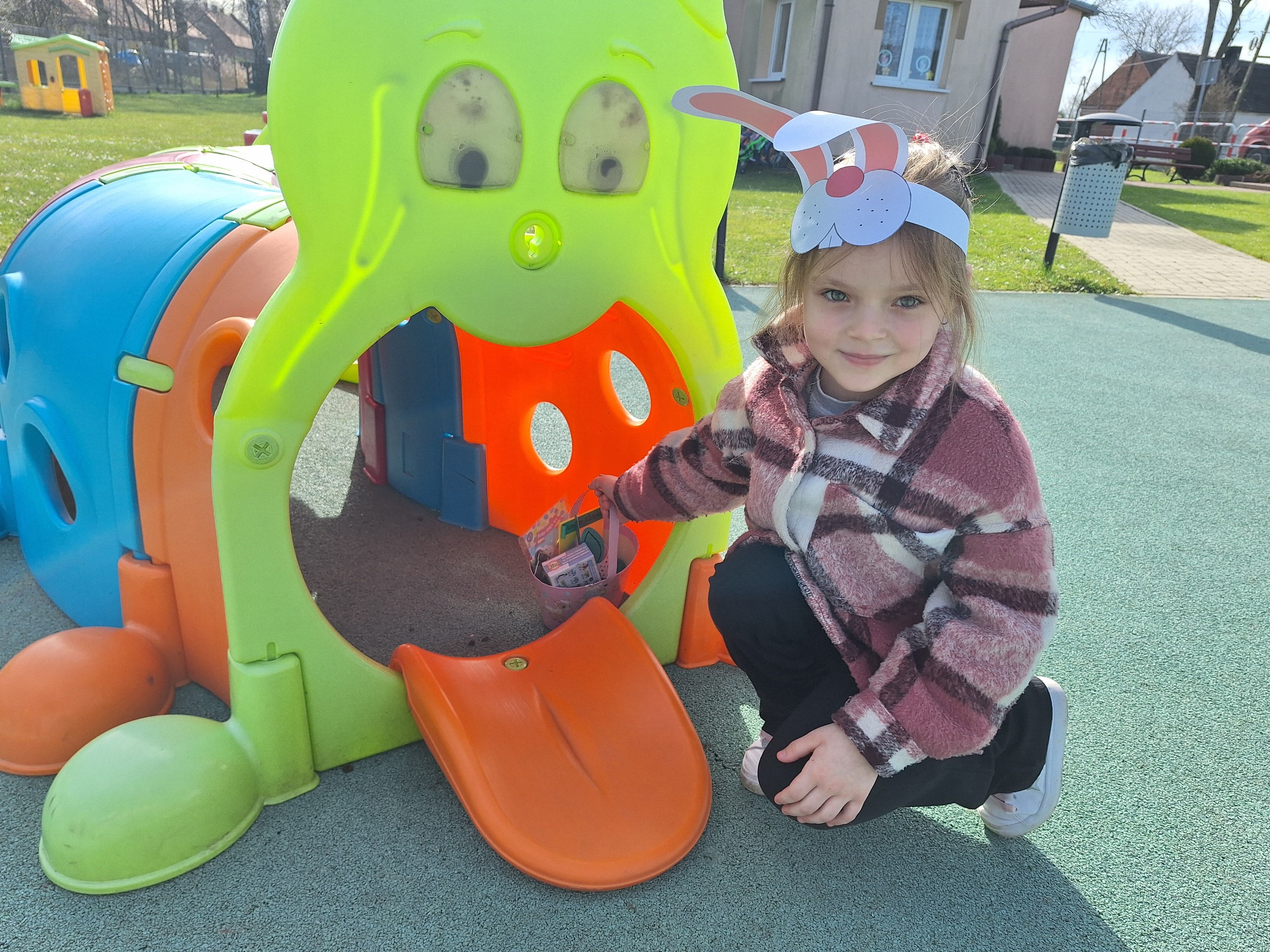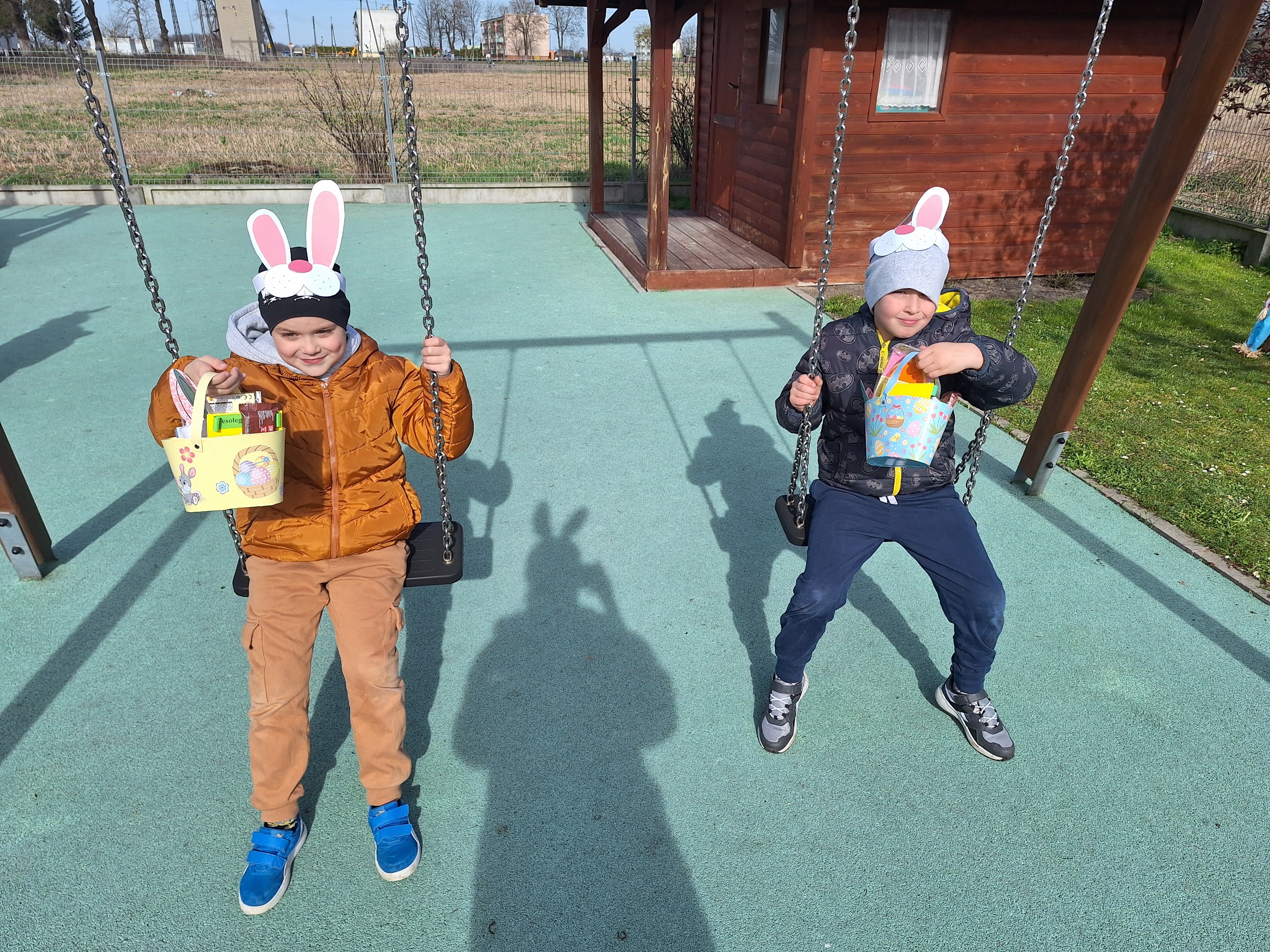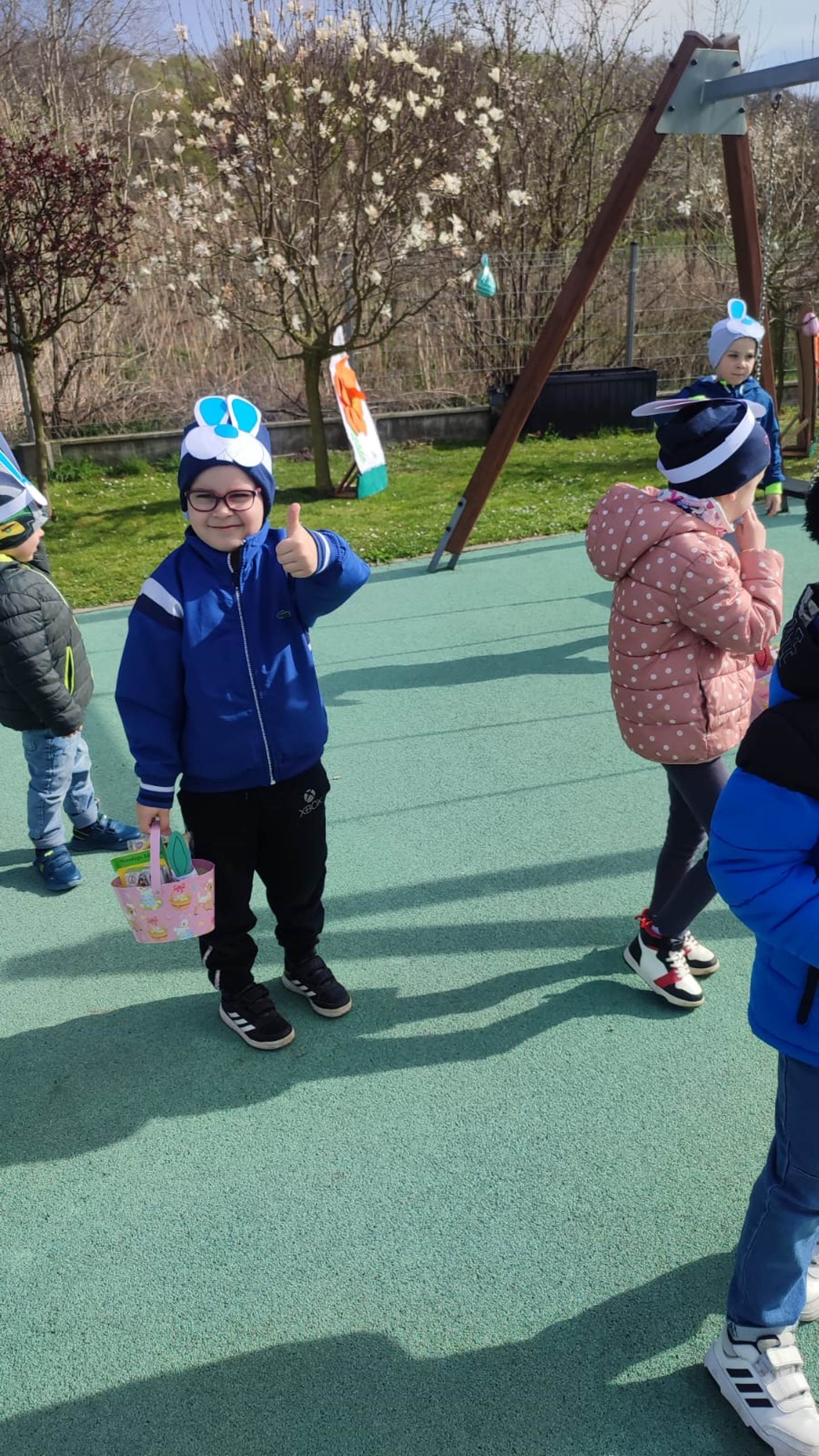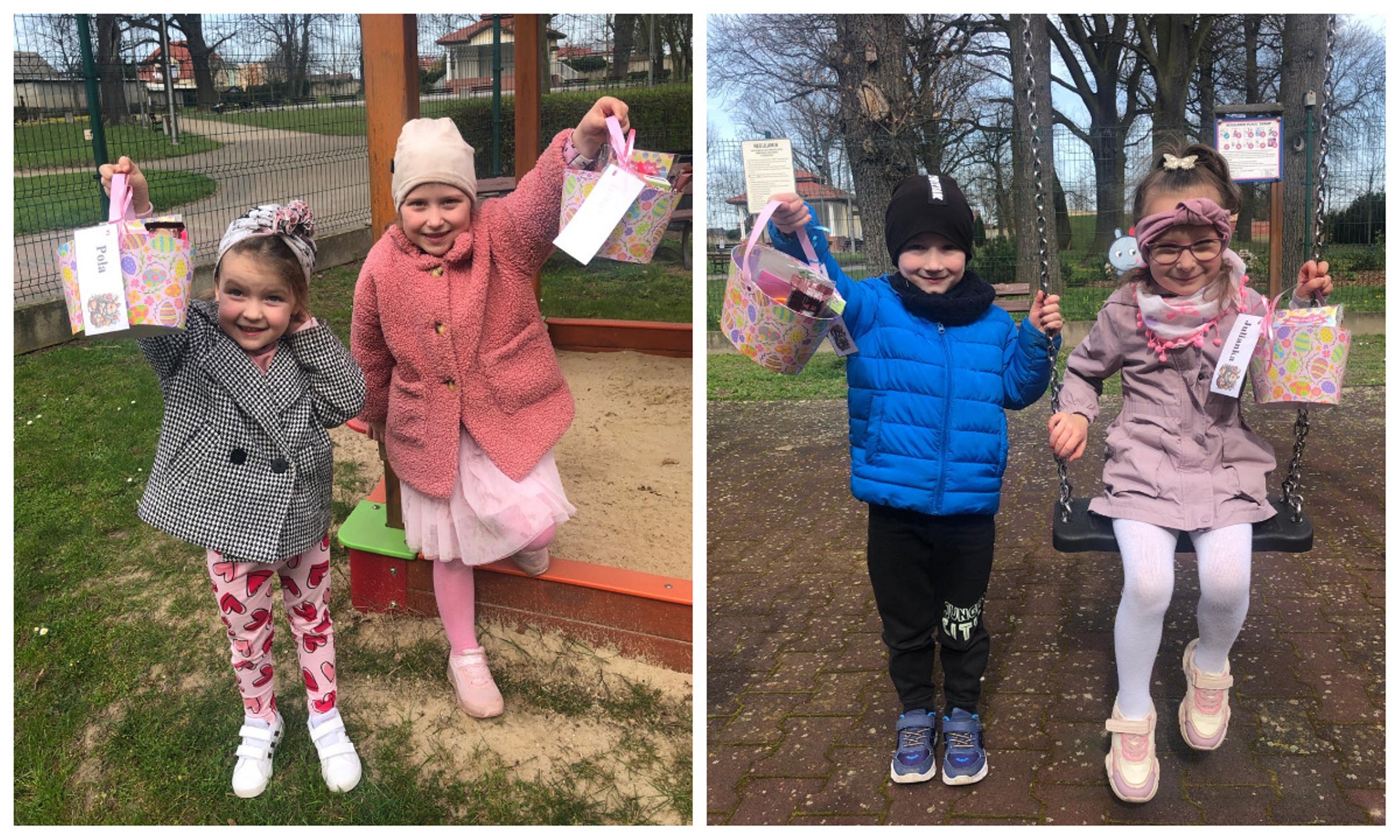Przedszkolaki już od rana z niecierpliwością czekały na wizytę Zajączka. Kiedy wyszły na przedszkolne place okazało się, że już tam był i w zakamarkach podwórek ukrył koszyczki