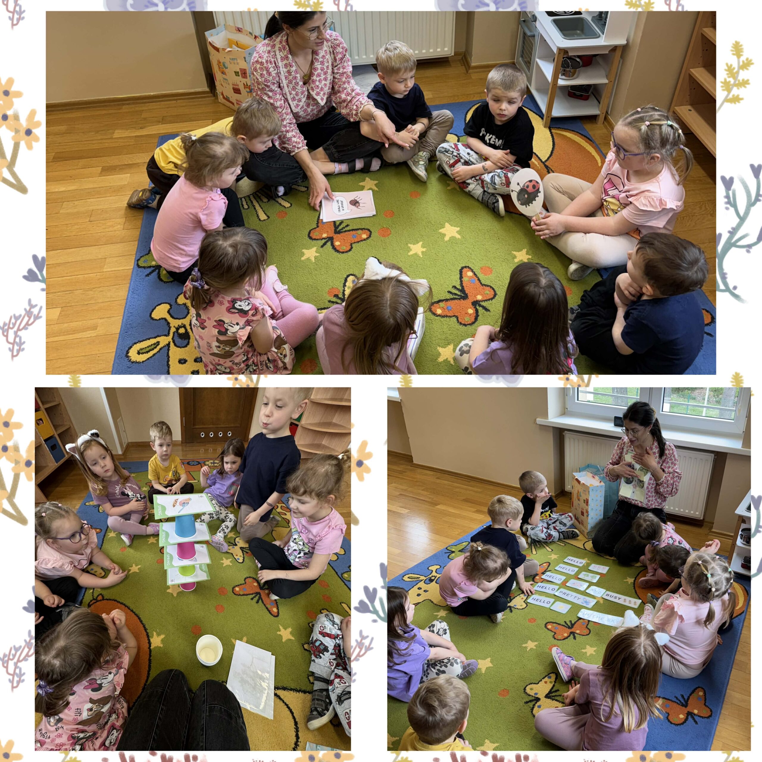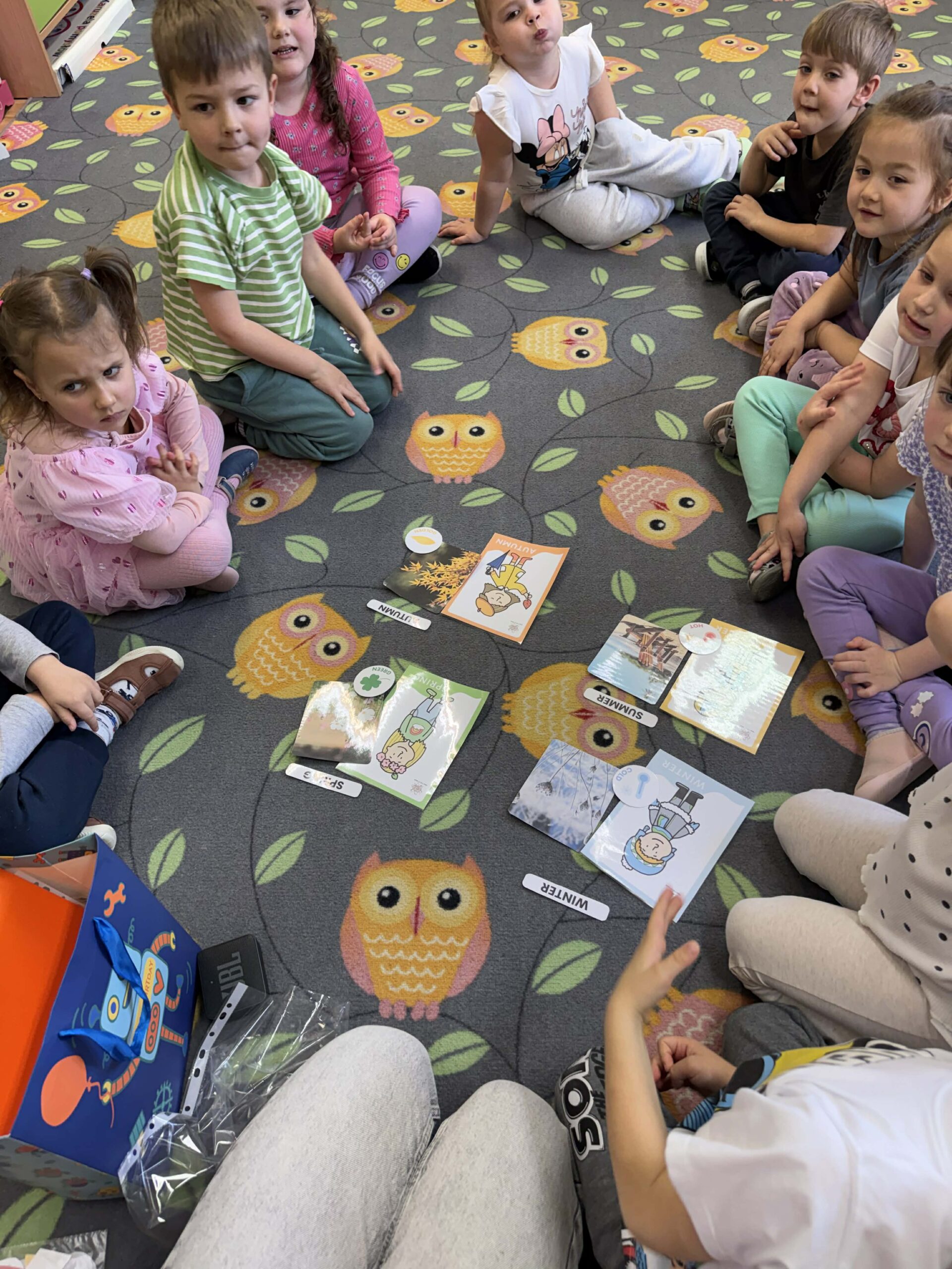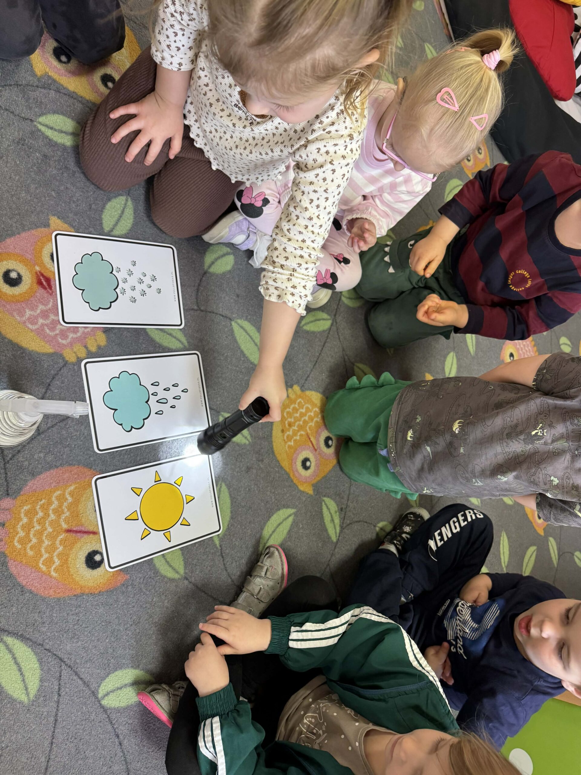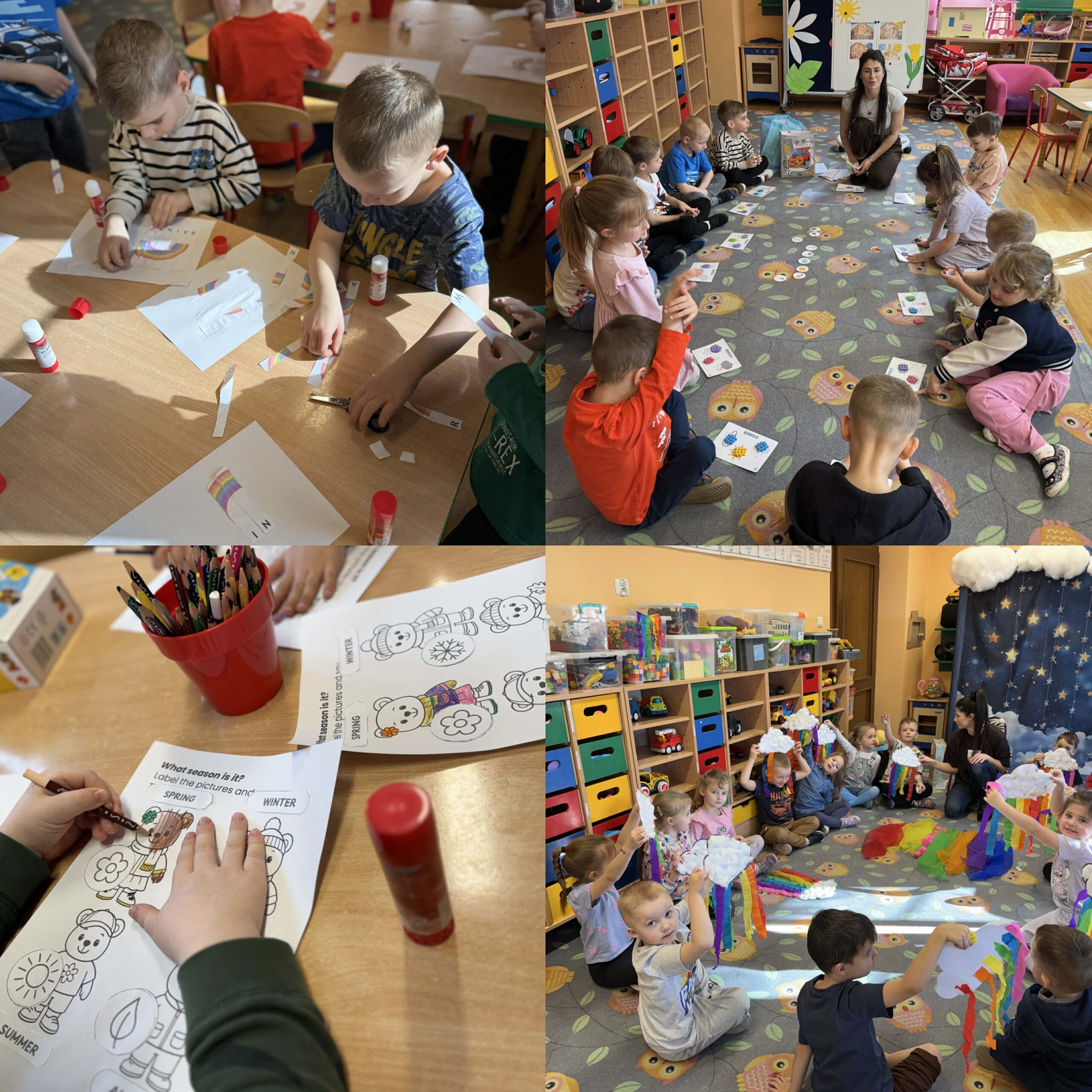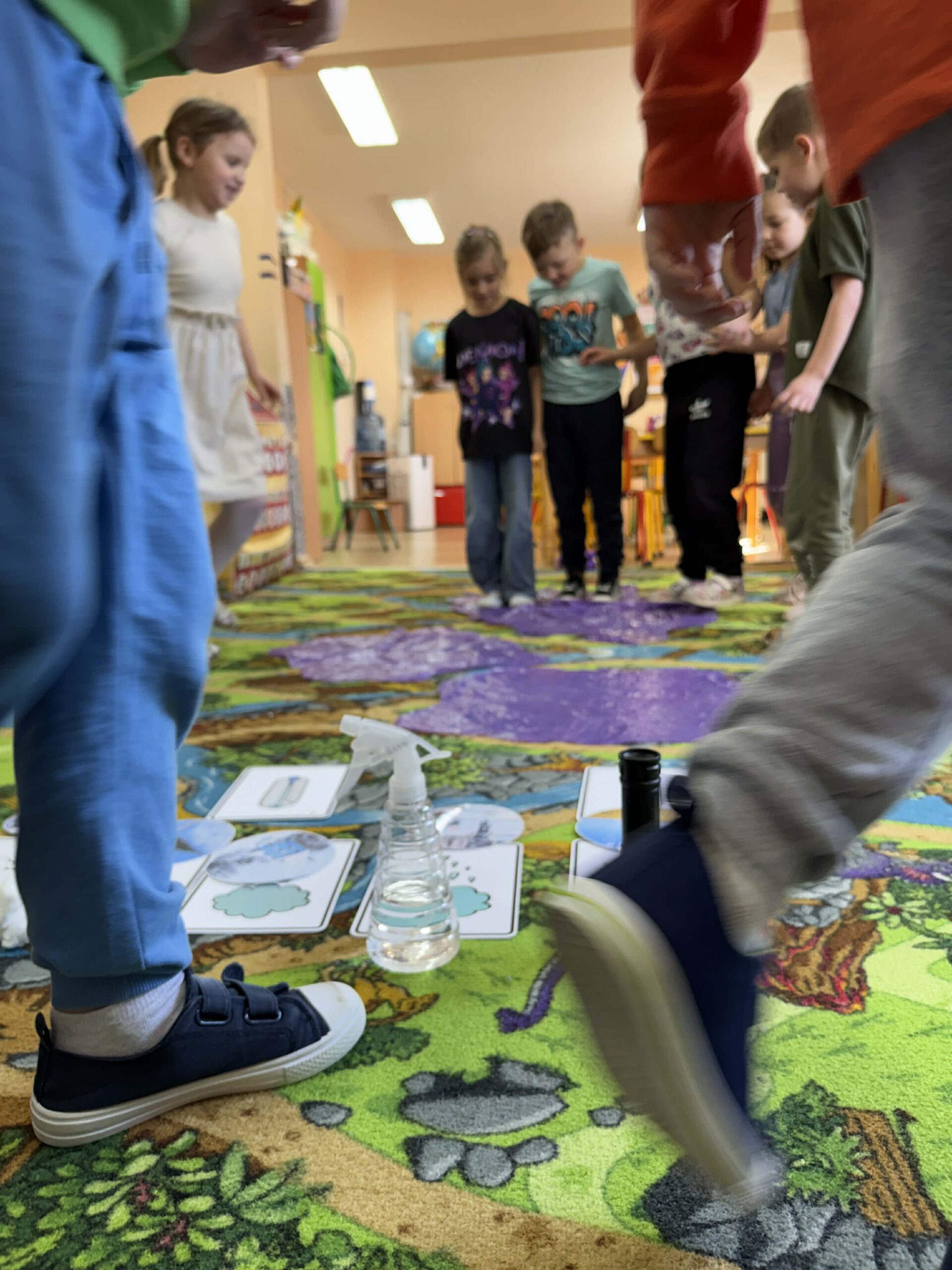 W okresie od grudnia do kwietnia w naszym przedszkolu odbywały się różnorodne zajęcia z języka angielskiego, dostosowane do wieku i możliwości dzieci z poszczególnych grup. Zajęcia miały na celu przede wszystkim naukę poprzez zabawę – łączyły elementy edukacyjne z radością odkrywania i aktywnym uczestnictwem dzieci. W trakcie spotkań wykorzystywaliśmy różnorodne formy pracy, w tym elementy sensoryczne, które uatrakcyjniały zajęcia i angażowały dzieci. Przedszkolaki miały okazję eksperymentować m.in. ze sztucznym śniegiem, kulkami hydrożelowymi, a także korzystać z latarek do prześwietlania różnych przedmiotów. Podczas zajęć nie zabrakło muzyki – dzieci chętnie uczyły się języka poprzez liczne piosenki oraz rymowanki tematyczne. Każde spotkanie było okazją do nauki, wspólnej zabawy oraz budowania pozytywnych relacji w grupie. Zajęcia z języka angielskiego odbywały się również na świeżym powietrzu. Wykorzystując pierwsze promienie słoneczne, przeprowadziliśmy zajęcia w tematyce pogody w naszym pięknym parku, co było dla dzieci dodatkową atrakcją i okazją do nauki w naturalnym otoczeniu.
