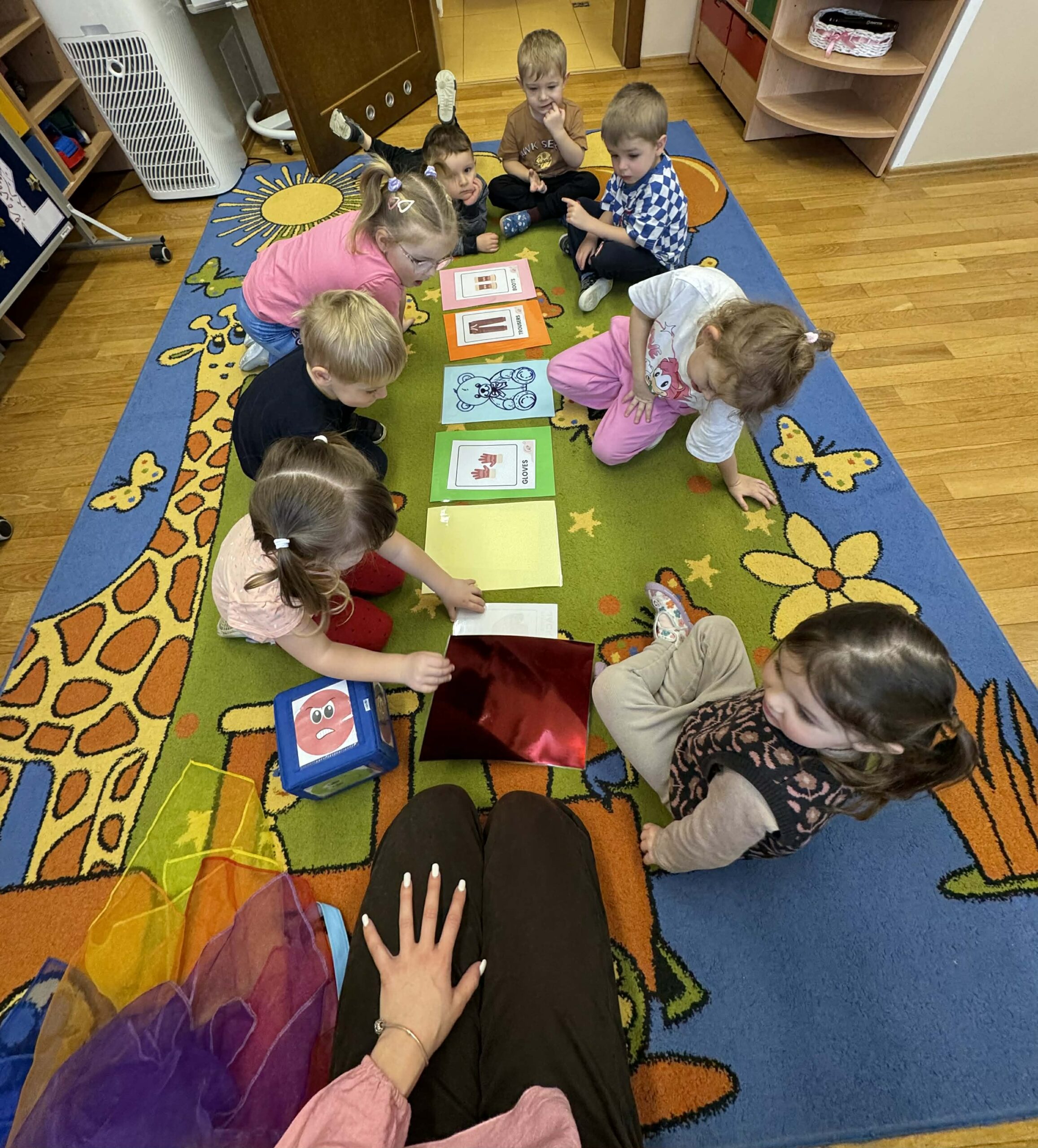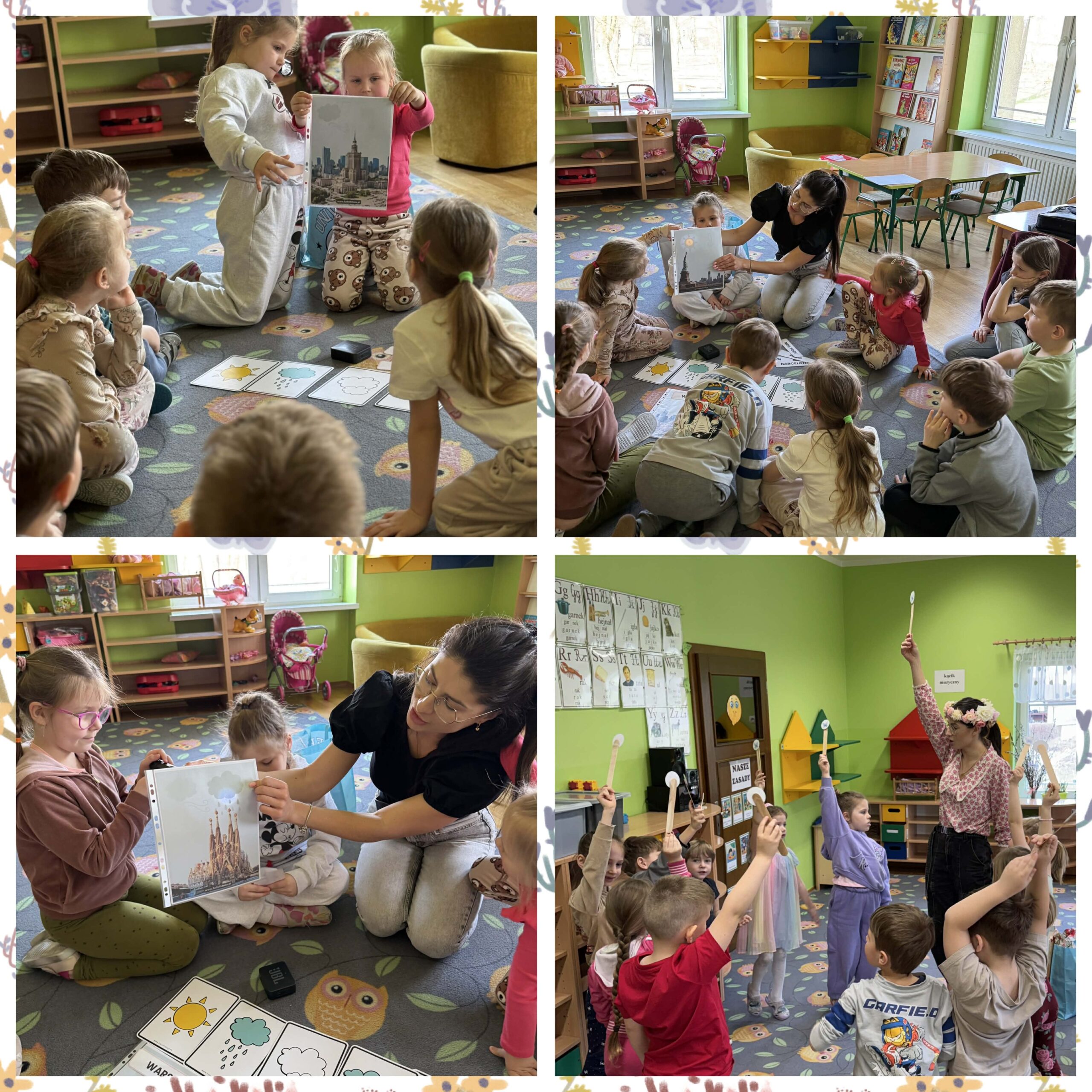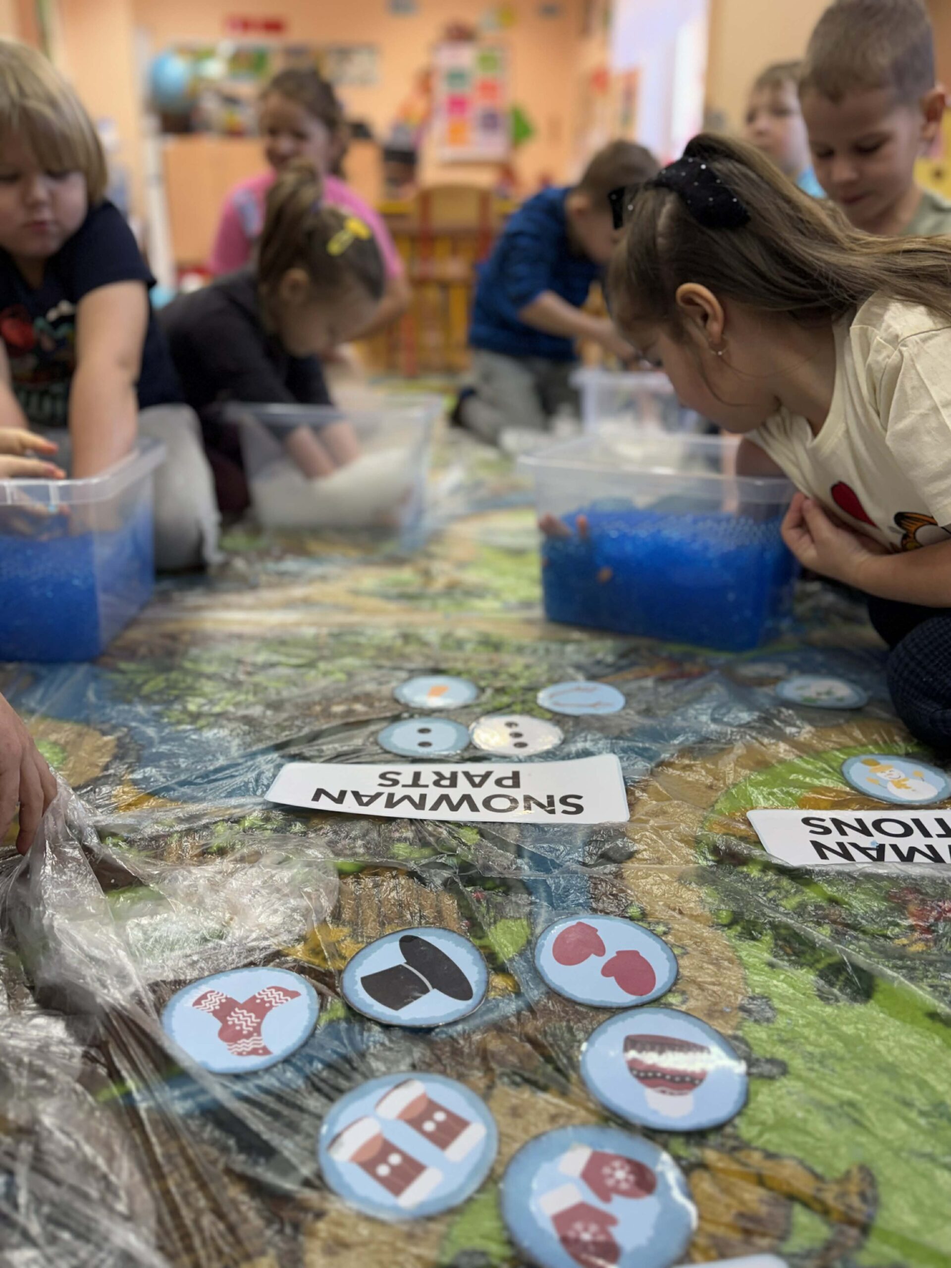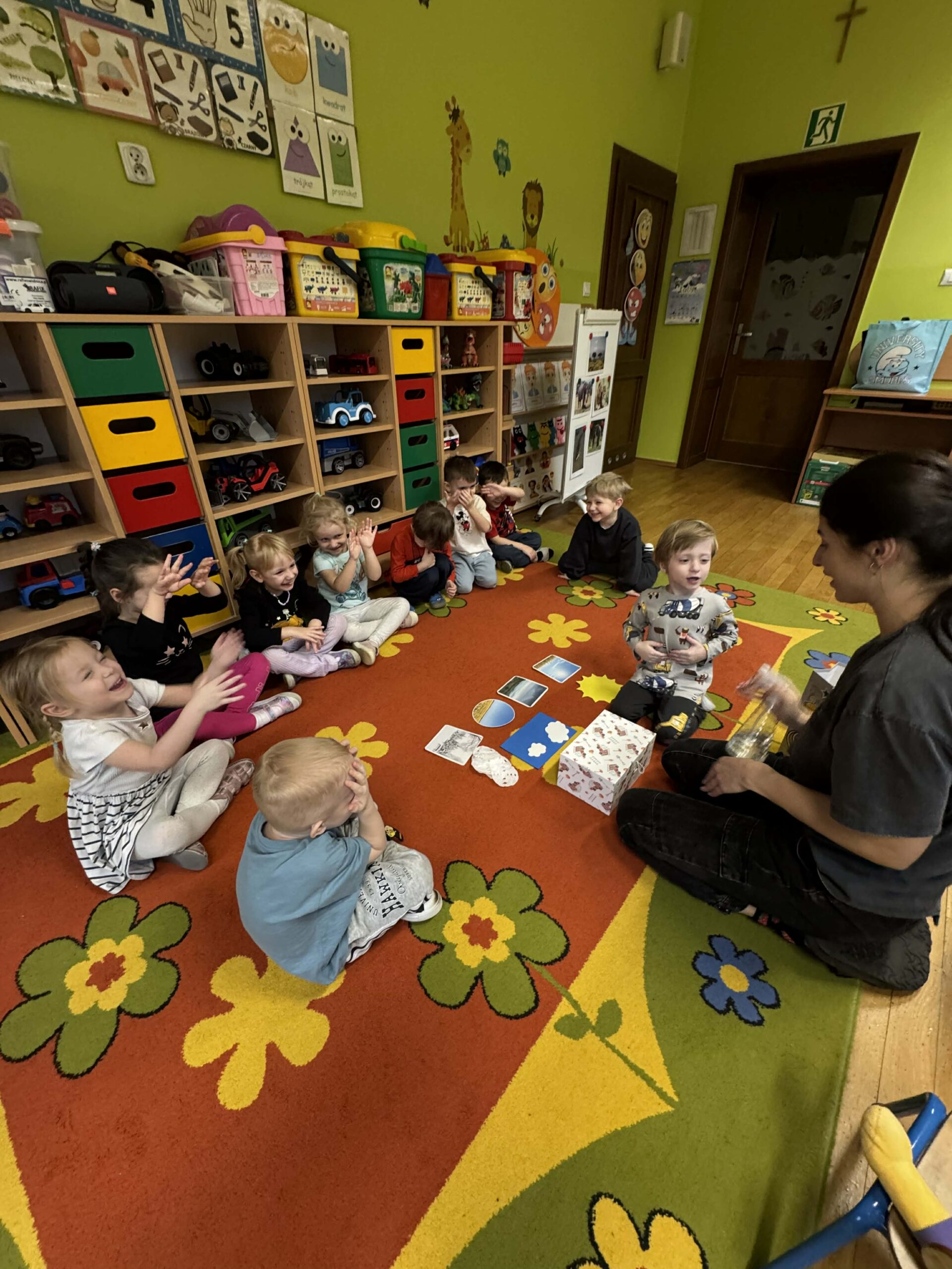 W okresie od grudnia do kwietnia w naszym przedszkolu odbywały się różnorodne zajęcia z języka angielskiego, dostosowane do wieku i możliwości dzieci z poszczególnych grup. Zajęcia miały na celu przede wszystkim naukę poprzez zabawę – łączyły elementy edukacyjne z radością odkrywania i aktywnym uczestnictwem dzieci. W trakcie spotkań wykorzystywaliśmy różnorodne formy pracy, w tym elementy sensoryczne, które uatrakcyjniały zajęcia i angażowały dzieci. Przedszkolaki miały okazję eksperymentować m.in. ze sztucznym śniegiem, kulkami hydrożelowymi, a także korzystać z latarek do prześwietlania różnych przedmiotów. Podczas zajęć nie zabrakło muzyki – dzieci chętnie uczyły się języka poprzez liczne piosenki oraz rymowanki tematyczne. Każde spotkanie było okazją do nauki, wspólnej zabawy oraz budowania pozytywnych relacji w grupie. Zajęcia z języka angielskiego odbywały się również na świeżym powietrzu. Wykorzystując pierwsze promienie słoneczne, przeprowadziliśmy zajęcia w tematyce pogody w naszym pięknym parku, co było dla dzieci dodatkową atrakcją i okazją do nauki w naturalnym otoczeniu.