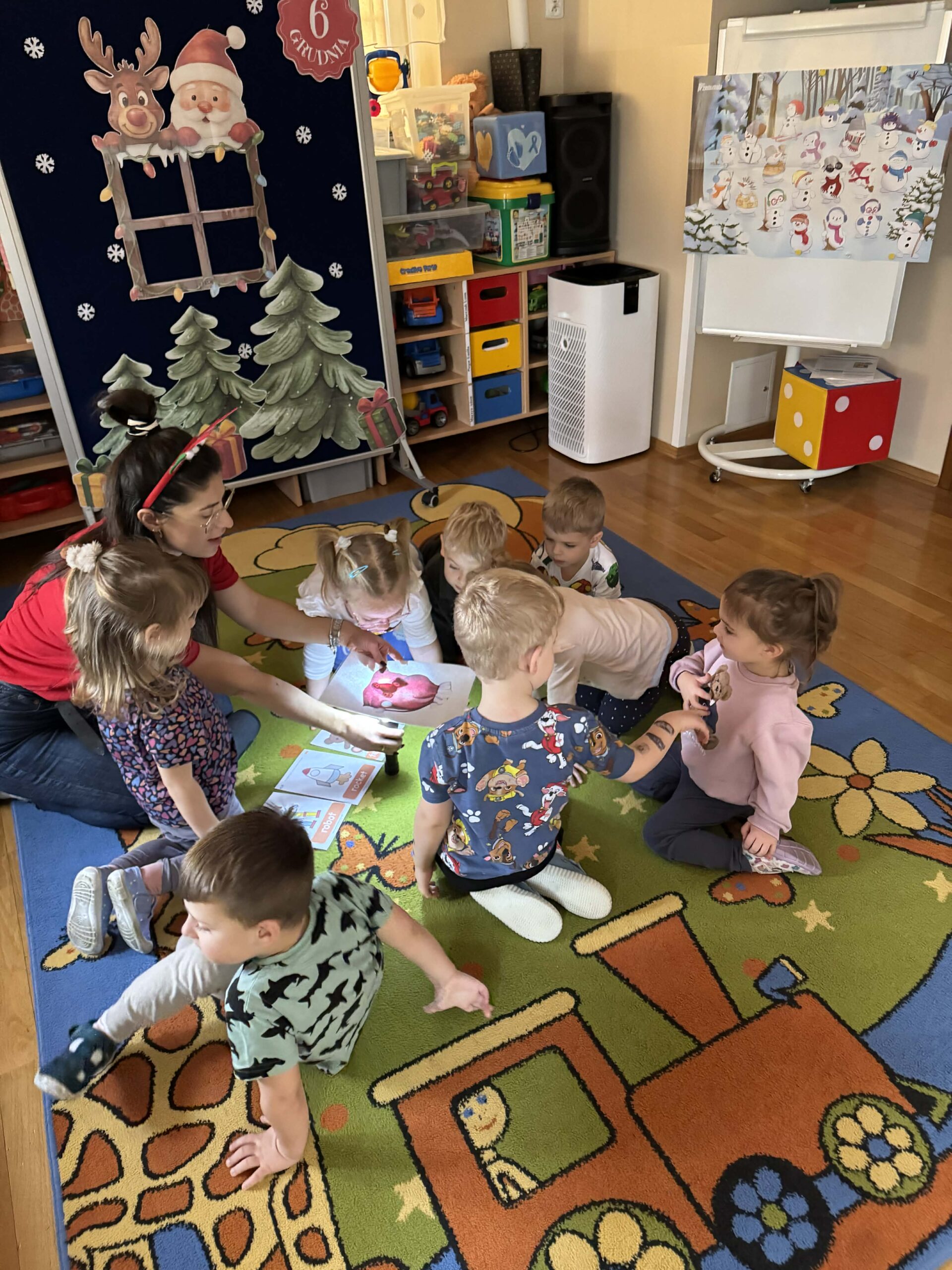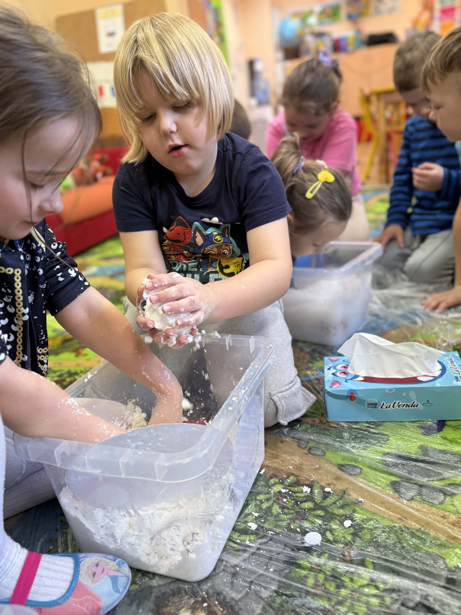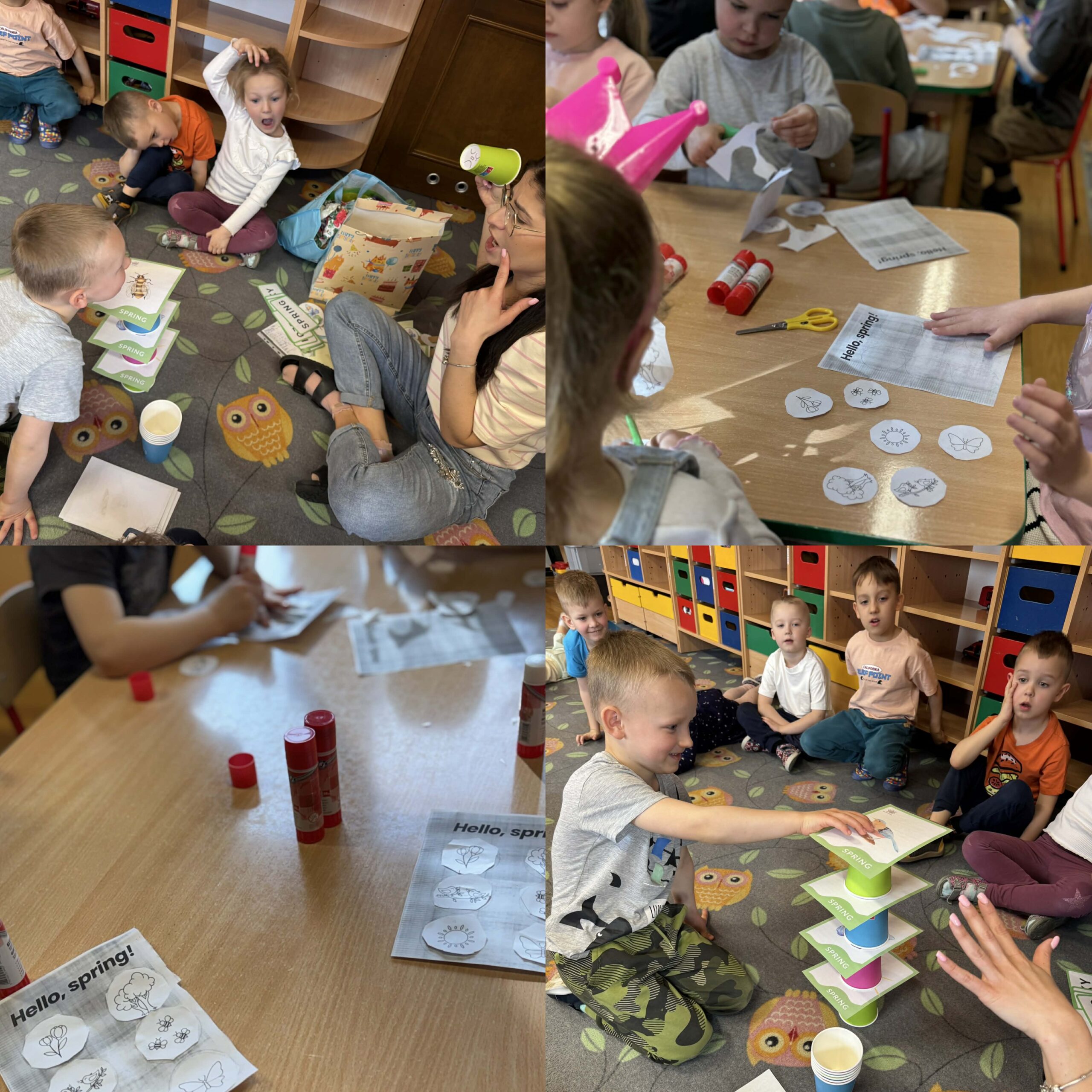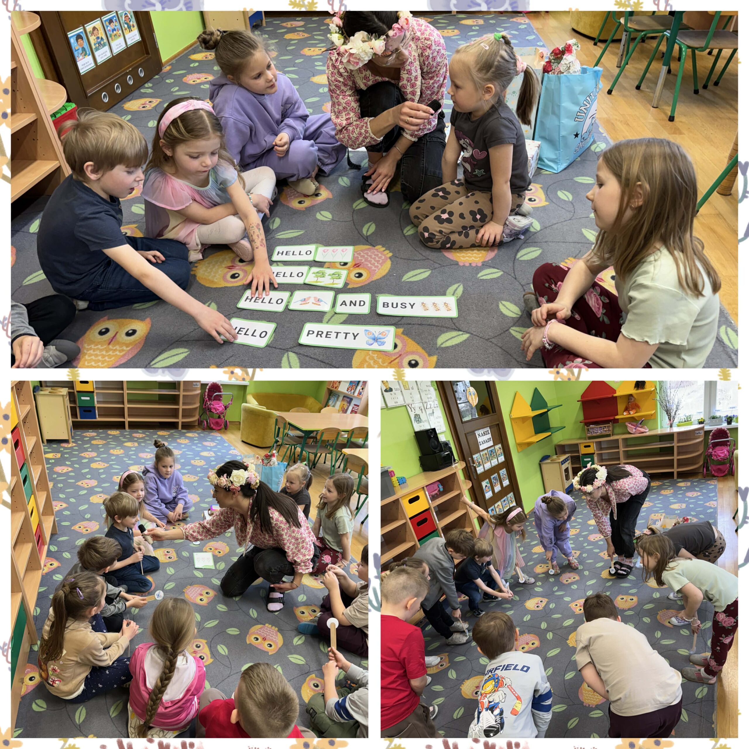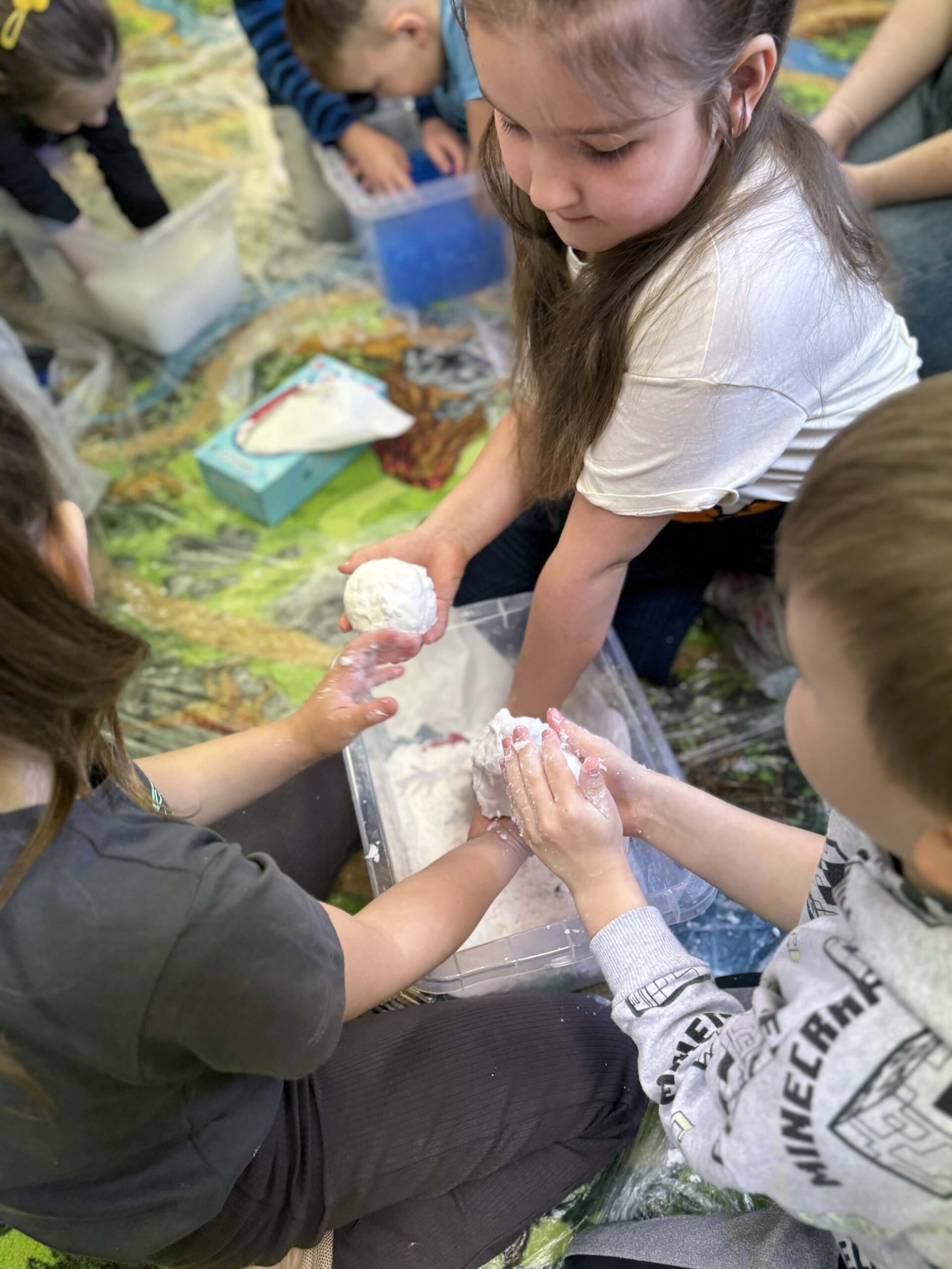 W okresie od grudnia do kwietnia w naszym przedszkolu odbywały się różnorodne zajęcia z języka angielskiego, dostosowane do wieku i możliwości dzieci z poszczególnych grup. Zajęcia miały na celu przede wszystkim naukę poprzez zabawę – łączyły elementy edukacyjne z radością odkrywania i aktywnym uczestnictwem dzieci. W trakcie spotkań wykorzystywaliśmy różnorodne formy pracy, w tym elementy sensoryczne, które uatrakcyjniały zajęcia i angażowały dzieci. Przedszkolaki miały okazję eksperymentować m.in. ze sztucznym śniegiem, kulkami hydrożelowymi, a także korzystać z latarek do prześwietlania różnych przedmiotów. Podczas zajęć nie zabrakło muzyki – dzieci chętnie uczyły się języka poprzez liczne piosenki oraz rymowanki tematyczne. Każde spotkanie było okazją do nauki, wspólnej zabawy oraz budowania pozytywnych relacji w grupie. Zajęcia z języka angielskiego odbywały się również na świeżym powietrzu. Wykorzystując pierwsze promienie słoneczne, przeprowadziliśmy zajęcia w tematyce pogody w naszym pięknym parku, co było dla dzieci dodatkową atrakcją i okazją do nauki w naturalnym otoczeniu.