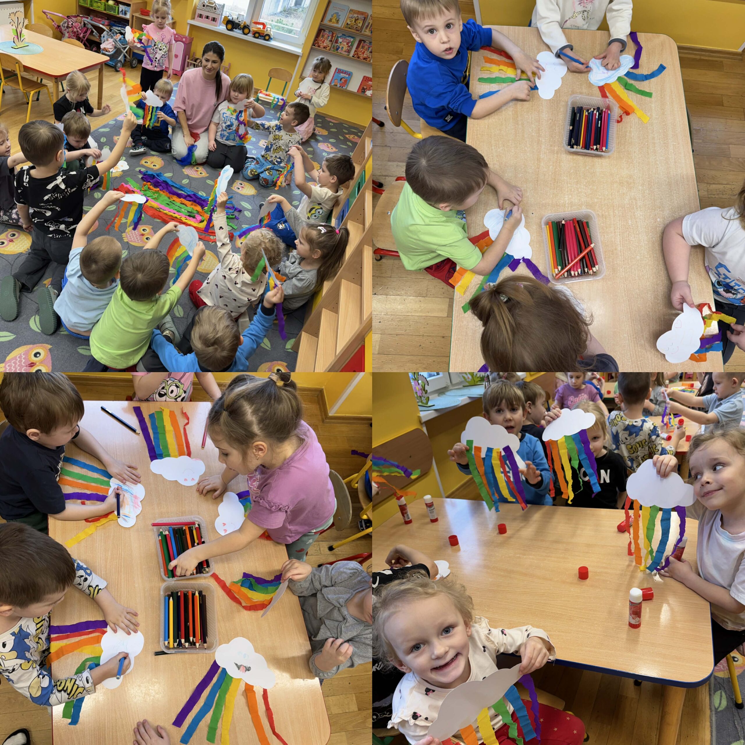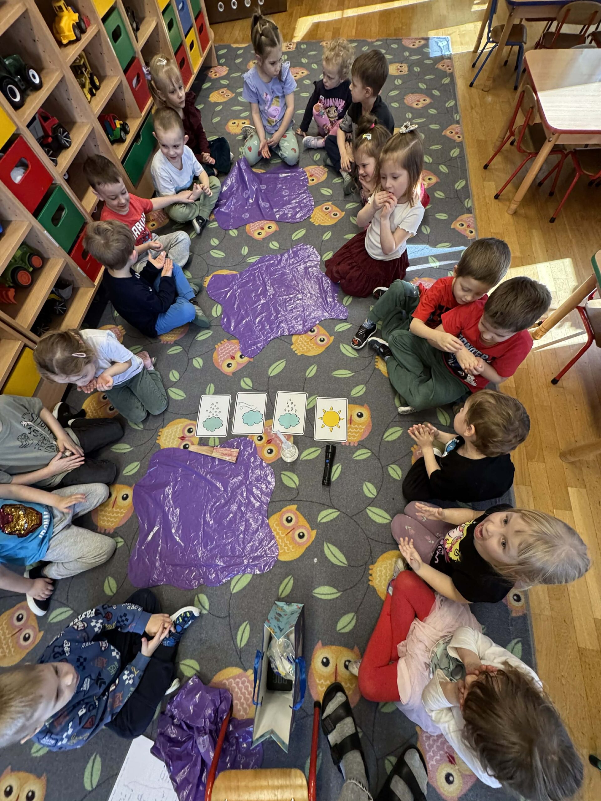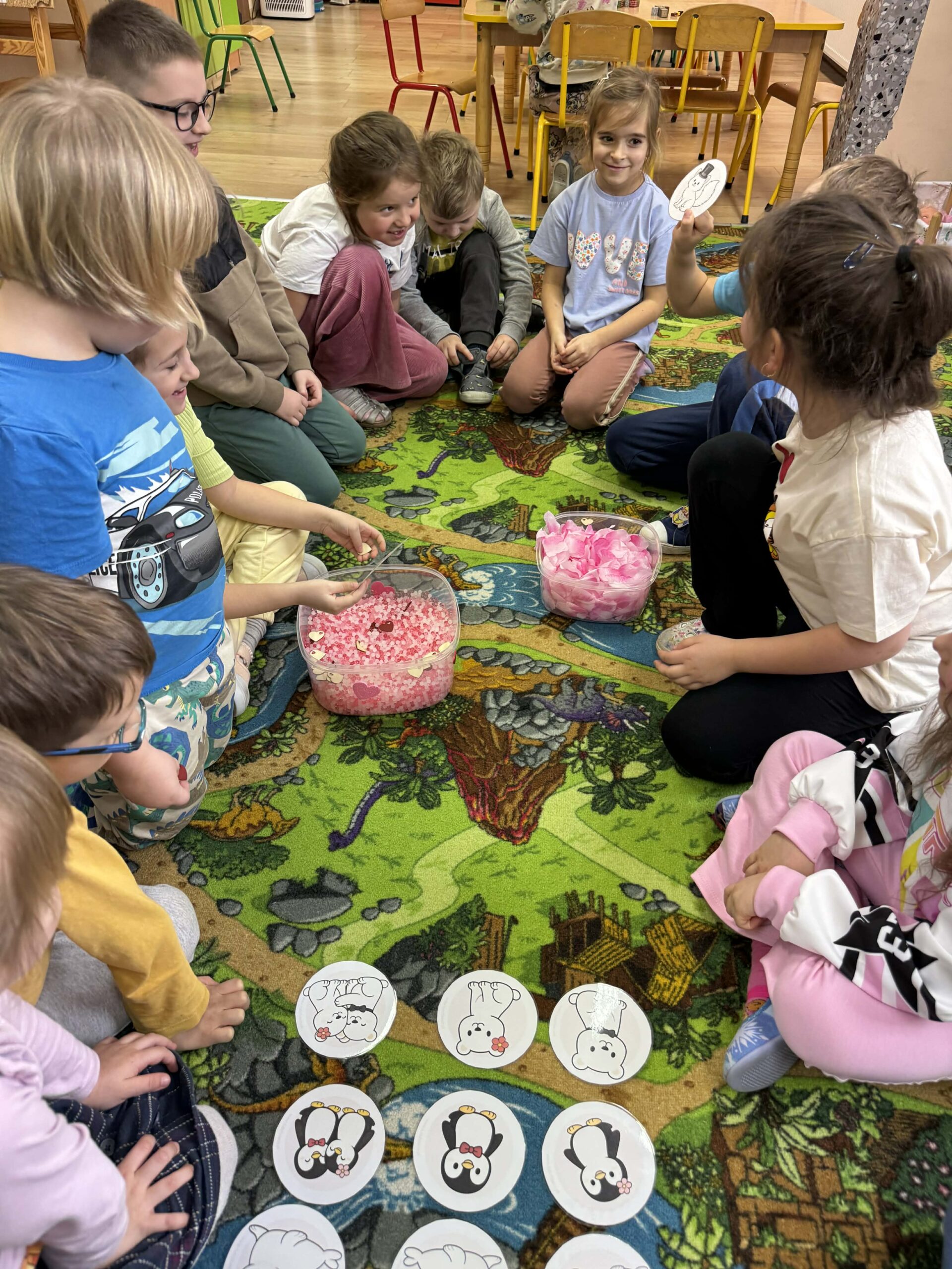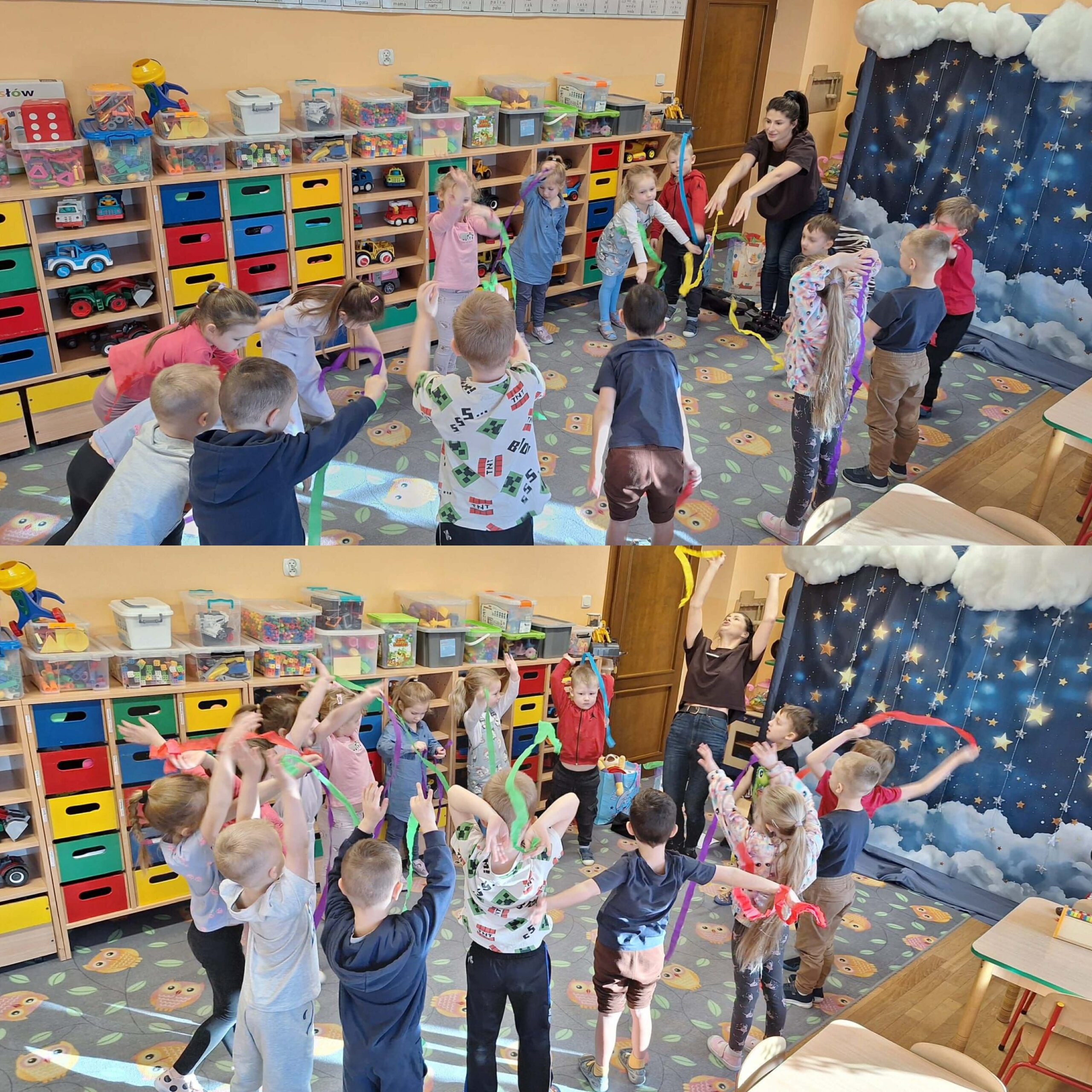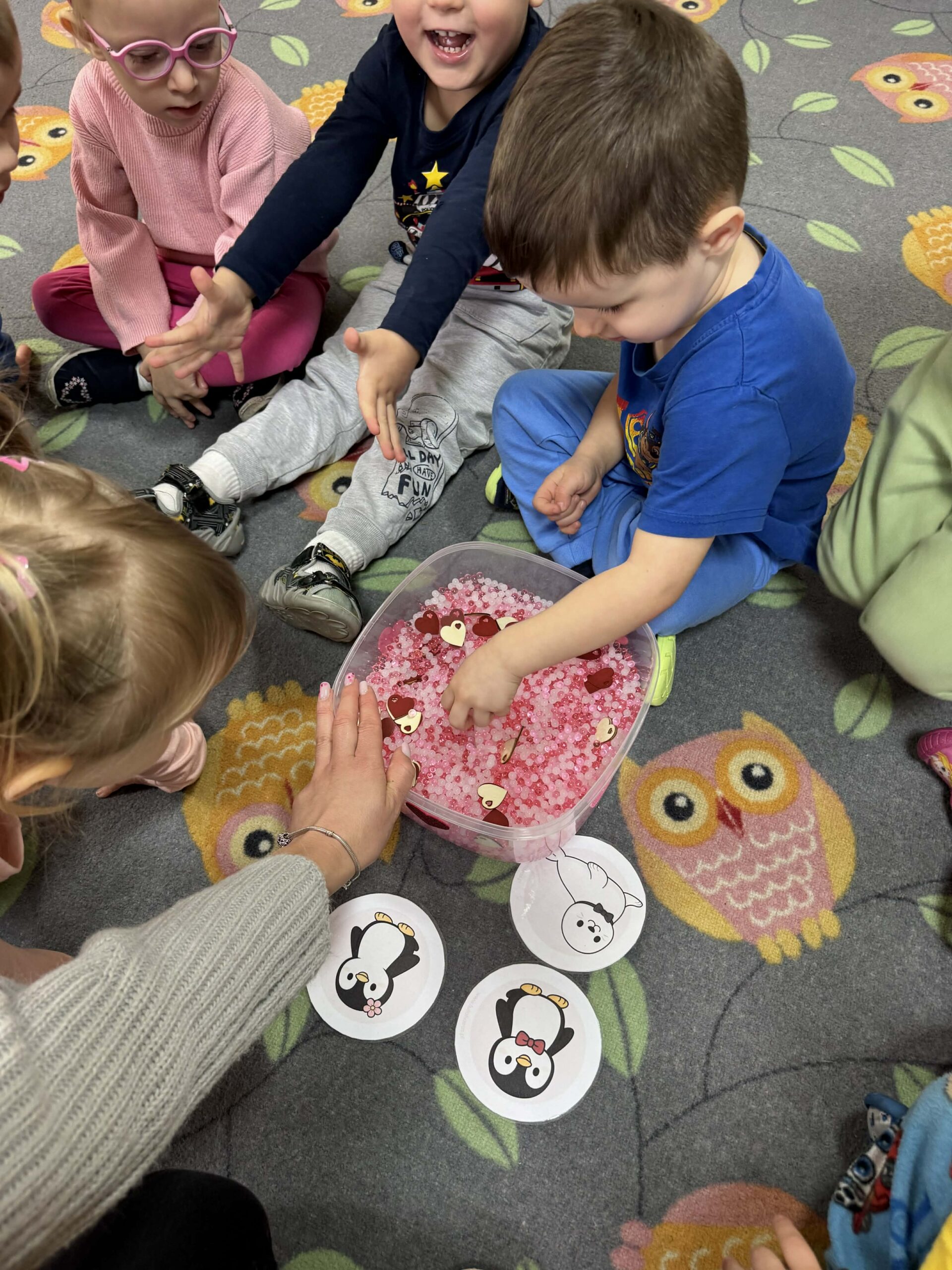 W okresie od grudnia do kwietnia w naszym przedszkolu odbywały się różnorodne zajęcia z języka angielskiego, dostosowane do wieku i możliwości dzieci z poszczególnych grup. Zajęcia miały na celu przede wszystkim naukę poprzez zabawę – łączyły elementy edukacyjne z radością odkrywania i aktywnym uczestnictwem dzieci. W trakcie spotkań wykorzystywaliśmy różnorodne formy pracy, w tym elementy sensoryczne, które uatrakcyjniały zajęcia i angażowały dzieci. Przedszkolaki miały okazję eksperymentować m.in. ze sztucznym śniegiem, kulkami hydrożelowymi, a także korzystać z latarek do prześwietlania różnych przedmiotów. Podczas zajęć nie zabrakło muzyki – dzieci chętnie uczyły się języka poprzez liczne piosenki oraz rymowanki tematyczne. Każde spotkanie było okazją do nauki, wspólnej zabawy oraz budowania pozytywnych relacji w grupie. Zajęcia z języka angielskiego odbywały się również na świeżym powietrzu. Wykorzystując pierwsze promienie słoneczne, przeprowadziliśmy zajęcia w tematyce pogody w naszym pięknym parku, co było dla dzieci dodatkową atrakcją i okazją do nauki w naturalnym otoczeniu.