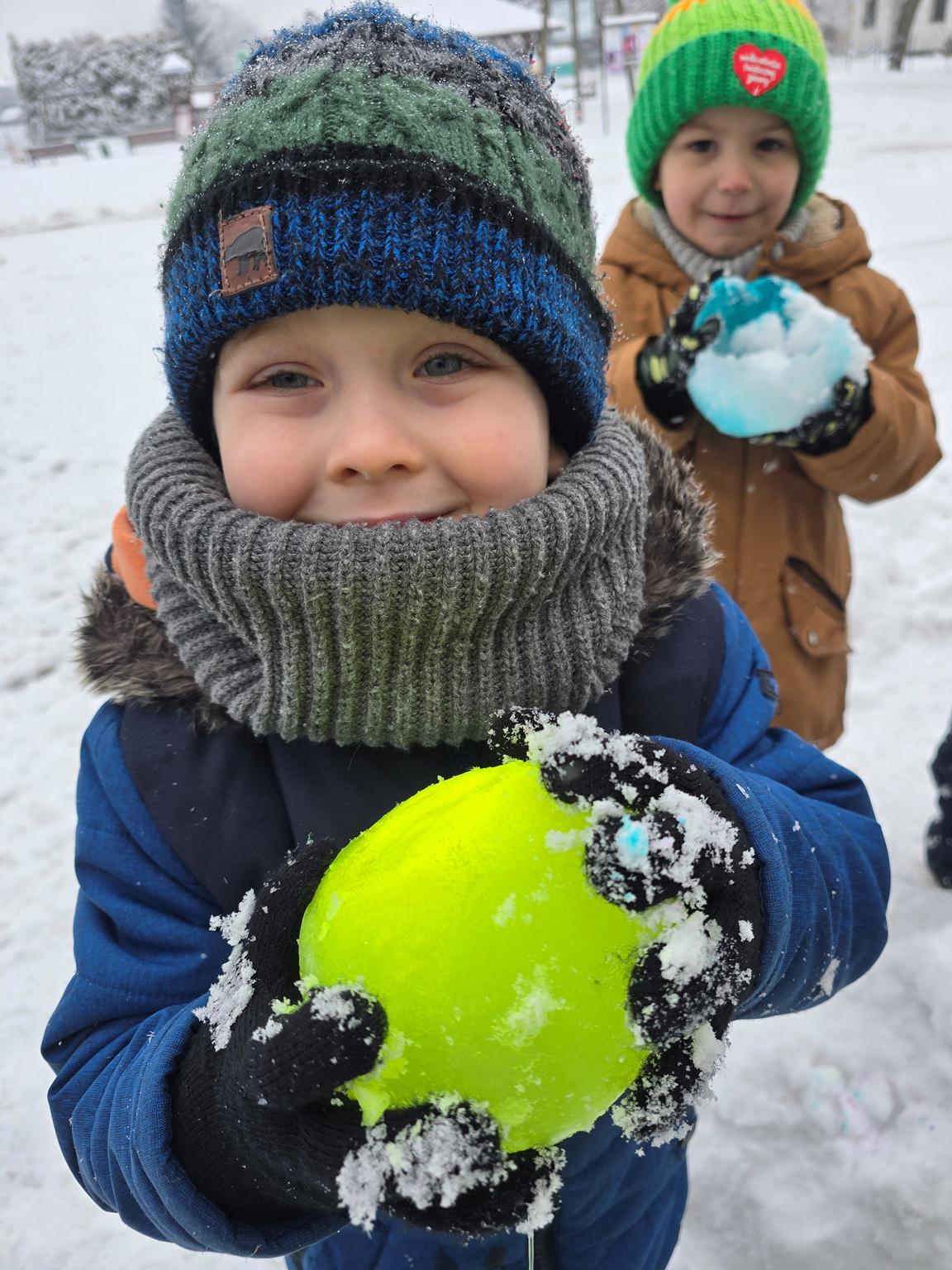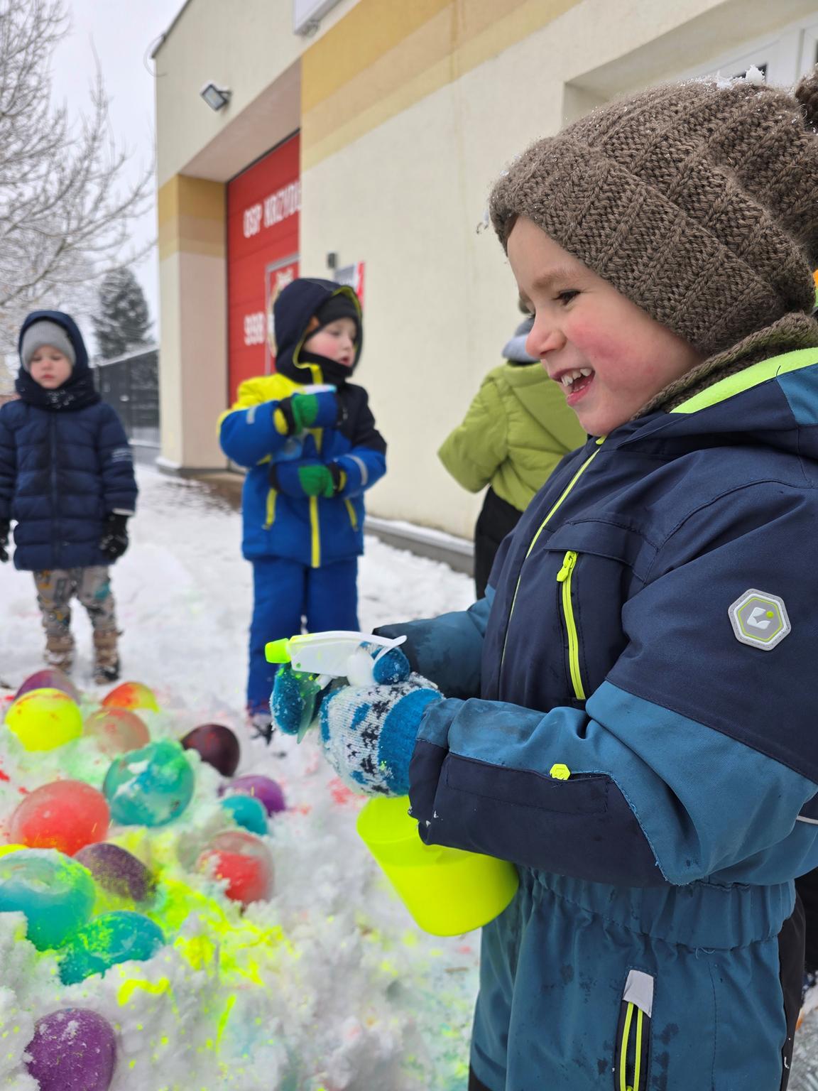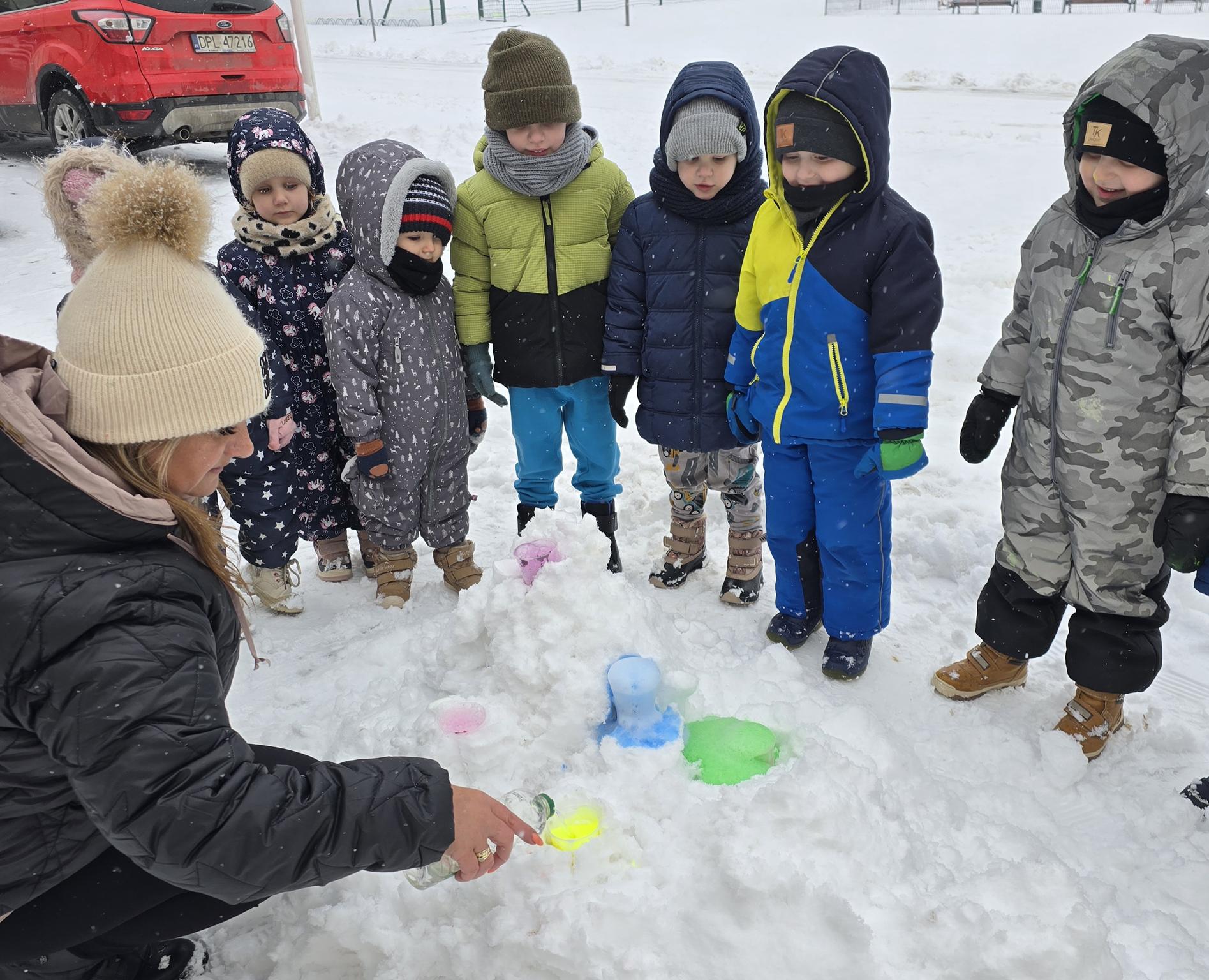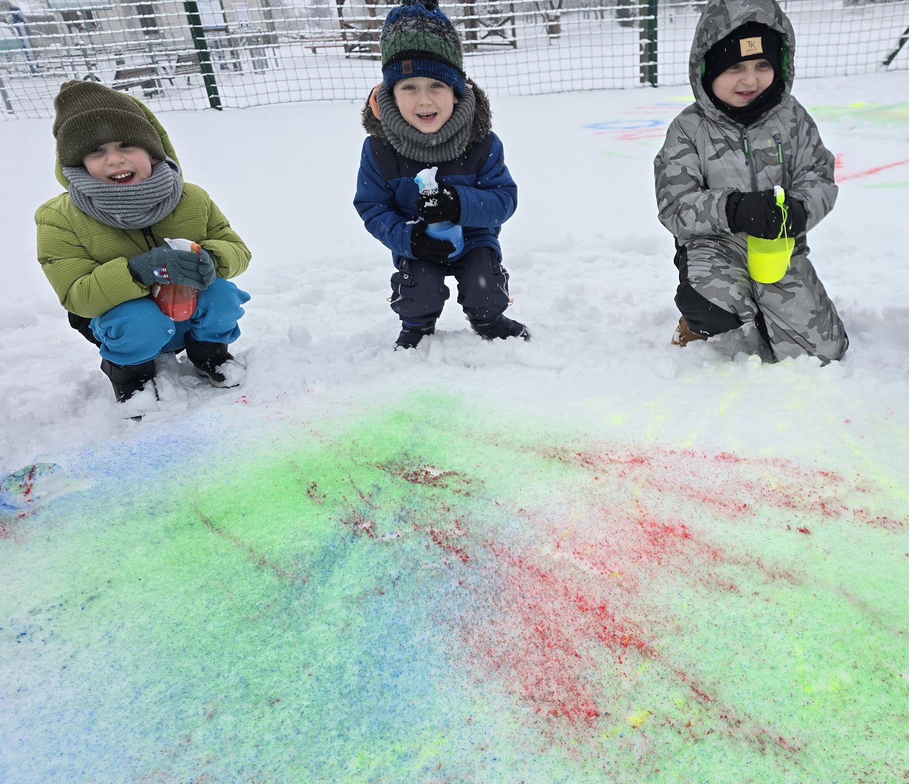 Podczas wspólnych zabaw dzieci lepiły śnieżne kule, tworzyły małe konstrukcje oraz zostawiały na śniegu swoje ślady. Najwięcej emocji wzbudziło malowanie śniegu kolorową wodą – przedszkolaki z ogromnym zaangażowaniem tworzyły barwne wzory i zimowe obrazy. Celem głównym było rozwijanie aktywności ruchowej oraz ciekawości poznawczej dzieci poprzez bezpośrednie doświadczanie zjawisk przyrodniczych i twórcze zabawy w naturalnym środowisku zimowym.