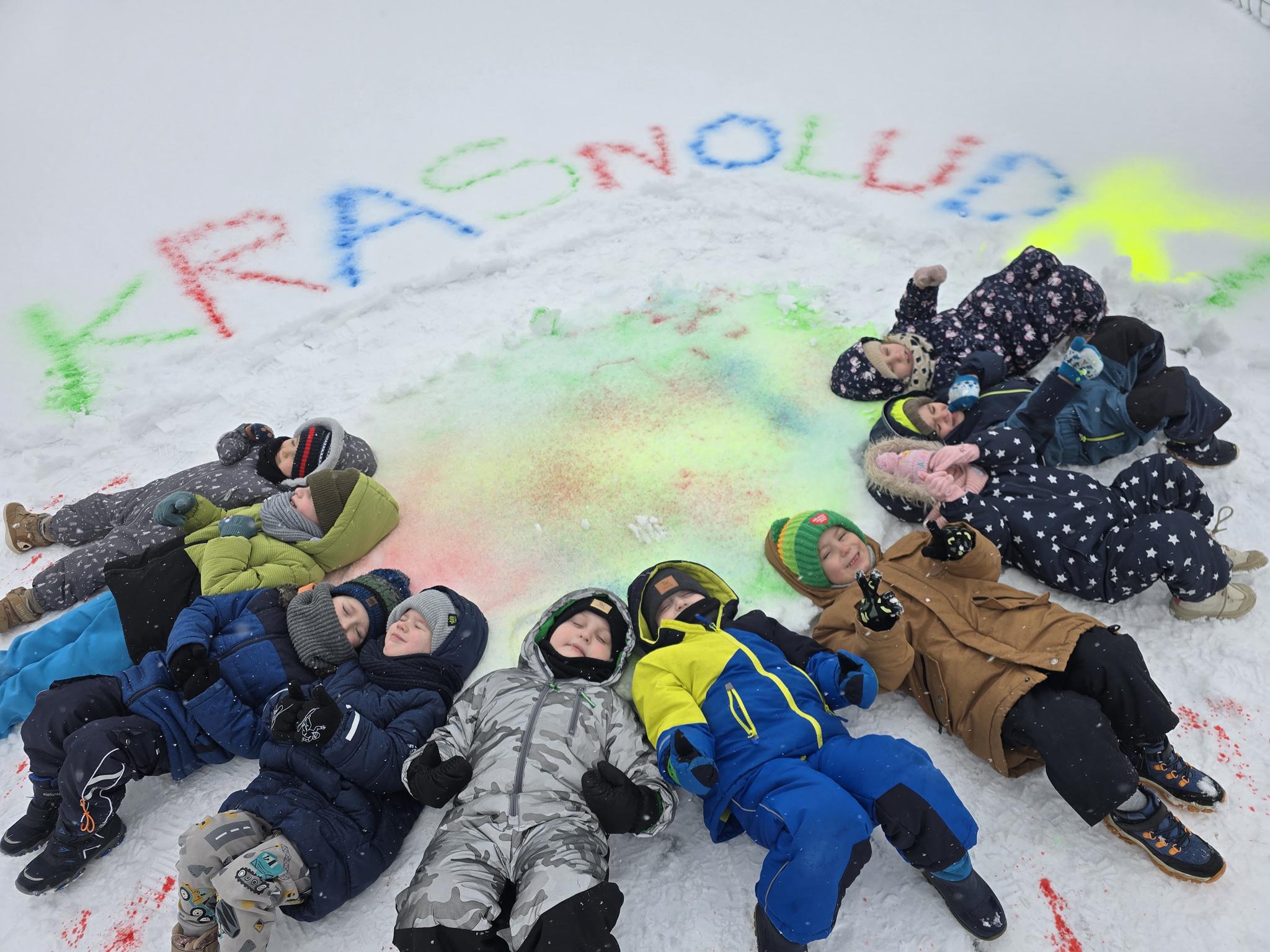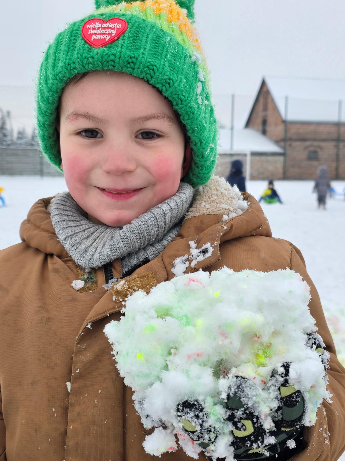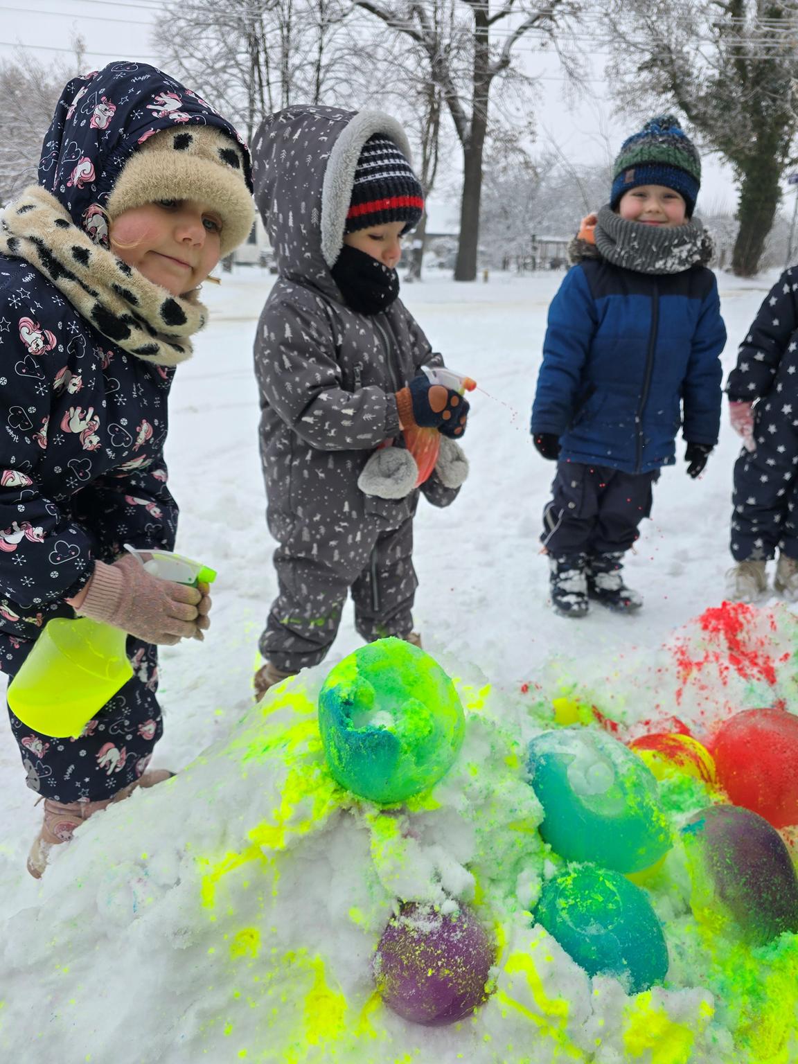 Podczas wspólnych zabaw dzieci lepiły śnieżne kule, tworzyły małe konstrukcje oraz zostawiały na śniegu swoje ślady. Najwięcej emocji wzbudziło malowanie śniegu kolorową wodą – przedszkolaki z ogromnym zaangażowaniem tworzyły barwne wzory i zimowe obrazy. Celem głównym było rozwijanie aktywności ruchowej oraz ciekawości poznawczej dzieci poprzez bezpośrednie doświadczanie zjawisk przyrodniczych i twórcze zabawy w naturalnym środowisku zimowym.