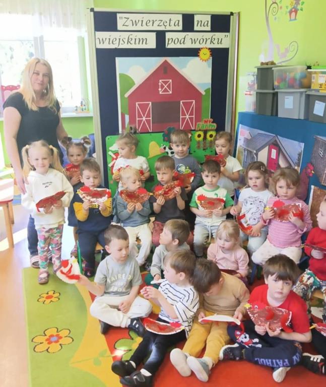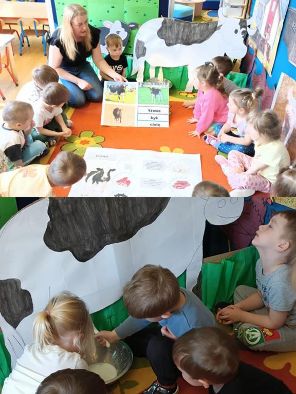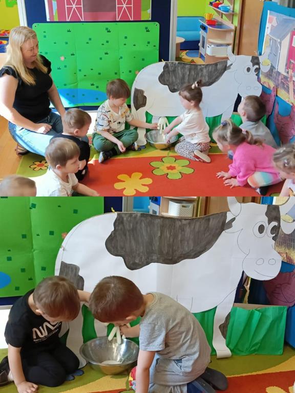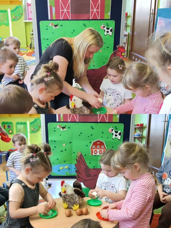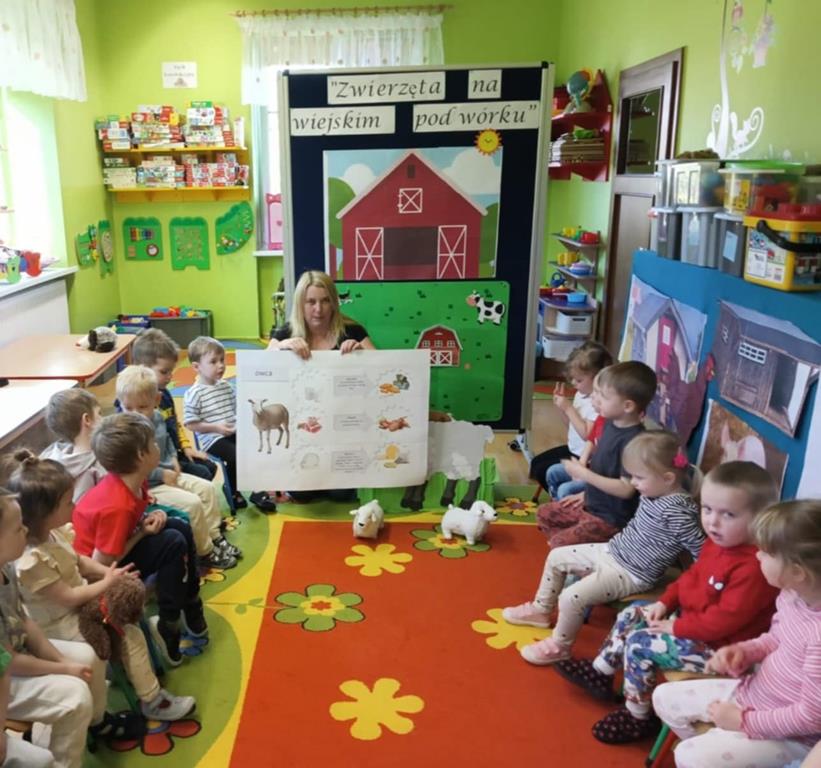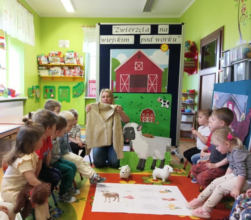 Przedszkolaki z grupy „Żuczki” przeniosły się na wiejskie podwórko, aby poznać bliżej jego mieszkańców i codzienne życie na wsi. Dzieci z zainteresowaniem uczyły się rozpoznawać zwierzęta gospodarskie tj. krowy, kury, świnie i owce. Podczas zajęć dowiedziały się, co dają nam zwierzęta, gdzie mieszkają i jak nazywa się ich rodzina. Miały okazję wydoić krówkę, obierać jajka oraz konsumować produkty tj. twarożek, wędlinkę, jajka. Zajęcia były doskonałą okazją do wzbogacania słownictwa, rozwijania wyobraźni oraz poznawania świata przyrody. Radości i śmiechu było co niemiara.